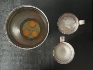 Jag börjar med att väga upp allt. Jag blandar ägg och socker i en bunke och de övriga torra ingredienserna i en skål. Sen vispar jag ägg och socker vitt och pösigt