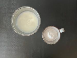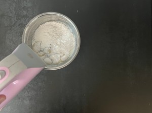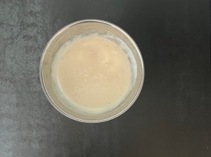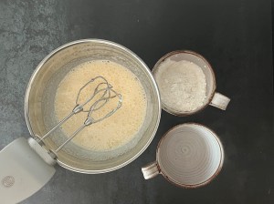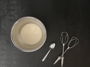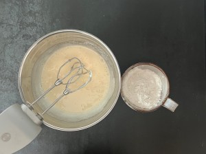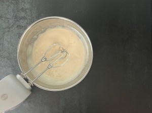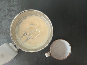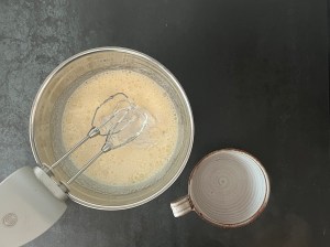 Värmer vatten, tillsätter mjölmixen i äggsmeten och vispar samman på låg hastighet. Sen tillsätter jag vattnet och vispar samman även det, på låg hastighet.