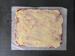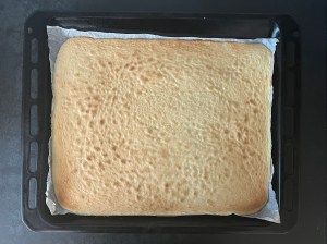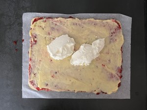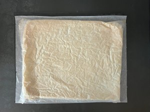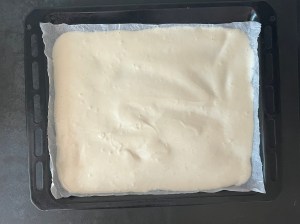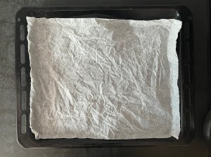 Jag klär en plåt med ett bakplåtspapper och fördelar smeten i plåten. Bakar sedan av i förvärmd ugn.