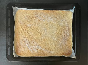 När kakan kommer ur ugnen så strör jag socker på ovansidan, lägger ett bakplåtspapper ovanpå, tar en plåt och lägger överst, sen vänder jag på alltihop. Drar av pappret som nu ligger uppåt och för kakan på pappret, upp på ett galler, så att den kan svalna.