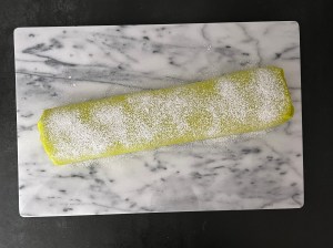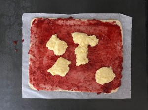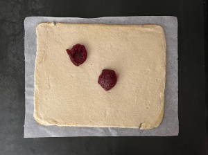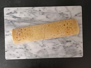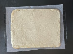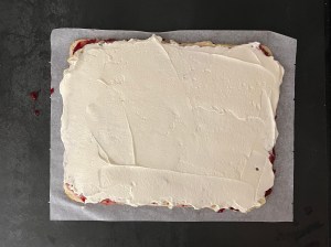 När kakan svalnat vispar jag grädde, ganska hårt så att kakan håller samman när man rullar den. Sen breder jag ett tunt lager hallonsylt över hela kakan, sen fördelar jag vaniljkrämen och breder den till ett jämnt lager, max 0,5cm högt. Efter det stryker jag lika mycket grädde över vaniljkrämen.