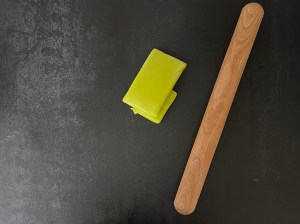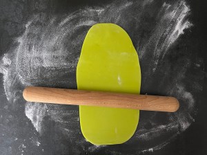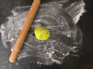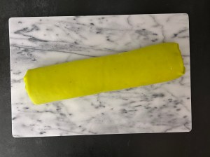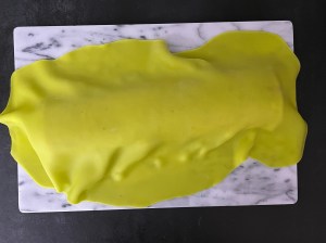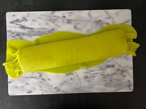Sen rullar jag samman den och lägger på ett fat eller en plåt lång nog. Kavlar marsipanen och klär den i den, skär bort överflödig marsipanen. Är marsipanen ren utan grädde och kladd så går den fint att spara till nästa bak.