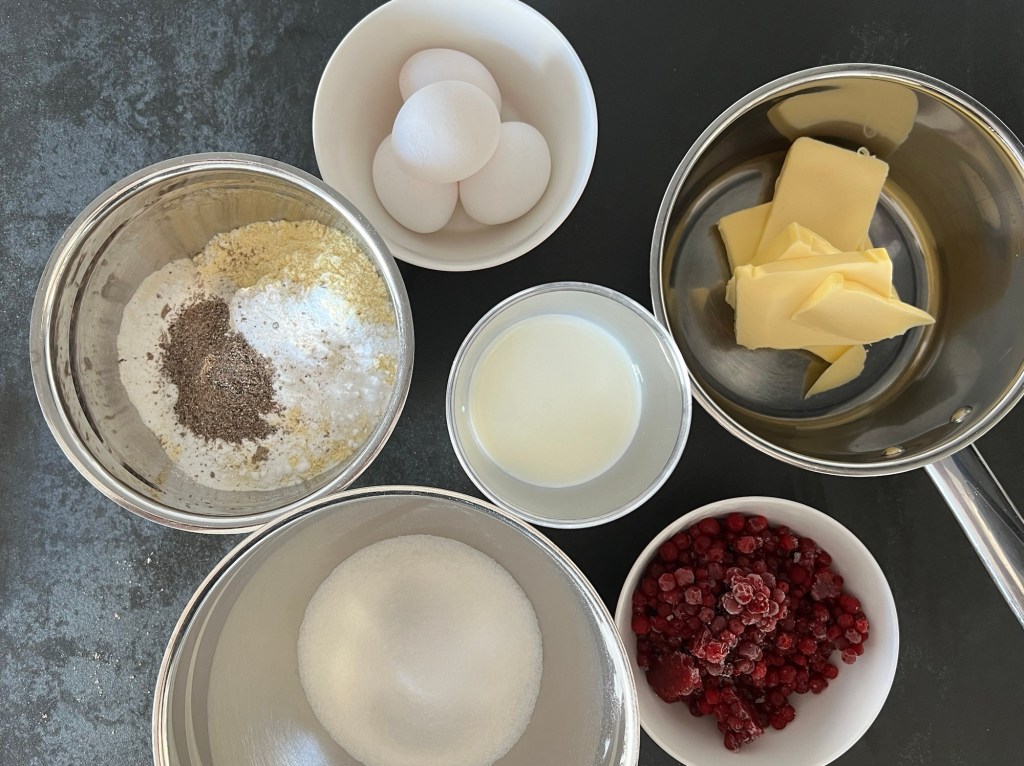 Klassiskt så börjar jag med att väga upp allt. Blandar ägg och socker i en bunke, mixar/mortlar kardemumman och blandar alla torra ingredienser, sätter tillbaka lingonen i frysen till senare och smälter smöret.