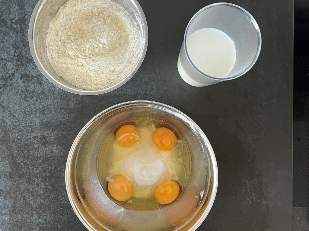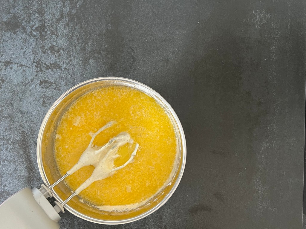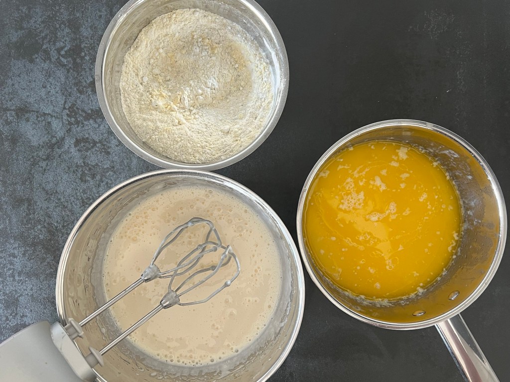 Vispar socker och ägg vitt och pösigt, tillsätter mjölken i det smälta smöret. Vispar sedan, på låg hastighet ner de torra ingredienserna i äggsmeten. Efter det tillsätter jag smörmjölken och vispar på låg hastighet till en jämn smet.