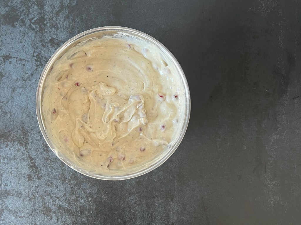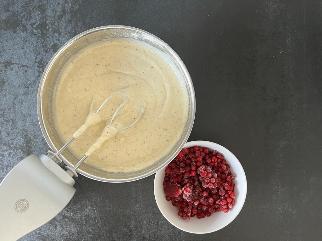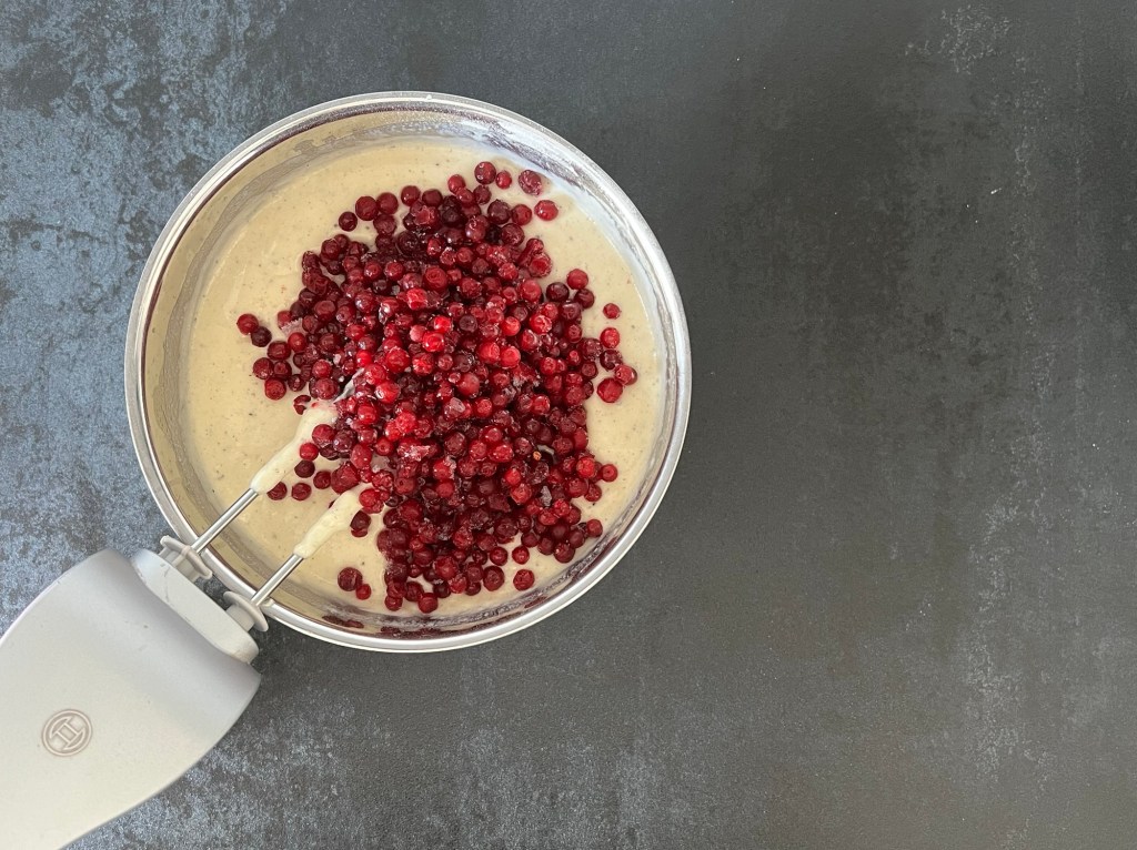 Tar sen fram lingon ur frysen och vispar med även dem på låg hastighet, vill inte att lingonen går sönder utan bara att de blandas väl i smeten.