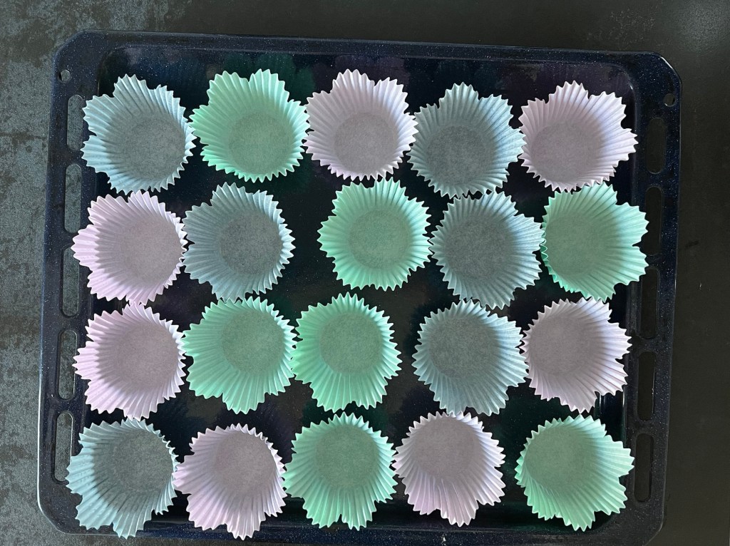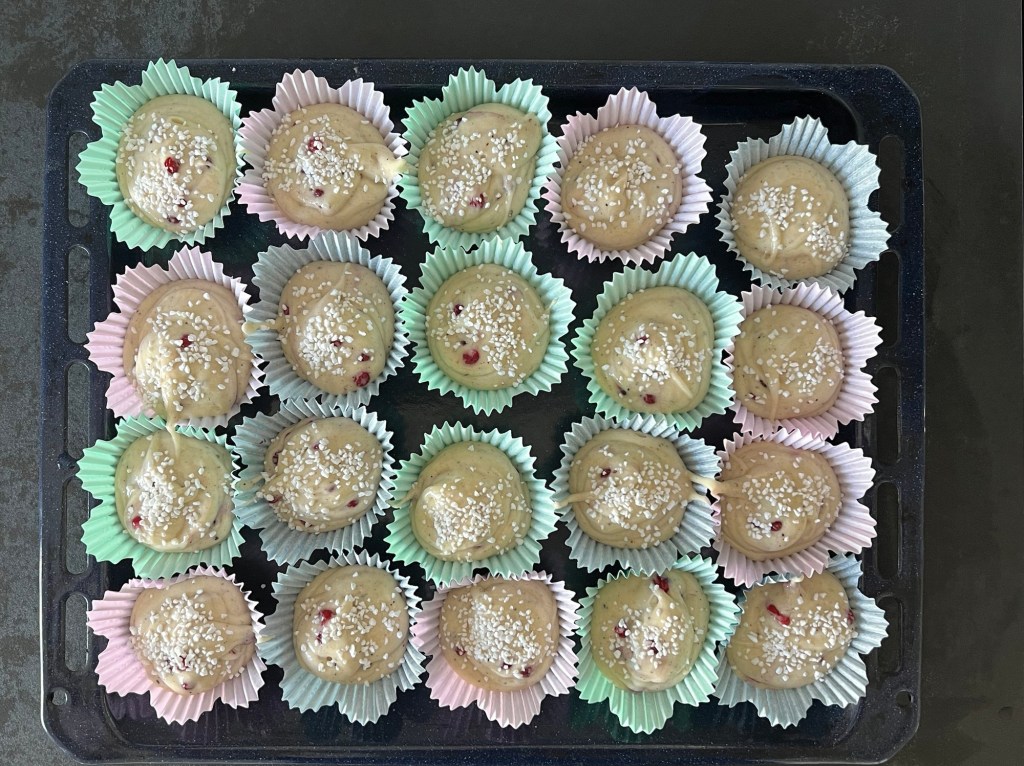 Fördelar 20st stora muffinsformar på en plåt och fördelar smeten i formarna, jag föredrar att använda en spritspåse till smeten, men man kan klicka också. Strör över pärlsocker och bakar sedan av dem i förvärmd ugn och låter dem sedan svalna på ett galler.