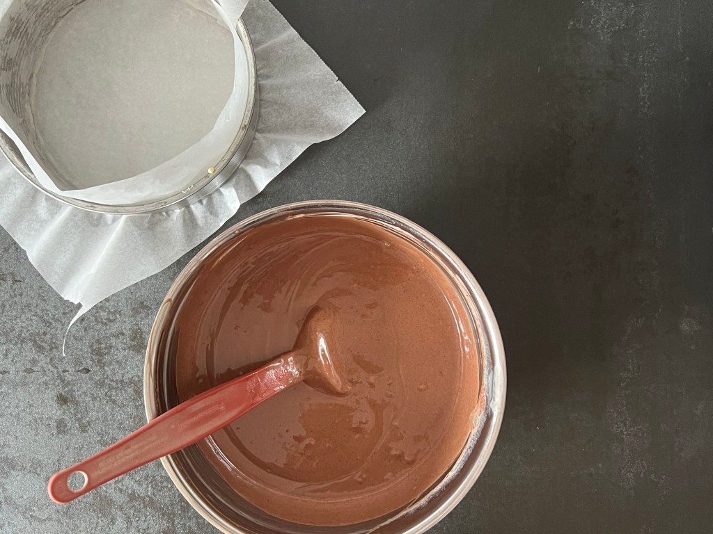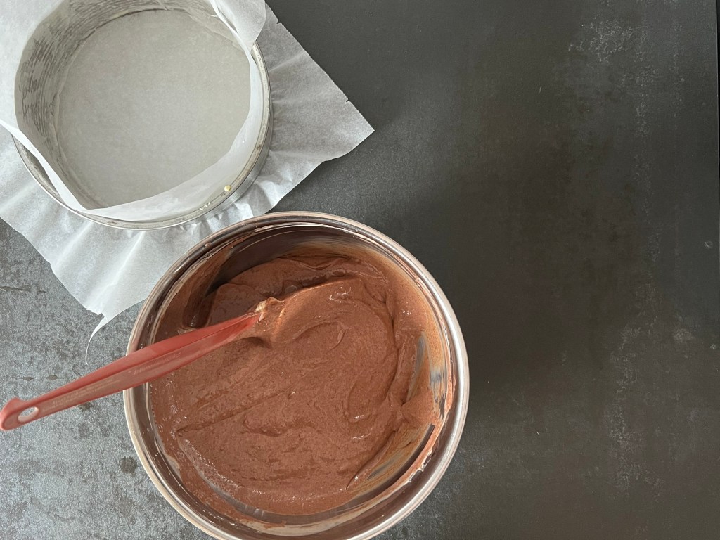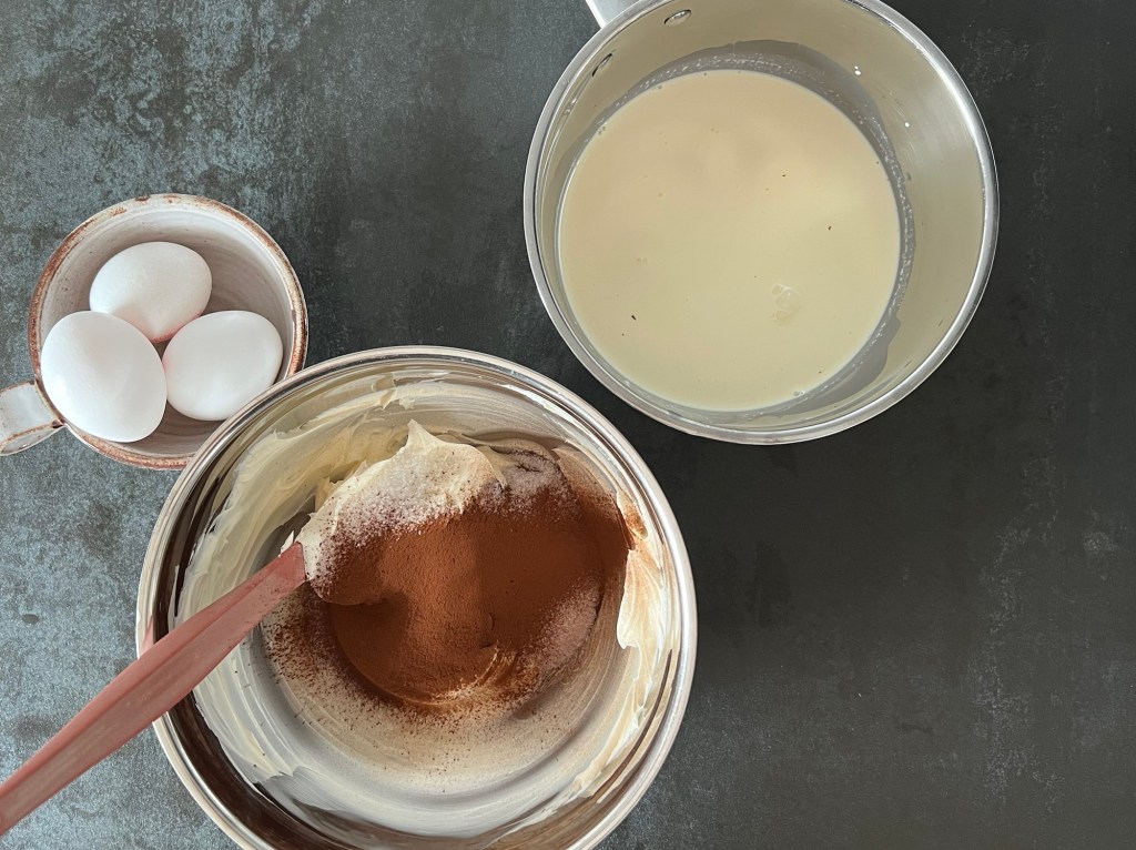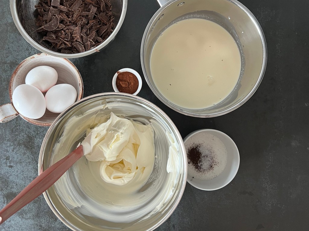 Jag börjar med att starta ugnen, och klär en 18cm springform med bakplåtspapper, sen väger jag upp alla ingredienser. Grädden i en kastrull, kakaon för sig, socker och vanilj tillsammans och äggen i en skål. Chokladen hackar jag grovt och så startar jag ett vattenbad som jag kan smälta chokladen i, efter det rör jag ut färskosten med en slickepott,