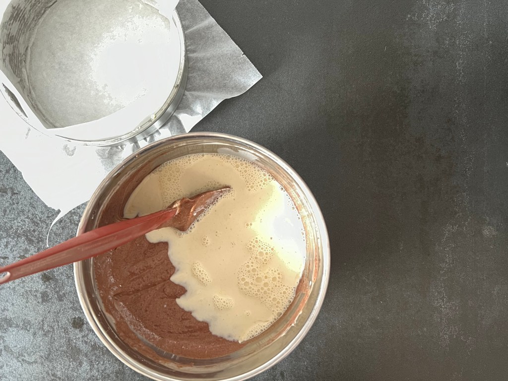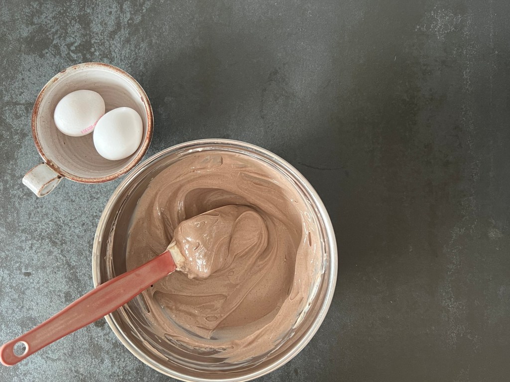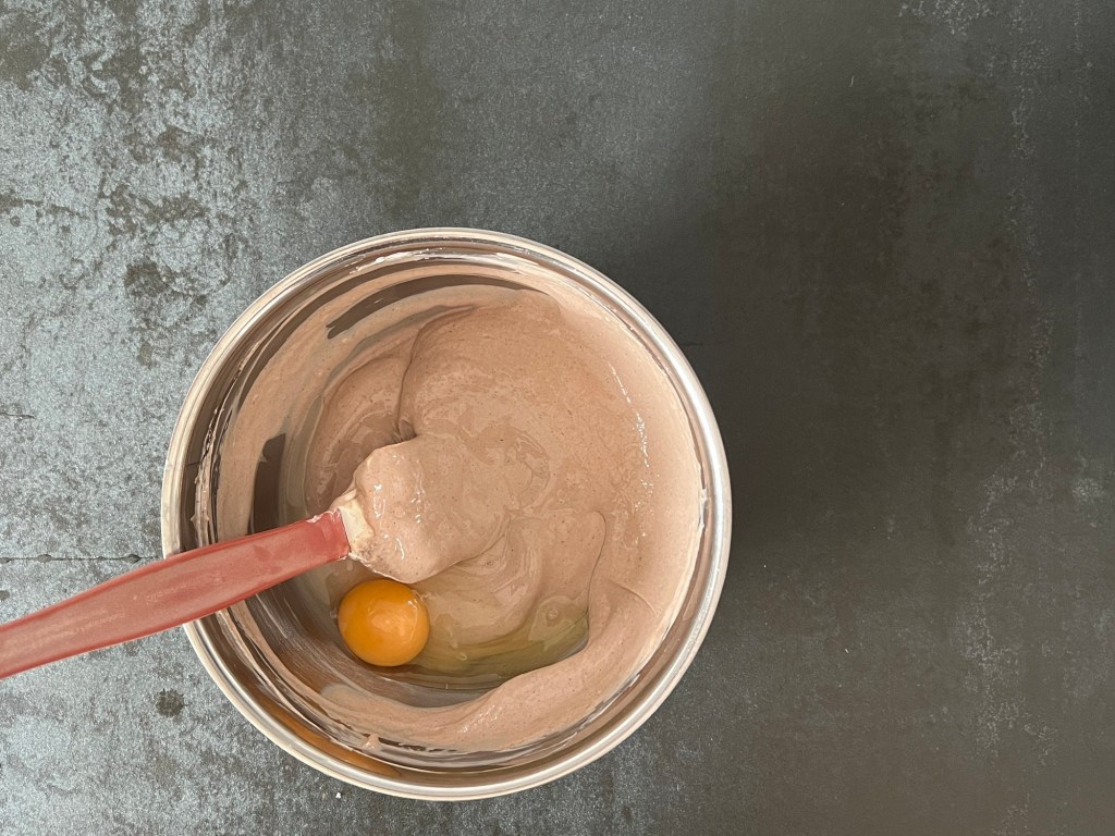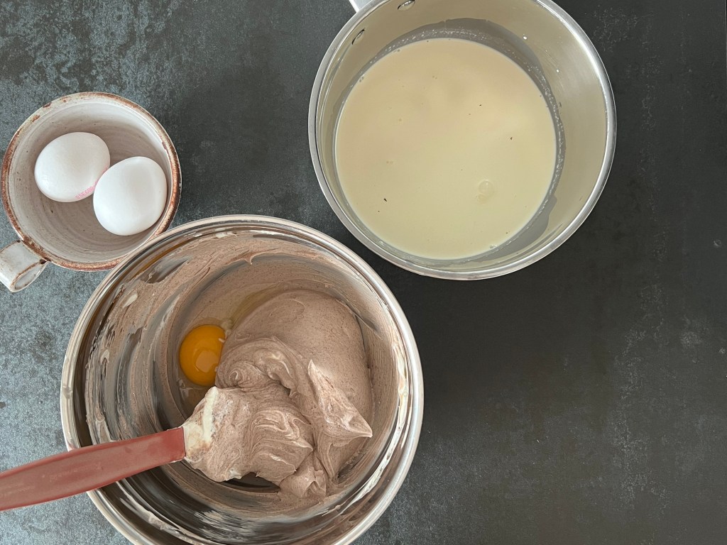 Tillsätter socker och vaniljpulver och siktar i kakaon, sen rör jag det till en jämn smet med slickepotten. Tillsätter sedan ett ägg i taget och rör ut till en jämn smet.