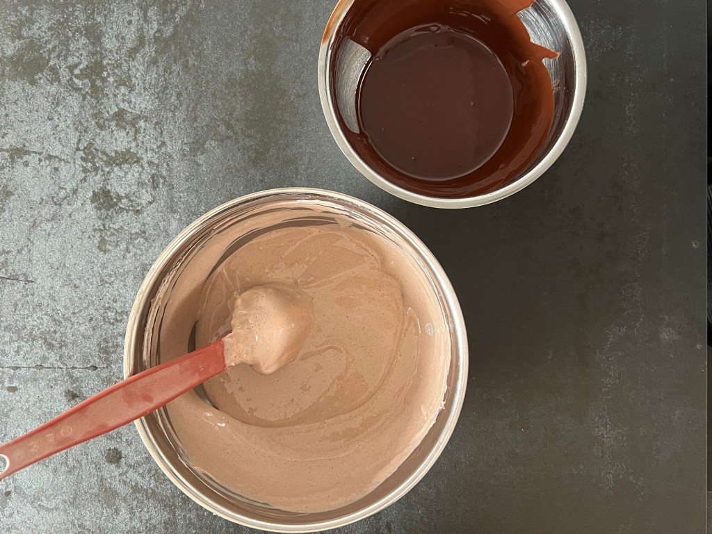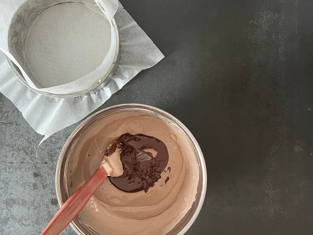 Sen smälter jag chokladen i vattenbad och värmer grädden till ca 55 grader. Rör sedan ned chokladen i färskostsmeten och rör jämnt, sen tillsätter jag dem varma grädden och rör till en jämn smet.