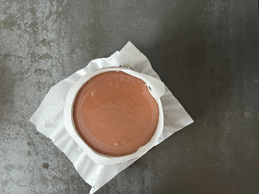 Häller smeten i formen och bakar av i förvärmd ugn. Om man vill och upplever att smeten är lite grynig av choklad som inte smält så kan man sila den genom en finmaskig trådsil. Jag bakar min mitt i ugnen med över och undervärme, 225 grader i ca 40min. Den ska vara vobblig i mitten när man tar ut den.