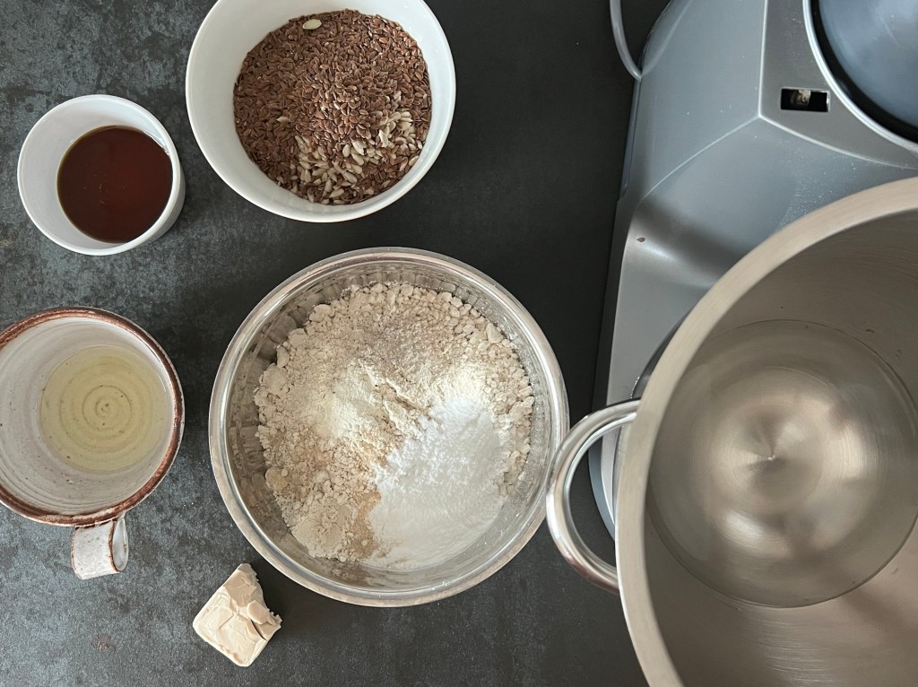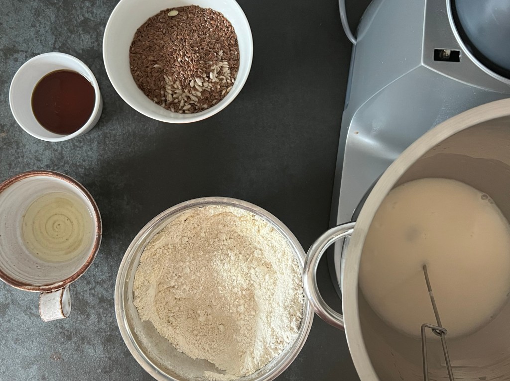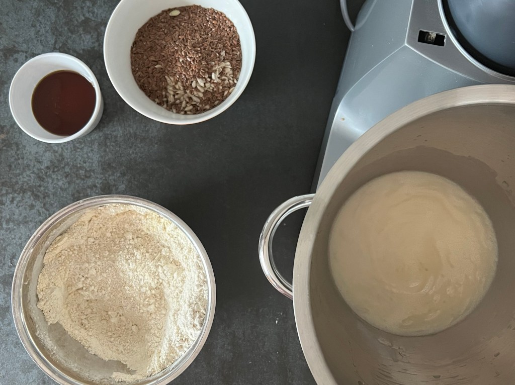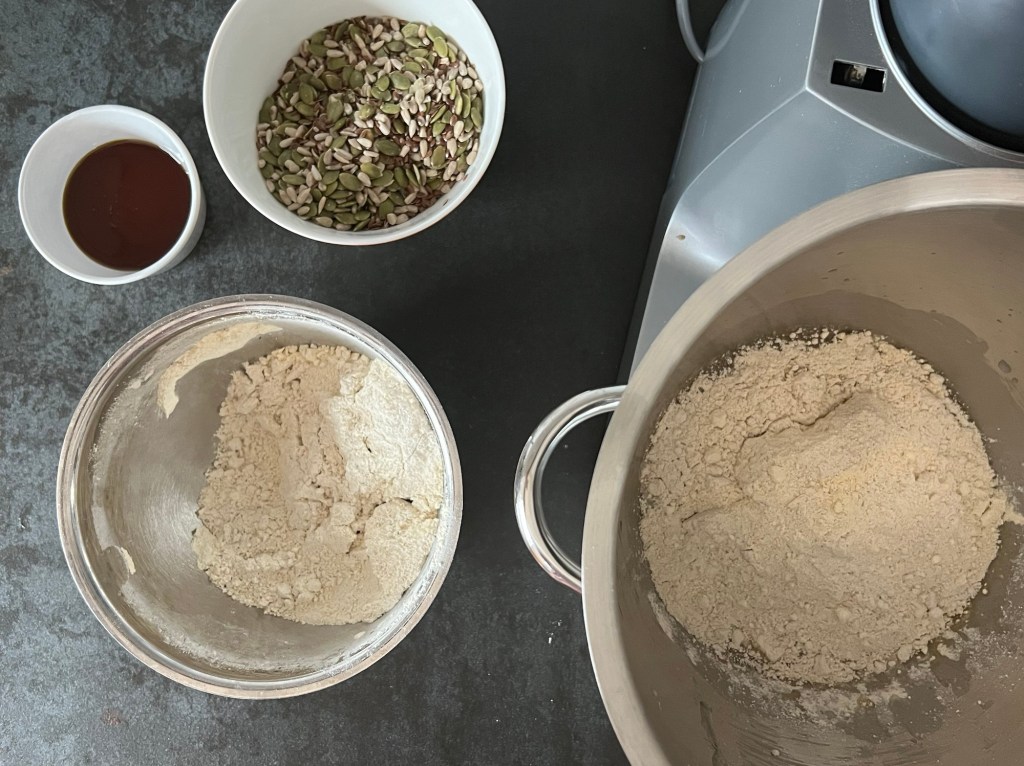 Jag börjar med att väga upp allt. Fröerna blandar jag i en egen skål, men alla andra torra ingredienser blandar jag till en mjölmix. Löser upp jästen i vattnet och tillsätter rapsoljan.