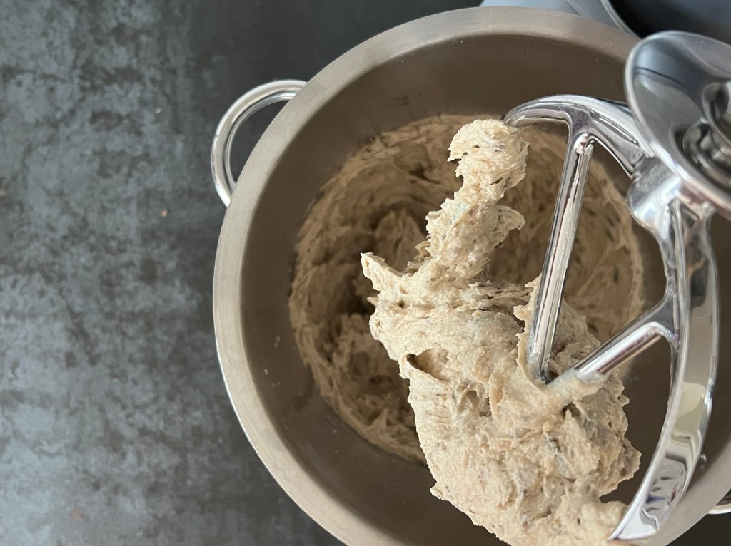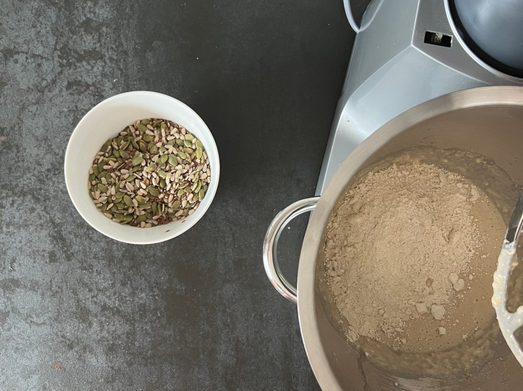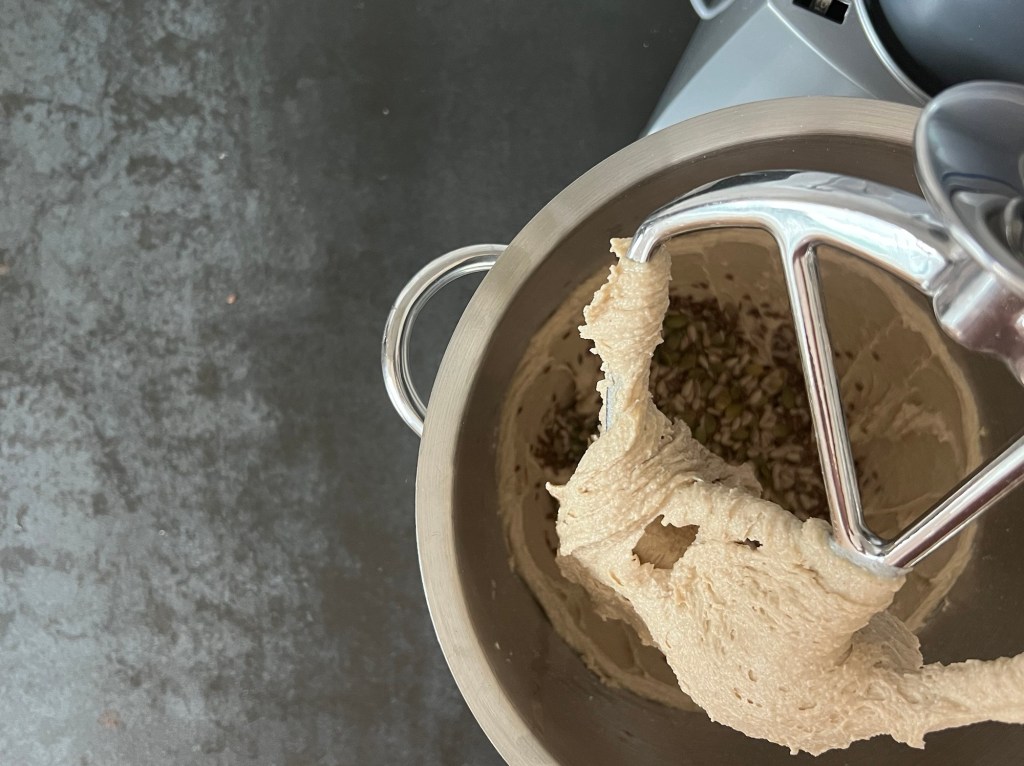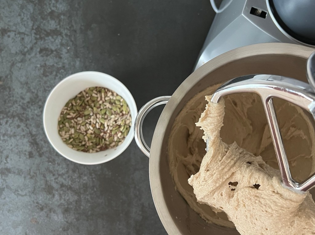 Efter det tillsätter jag hälften av mjölmixen och blandar samman. Sen adderar jag mörk sirap och resten av mjölmixen, blandar på medelhastighet i ca 3min. Sist tillsätter jag fröerna och blandar samman degen.