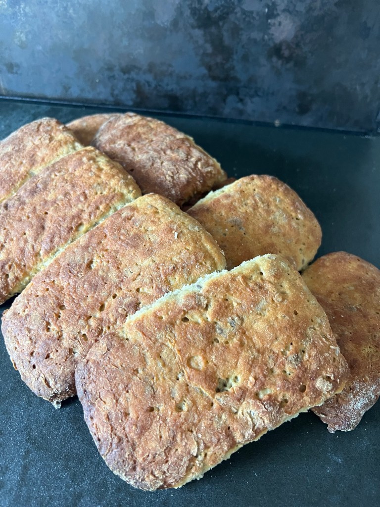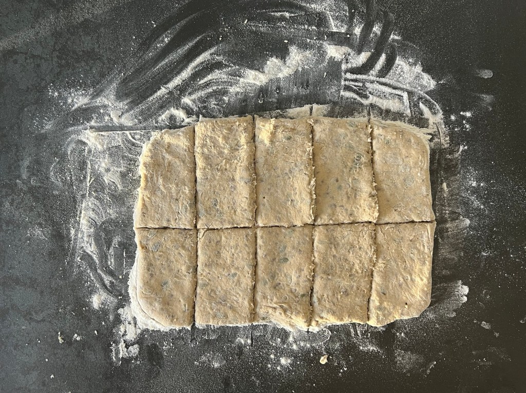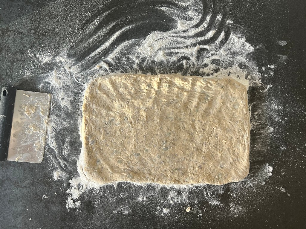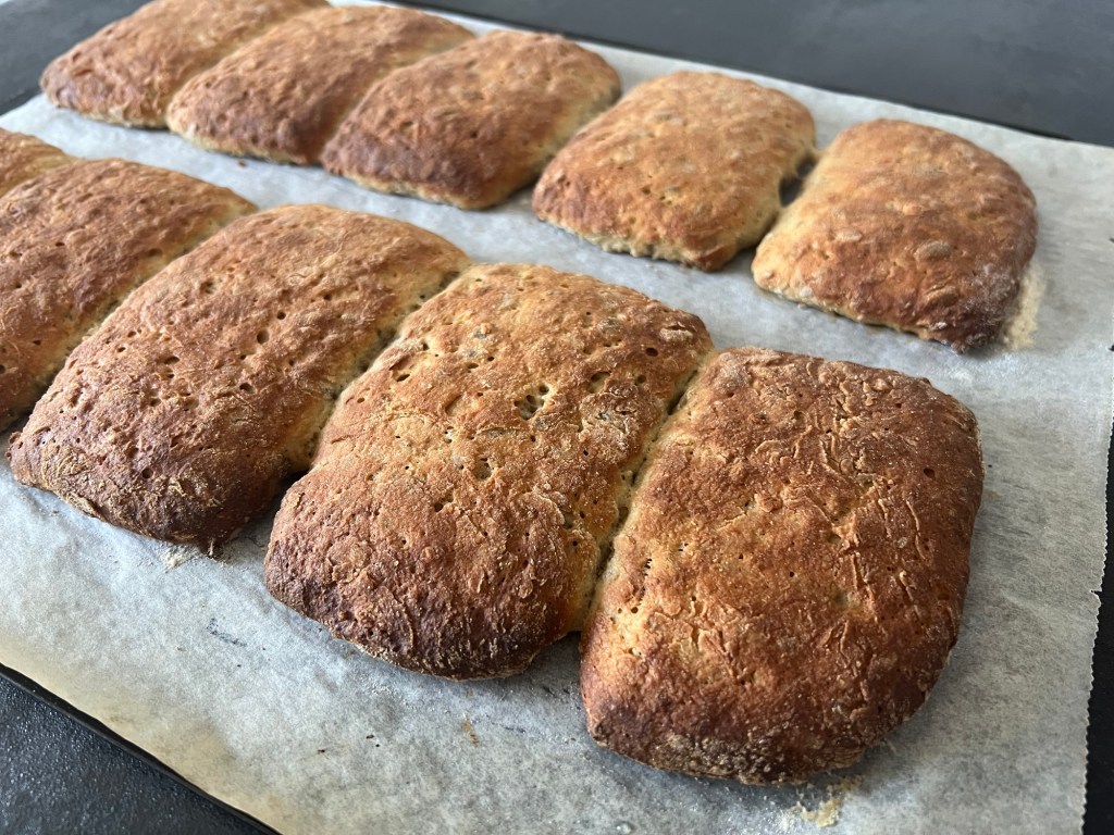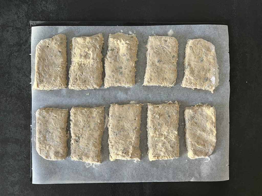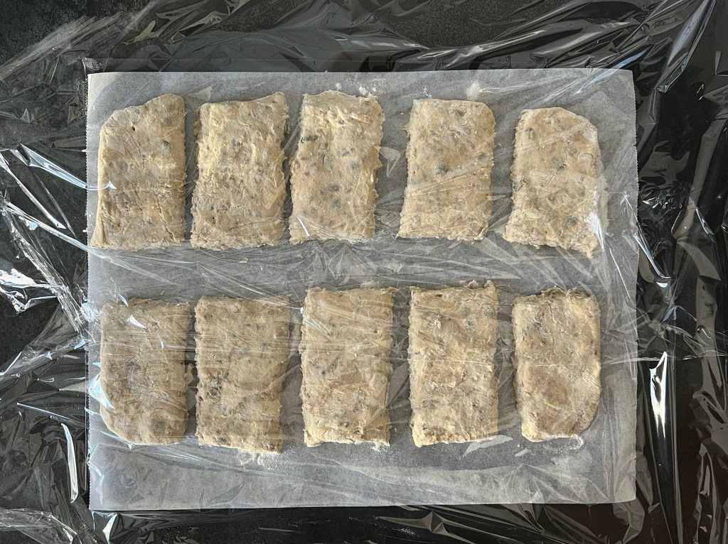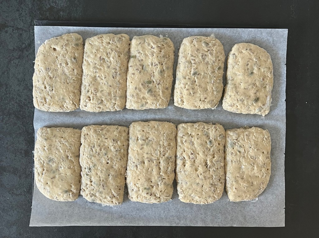 Jag skrapar samman degen och tar upp den på en väl mjölad bänk. Den är lite kladdig, så bolla den med mjöliga händer, knåda och krama inte den. Använd gärna en degskrapa som hjälp, så blir det inte lika kladdigt. Mjöla på bänken och ovanpå degen, platta för hand ut den till en platta, ca 2-3cm hög, 30cm bred och 20cm djup. Dela den 1 gång på längden och 4 snitt på djupet, så du får 10st lika stora bitar. Bitarna ska bli 6x10cm. Flytta dem till en bakplåtspappersklädd plåt. Plasta plåten lätt och låt dem jäsa.