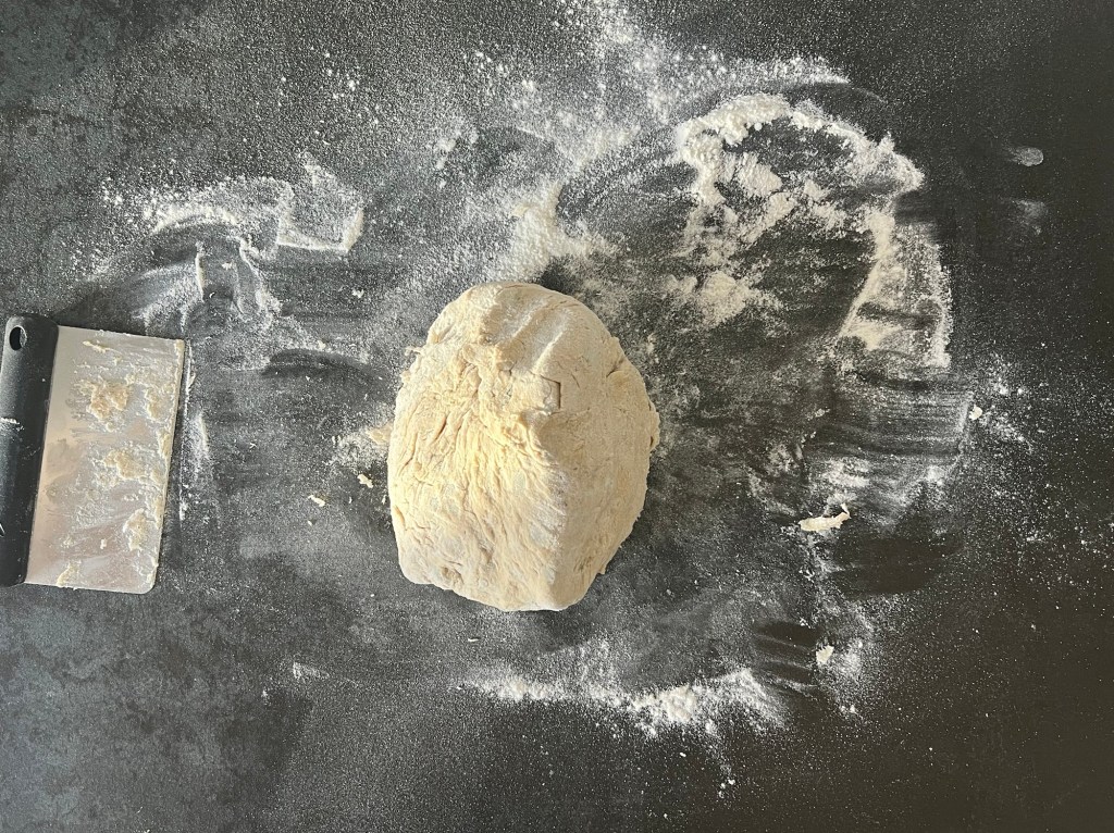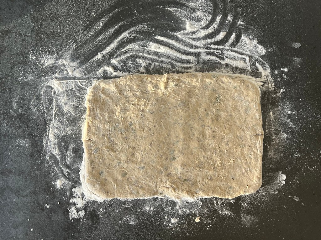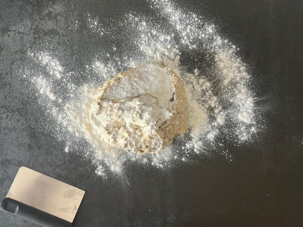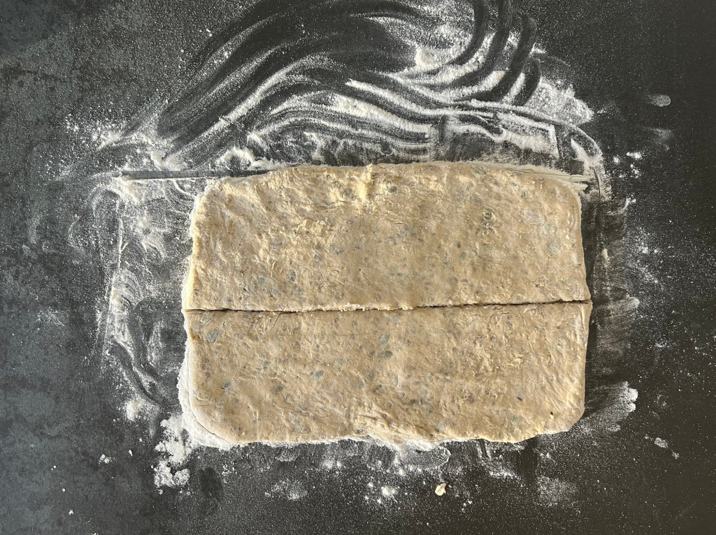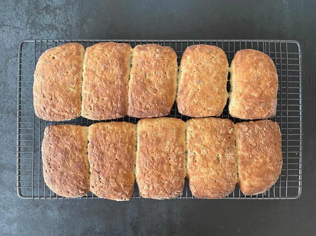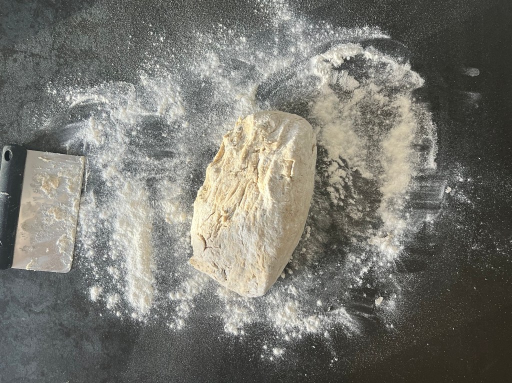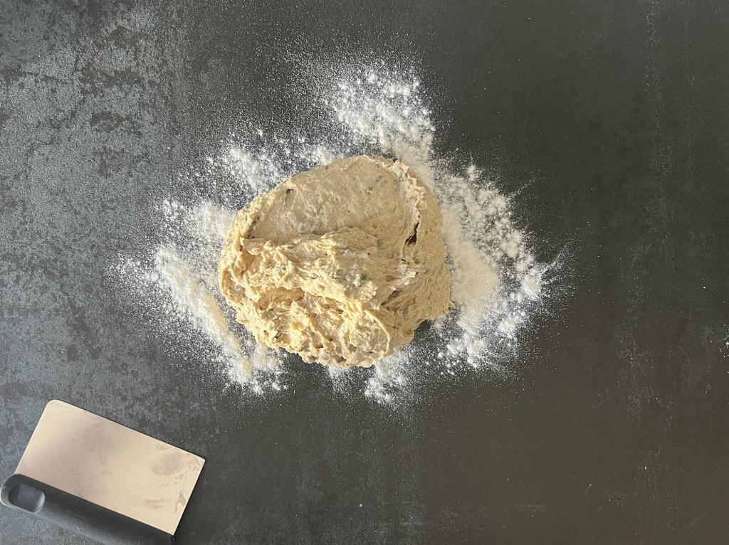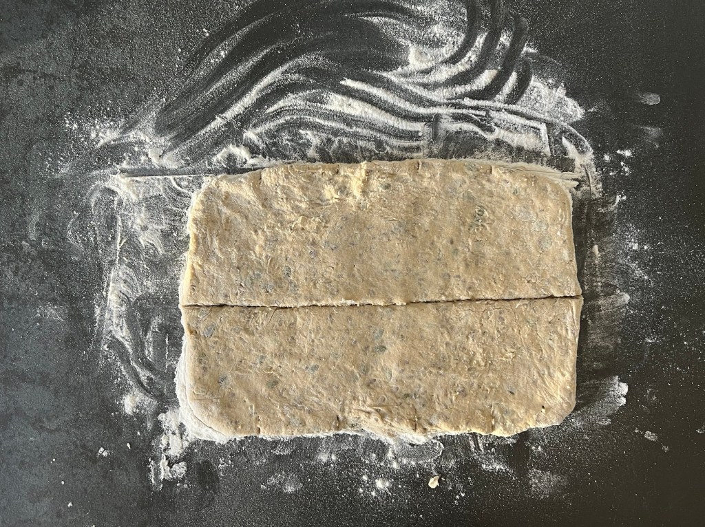 Jag skrapar samman degen och tar upp den på en väl mjölad bänk. Den är lite kladdig, så bolla den med mjöliga händer, knåda och krama inte den. Använd gärna en degskrapa som hjälp, så blir det inte lika kladdigt. Mjöla på bänken och ovanpå degen, platta för hand ut den till en platta, ca 2-3cm hög, 30cm bred och 20cm djup. Dela den 1 gång på längden och 4 snitt på djupet, så du får 10st lika stora bitar. Bitarna ska bli 6x10cm. Flytta dem till en bakplåtspappersklädd plåt. Plasta plåten lätt och låt dem jäsa.