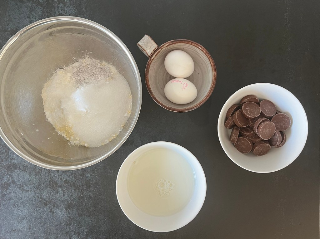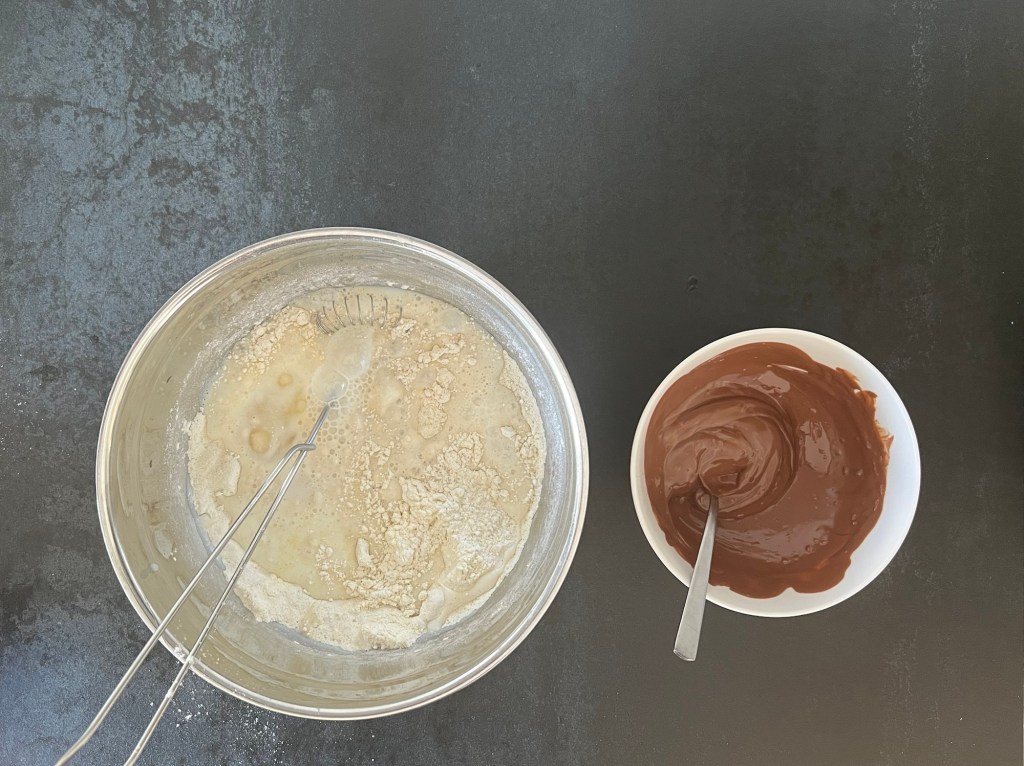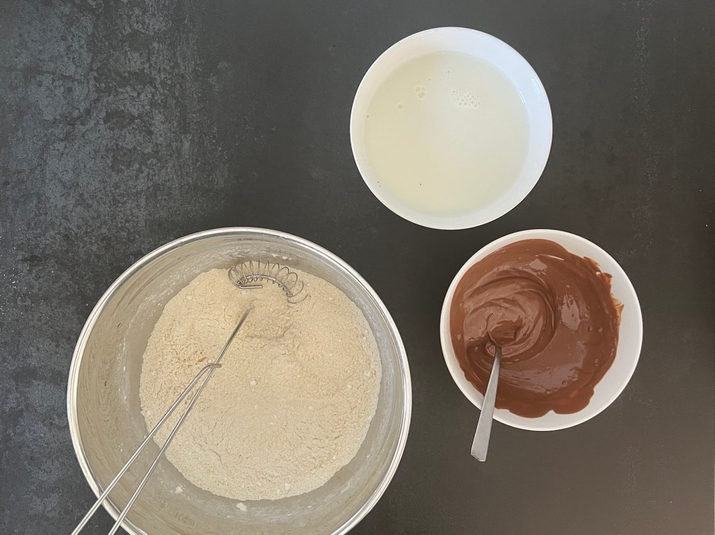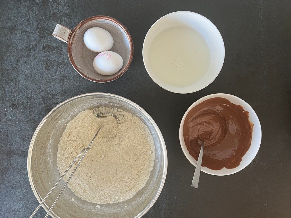 Först väger jag alla ingredienser, blandar de torra i en bunke till en mjölmix, smälter chokladen och knäcker äggen i mjölken