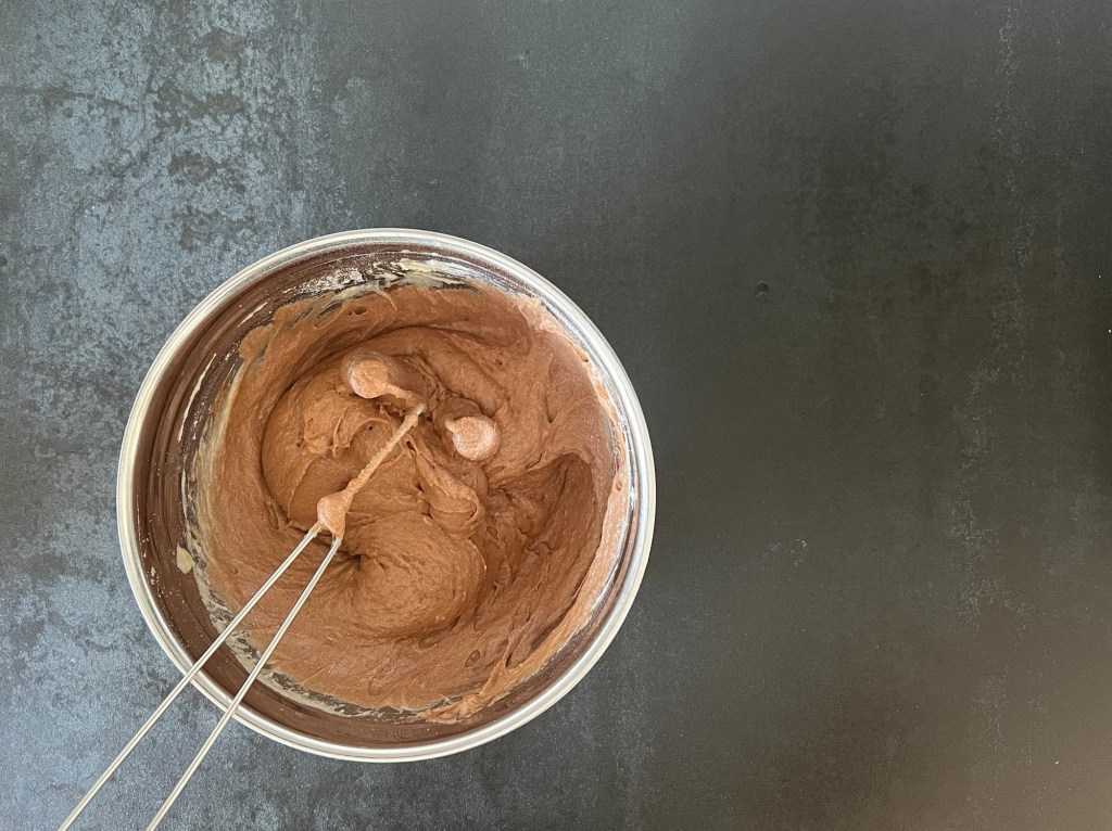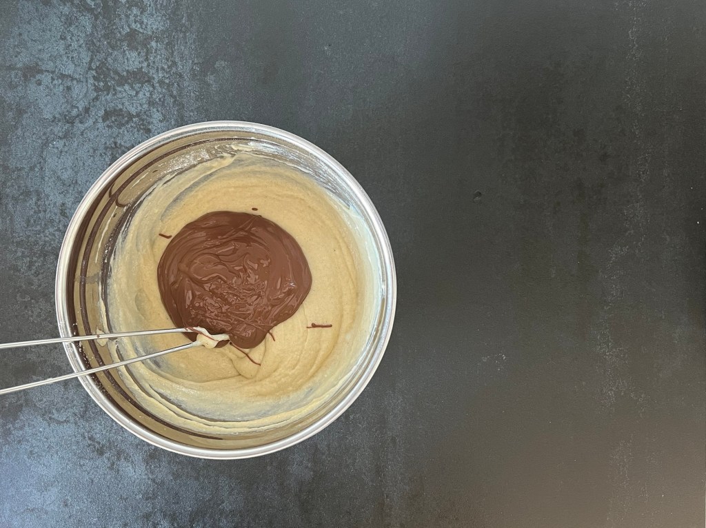 Sen tillsätter jag mjölk och ägg i mjölmixen och vispar till en slät smet. Tillsätter efter det den smälta chokladen och vispar samman.