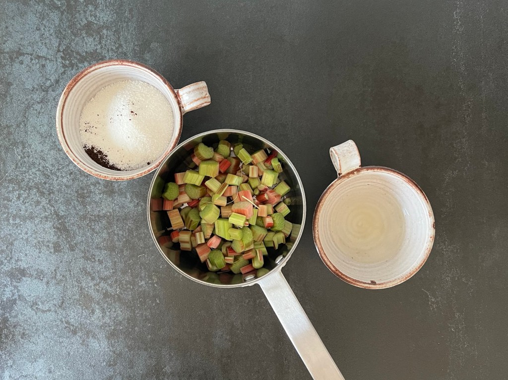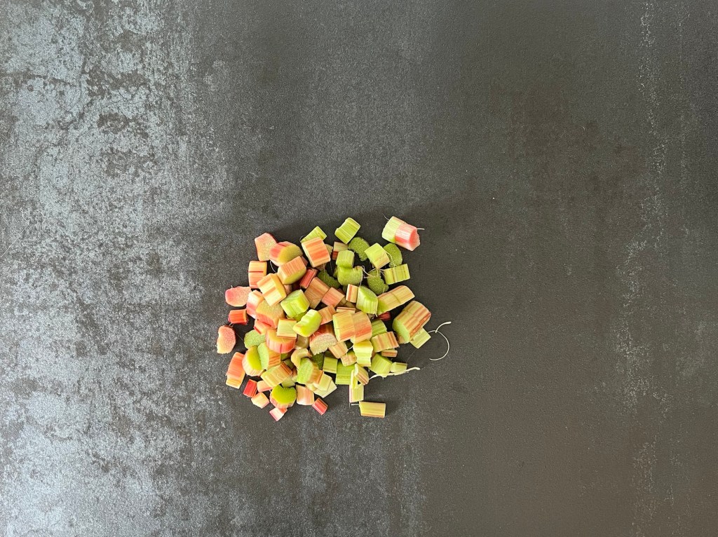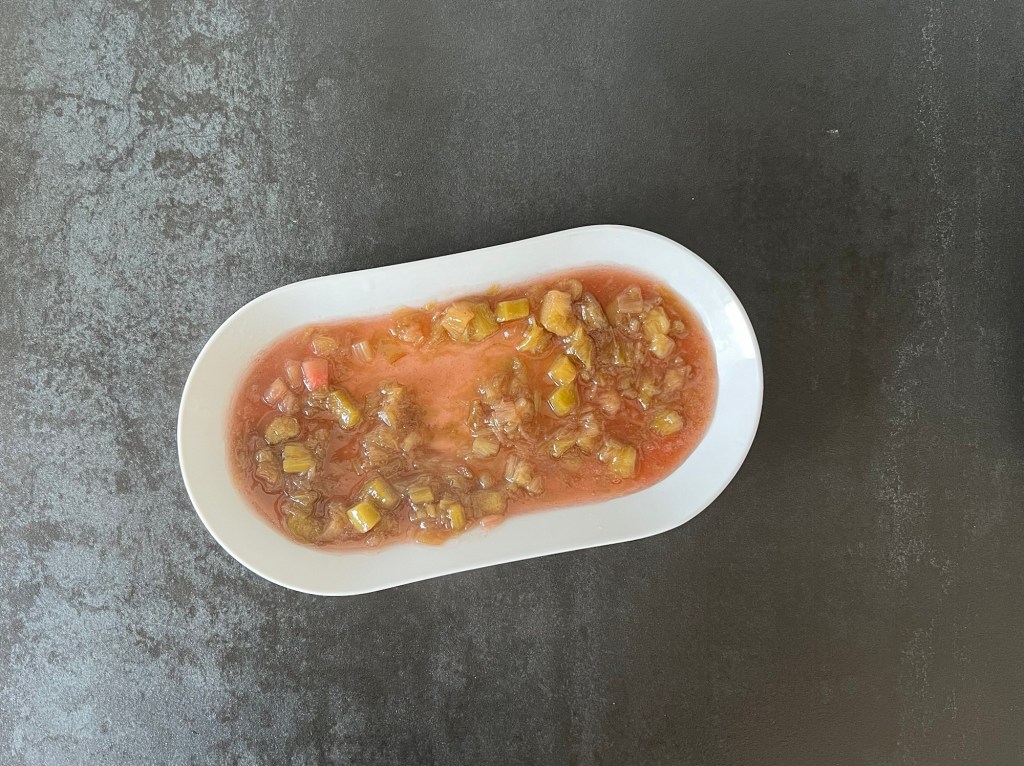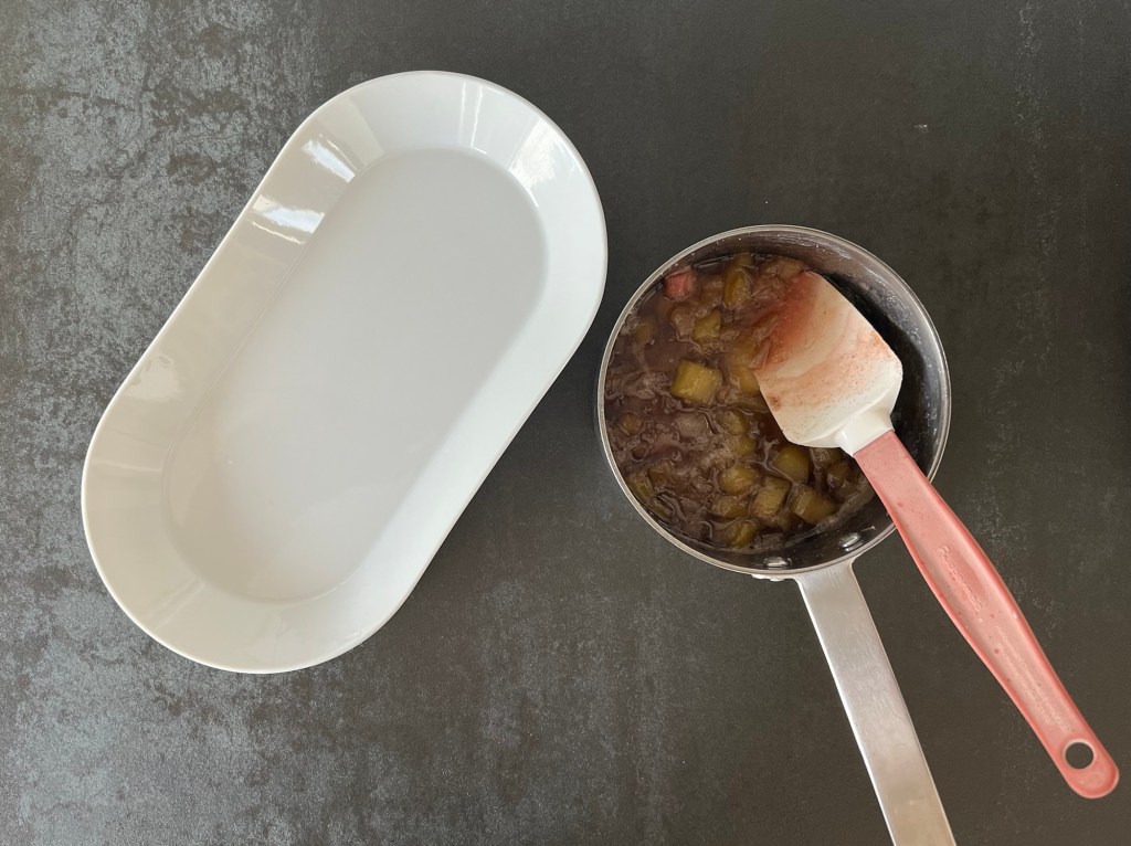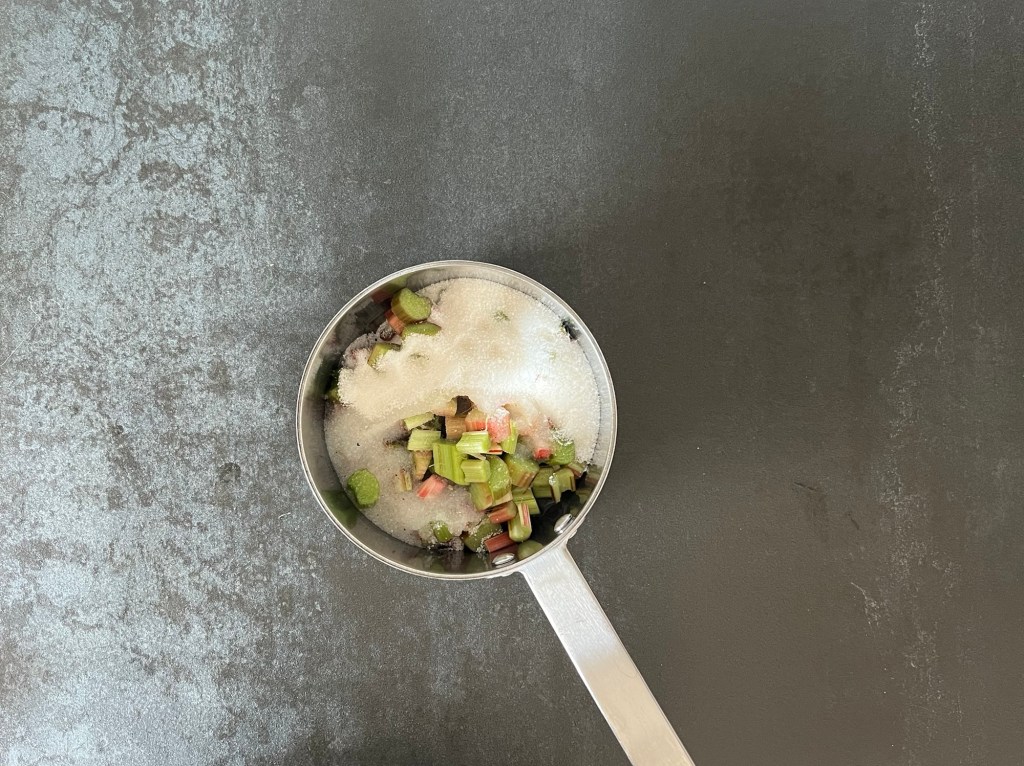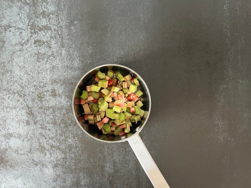 Allra först så ansar jag rabarbern, delar i mindre bitar, blandar med syltsocker, vaniljpulver, citron och vatten. Kokar upp och sjuder sedan i 15min innan jag häller upp i en tunn form och kyler.