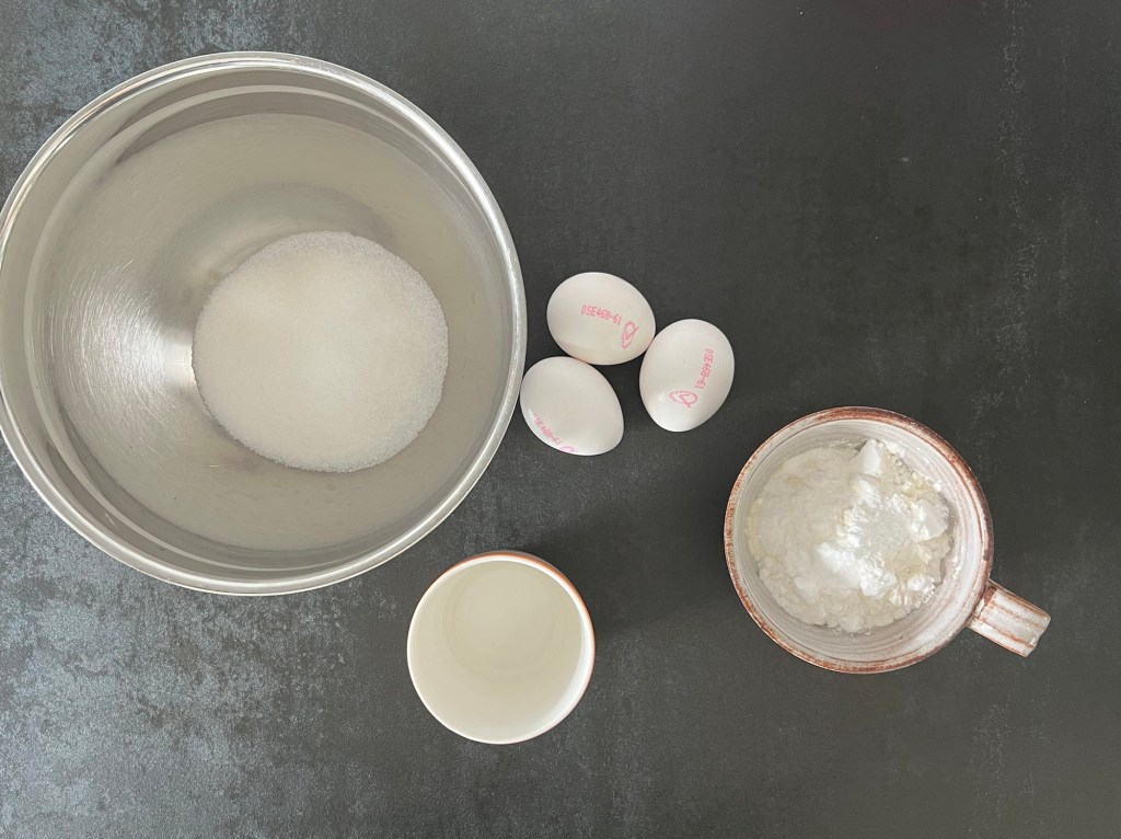 Jag börjar sedan med rulltårtsbotten. Mäter upp alla ingredienser, ägg och socker i en bunke, alla torra i en skål och så värmer jag vatten. Sen vispar jag ägg och socker vitt och pösigt.