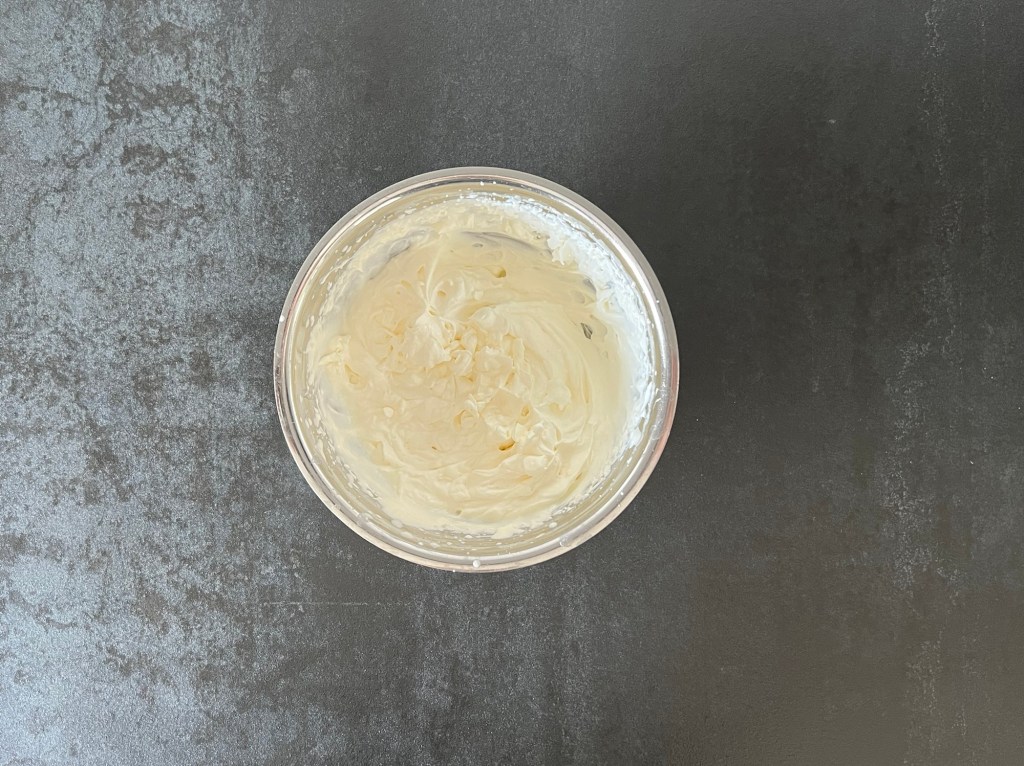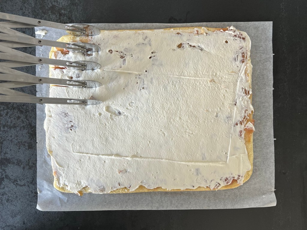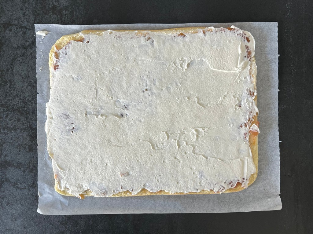 När rulltårtsbotten har svalnat så vispar jag grädden med lite bakpulver. Sen breder jag ut kompotten i ett jämnt lager över hela kakan, efter det stryker jag ut grädden över kompotten.