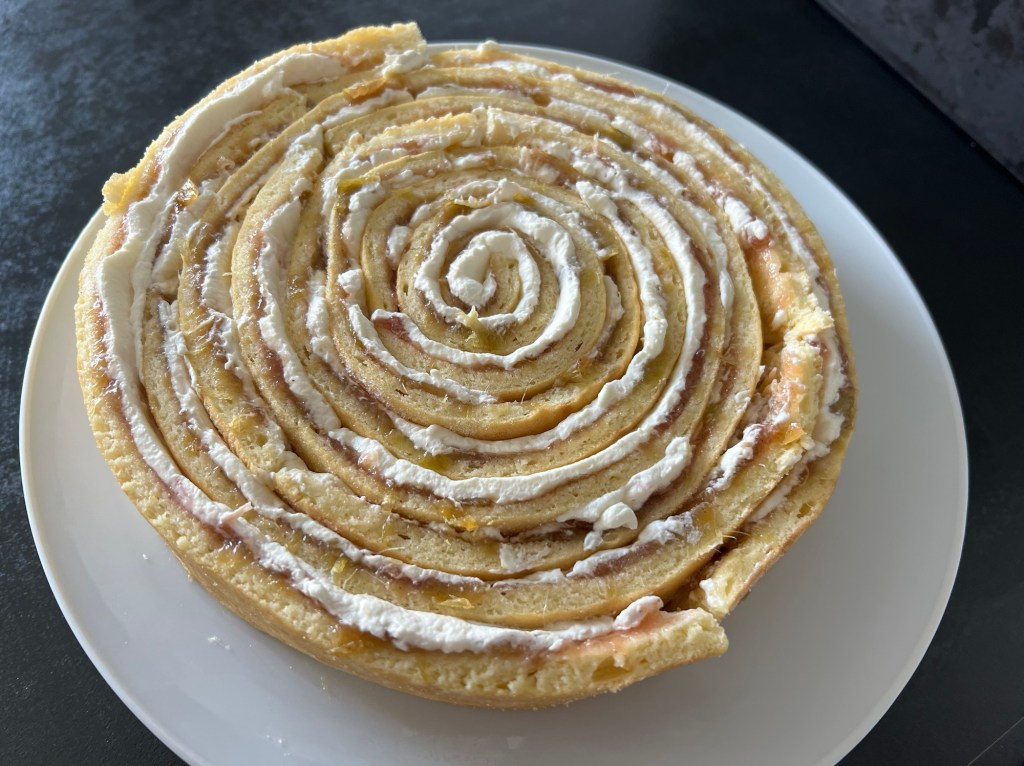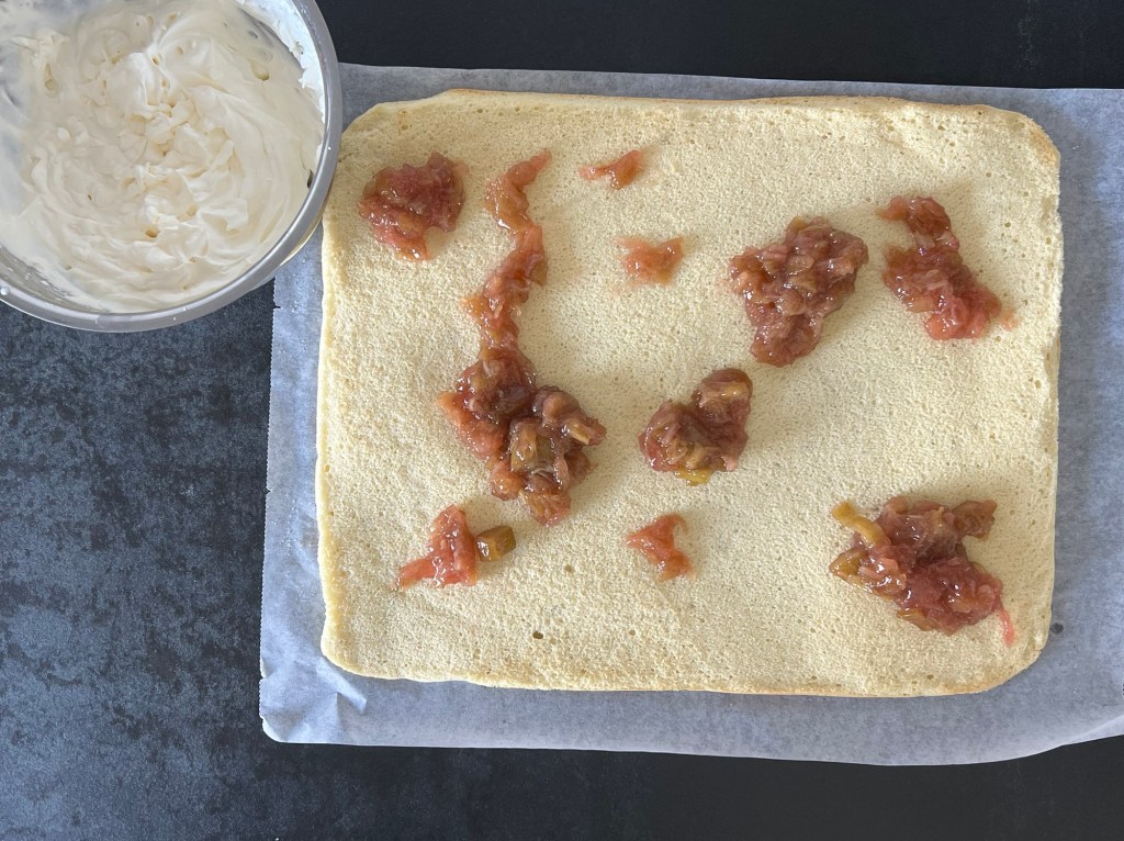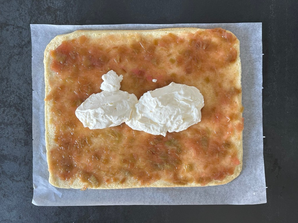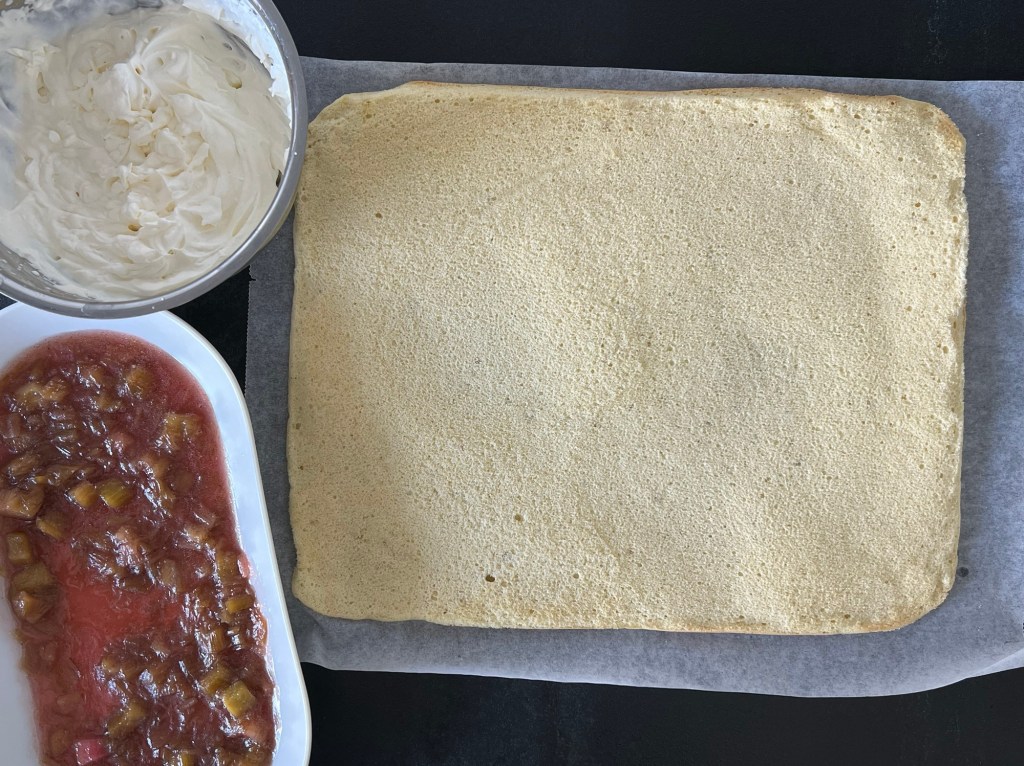 En nykokt rabarberkompott tillsammans med vispad grädde, skuren på längden och formad till en stor slice tårta. Snabbt, gott och enkelt att variera. Efter att jag satt rabarberkompotten i kylen så tog det mig ca 50 minuter att baka, fylla och rulla tårtan. Så smidigt!