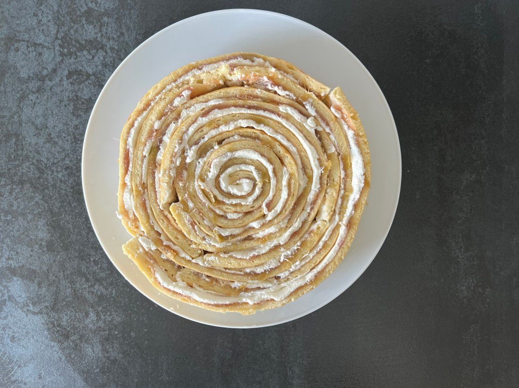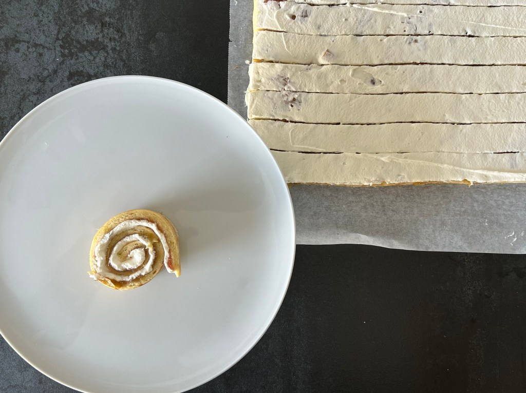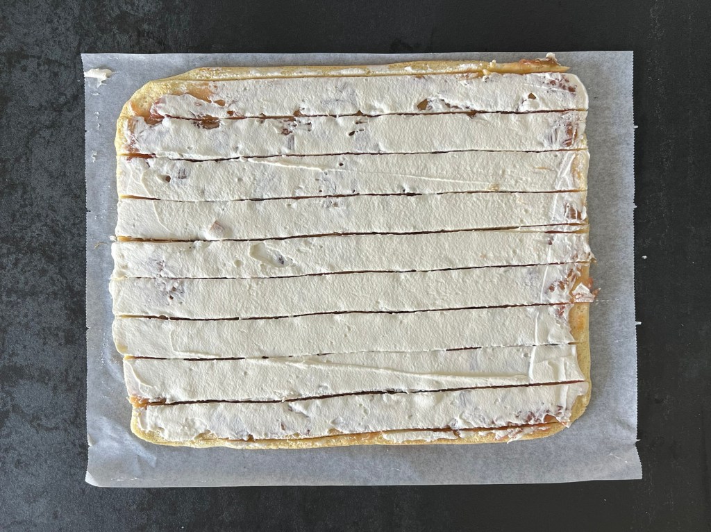 Sen skär jag remsor på längden, ca 3-4cm breda. Rullar det till en stor, skiva rulltårta och kyler ca 10-15min innan servering.