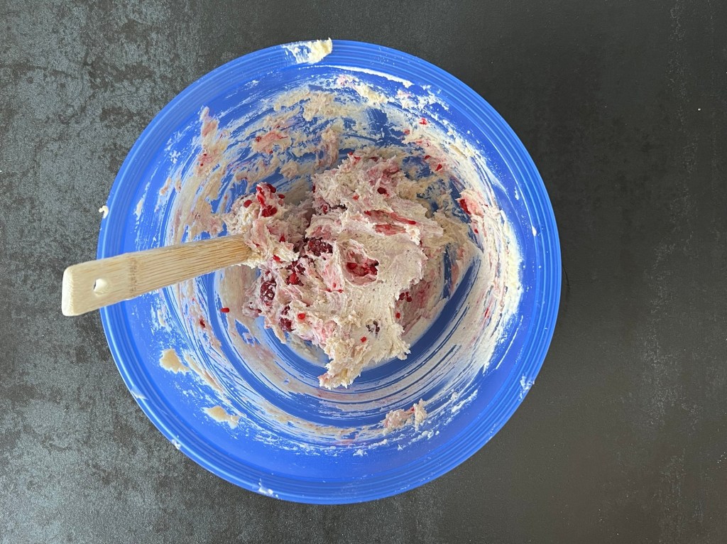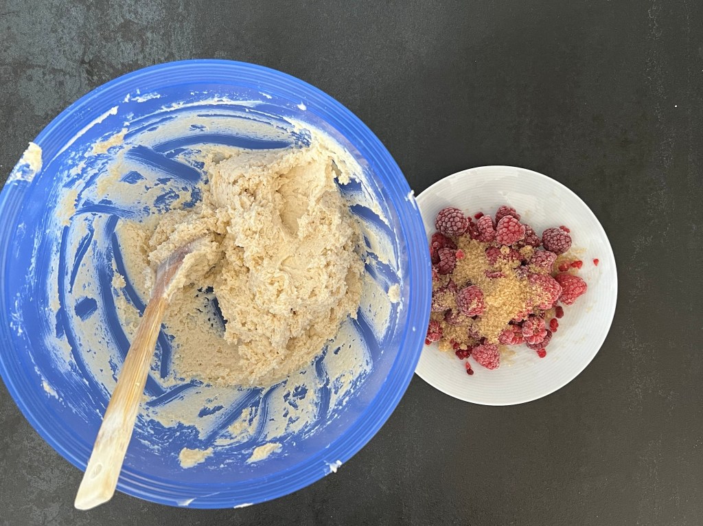 Sen tillsätter jag frysta hallon och rårörsocker , viktigt att hallon är kvar i frysen ända tills de blandar. Ett väldigt blött bär som kommer göra det kladdigt annars. Blandar samman degen.