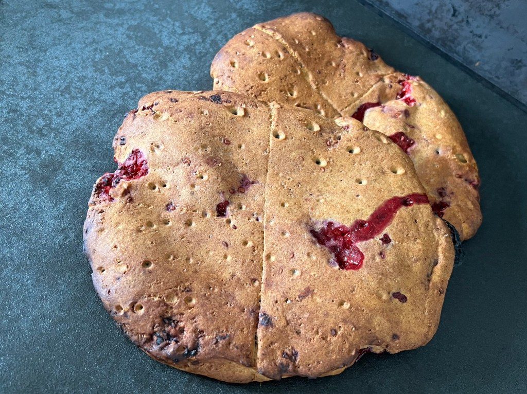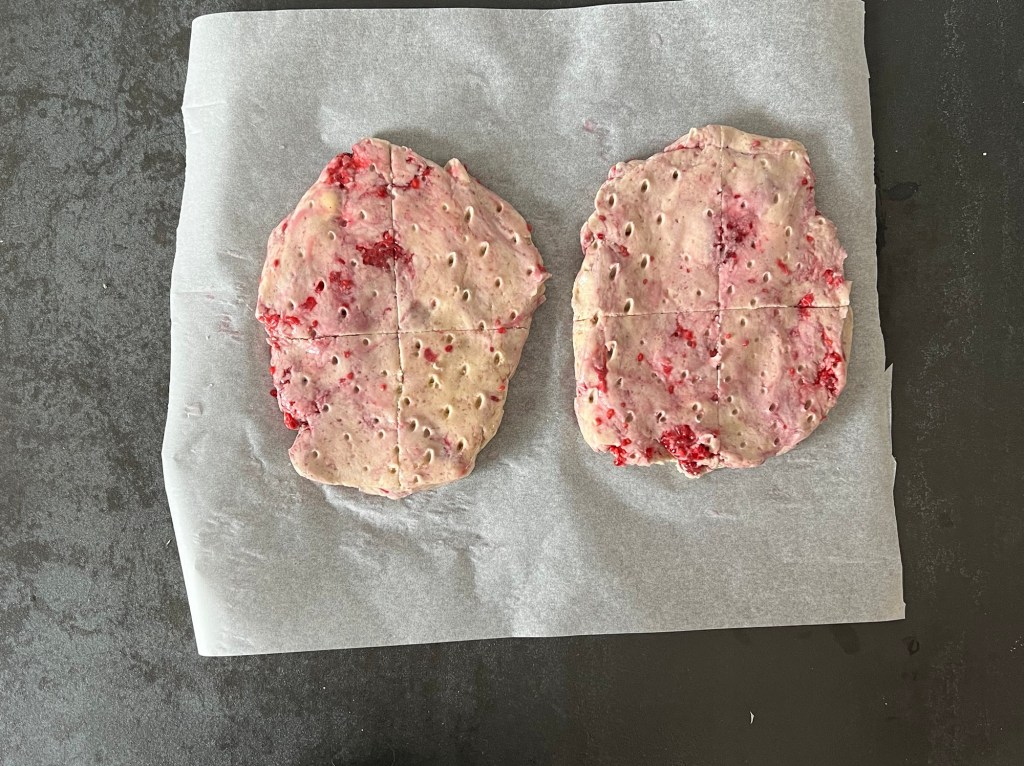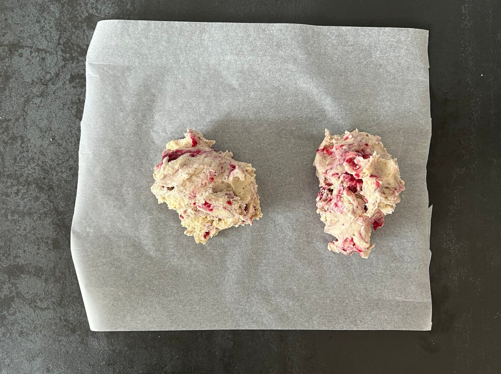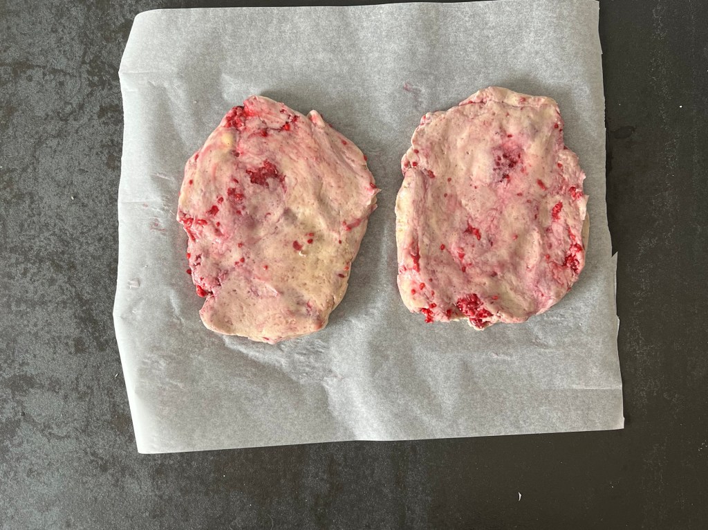 När de kommer ut ur ugnen får de vila på ett galler minst 15min. Hallonen är blöta och sconens blir på små ytor där hallonen ligger, lite kladdiga och syrliga, på ett gott sätt.