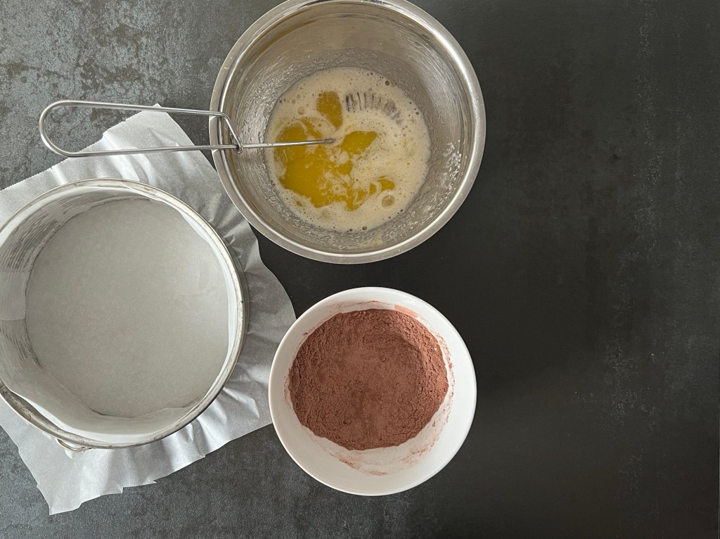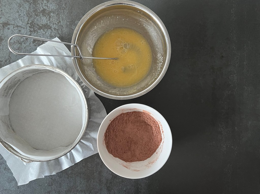 Det första jag gör är att jag bakar brownien. Klär en form med löstagbar kant och bakar en liten sats som ger en botten man slipper skära i. Blandar alla torra ingredienser, smälter smöret. Vispar samman ägg och socker, tillsätter smöret och vispar samman. Sen tillsätter jag mjölmixen och vänder ned den till en slät smet.
