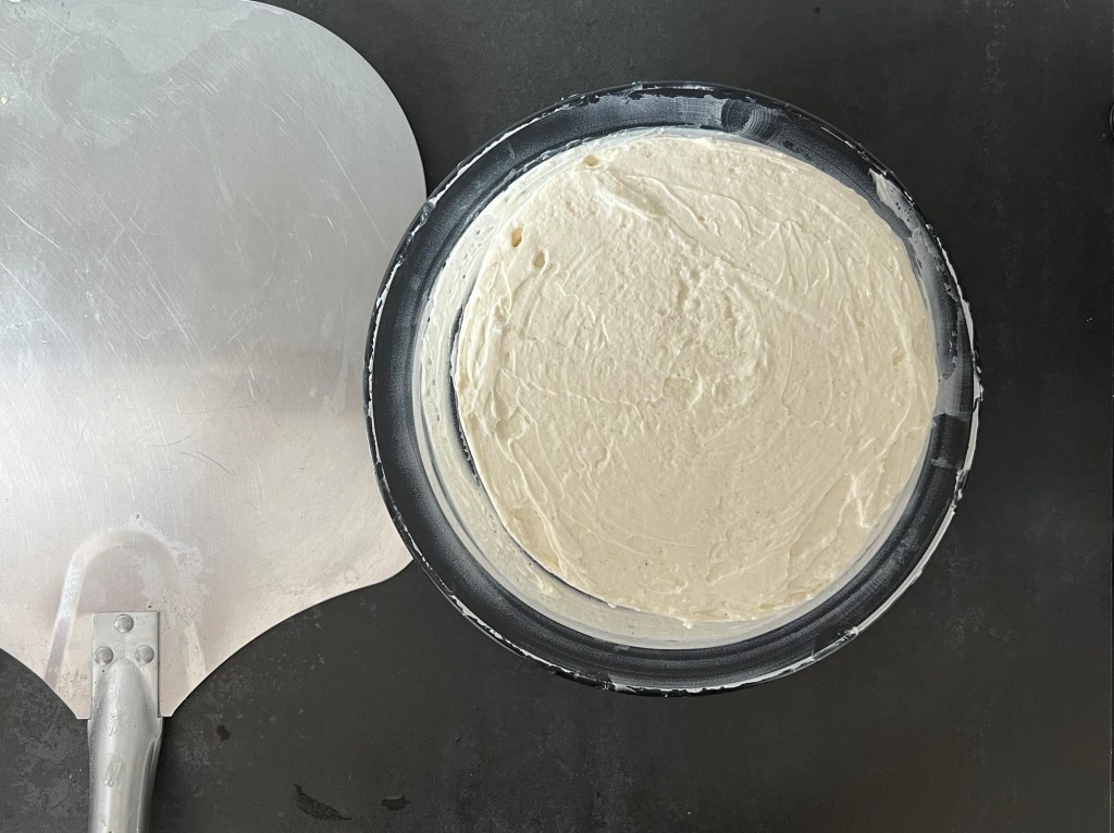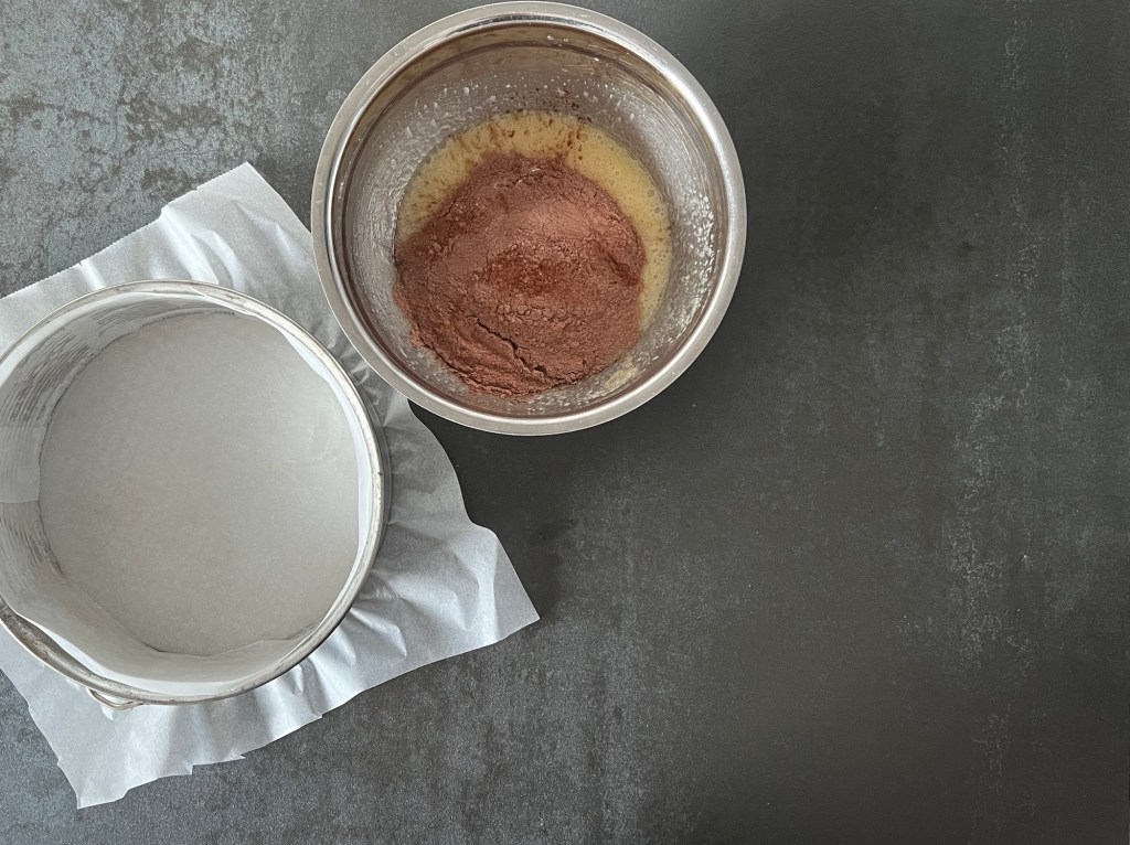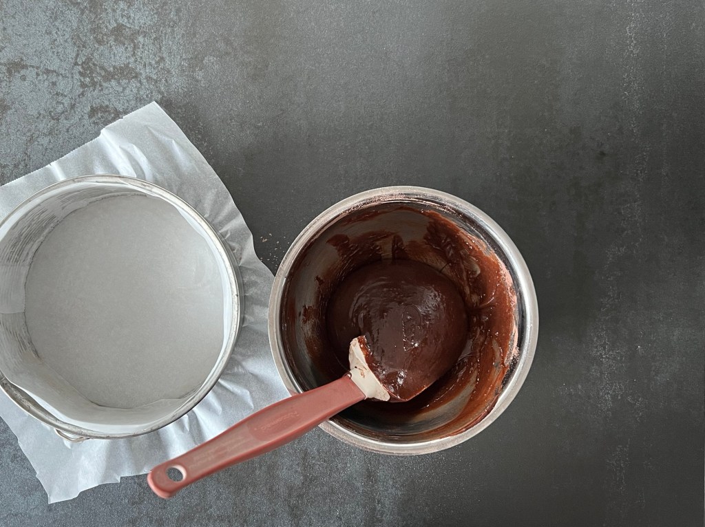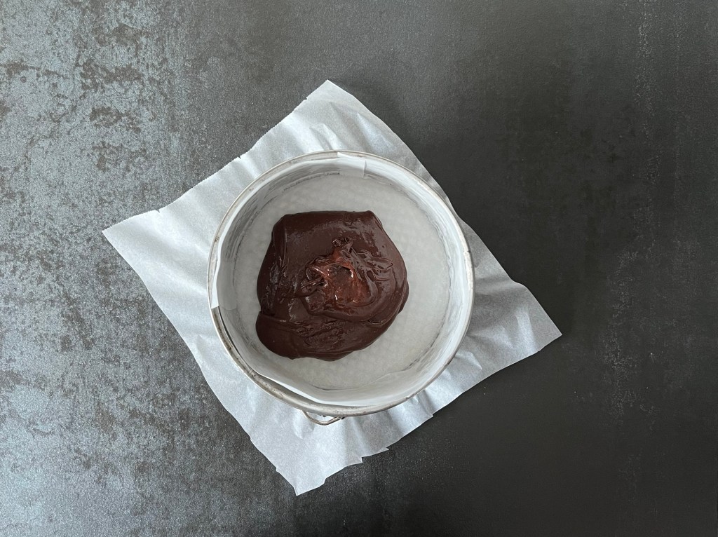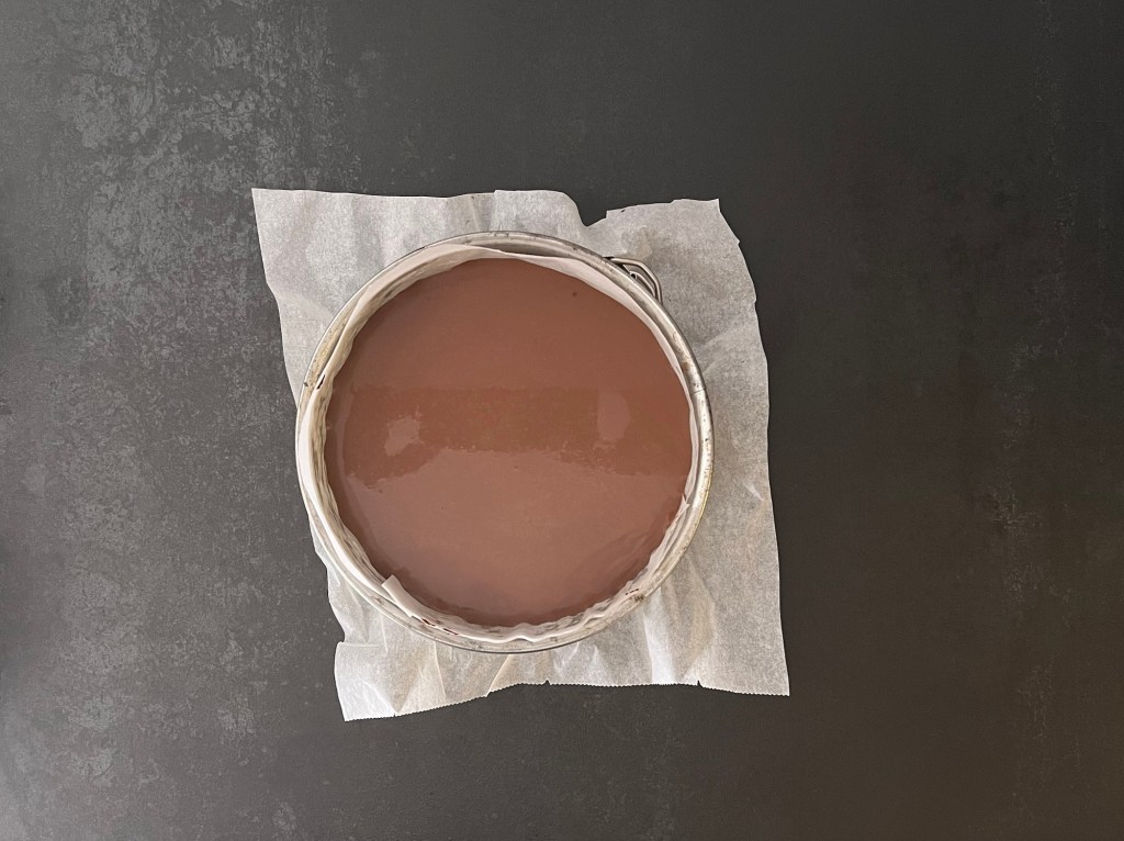 7. Lägg bakplåtspapper i bottenn på springformen, smörj kanterna och häll smeten i formen