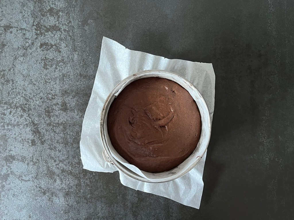 Jag fördelar smeten i den klädda formen och bakar av i förvärmd ugn. Låter sedan kakan svalna i formen, på ett galler.