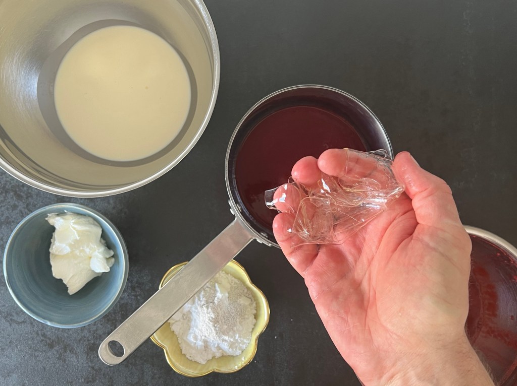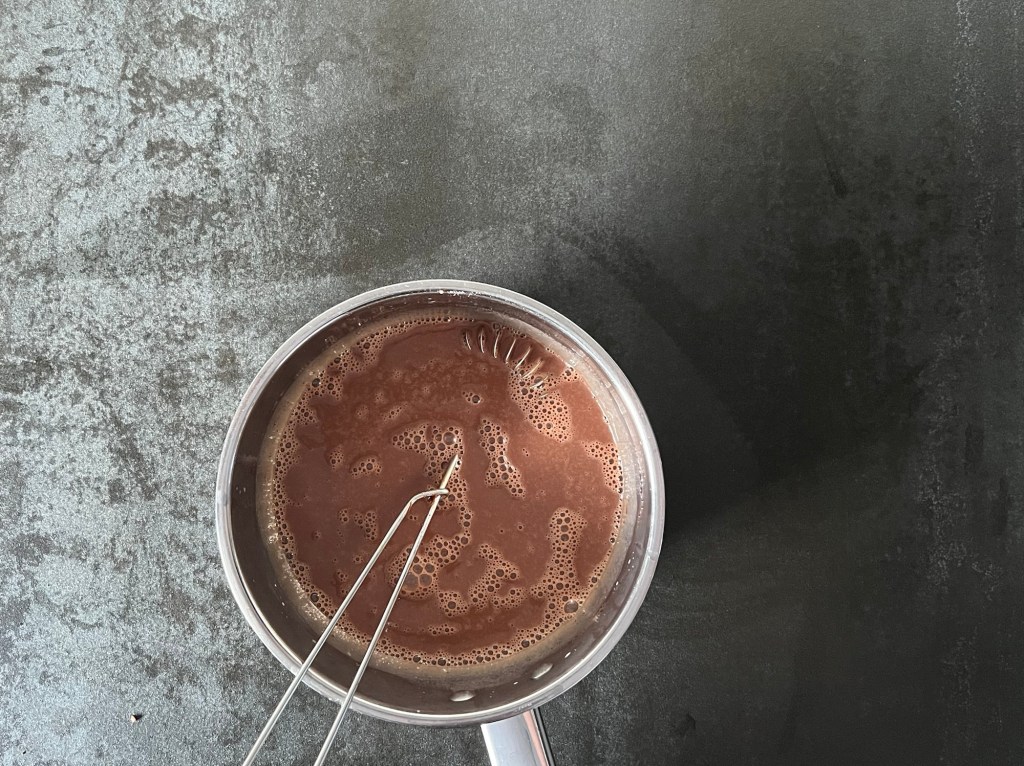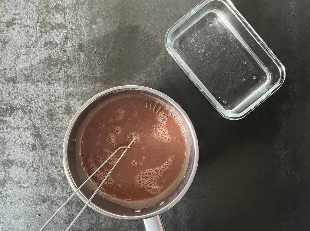 När kakan svalnar så börjar jag med mjölkchokladpannacottan, jag använder en choklad från Malmö Chokladfabrik som jag tycker är riktigt bra och god. Väger upp alla ingredienser, hackar chokladen, lägger gelatinbladen i blöt, värmer grädden. Sen vispar jag ned chokladen i den varma grädden till en slät smet. Kramar ur gelatinbladen och vispar ned i chokladsmeten, så de smälter. Jag låter min pannacotta stå och svalna i kastrullen medans browniebotten svalnar. Sen slår jag på smeten på browniebotten i formen och ställer in i frysen.