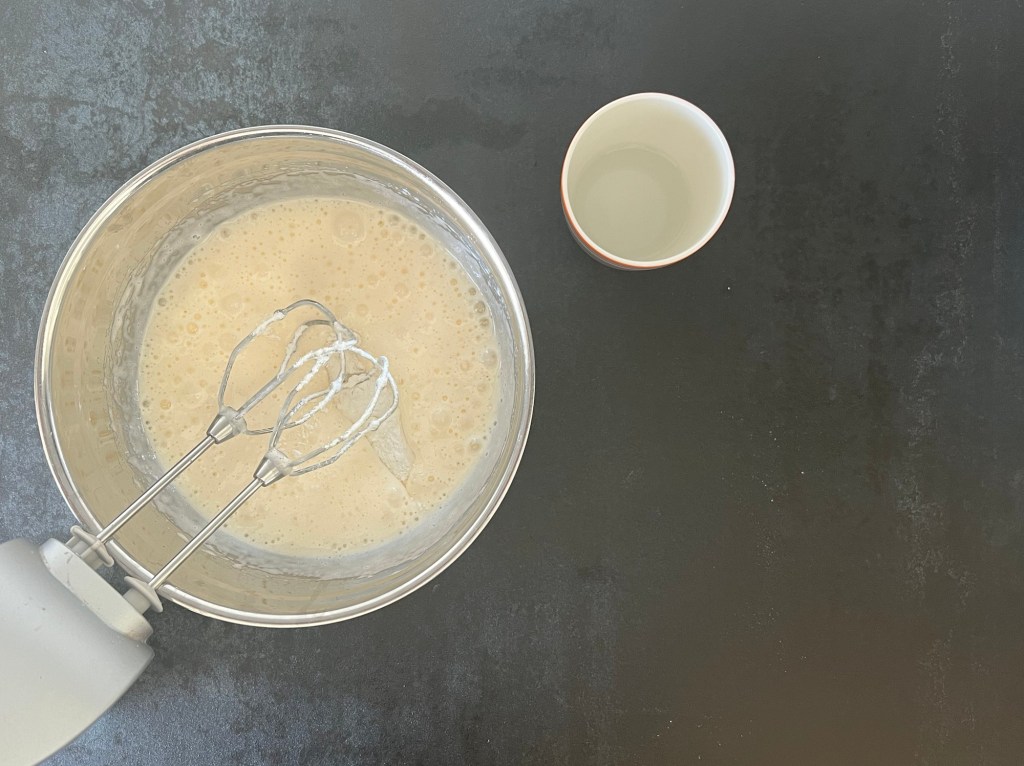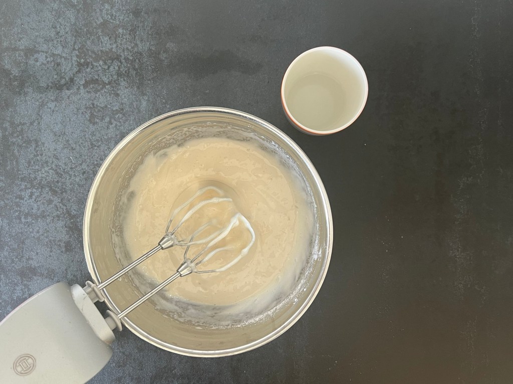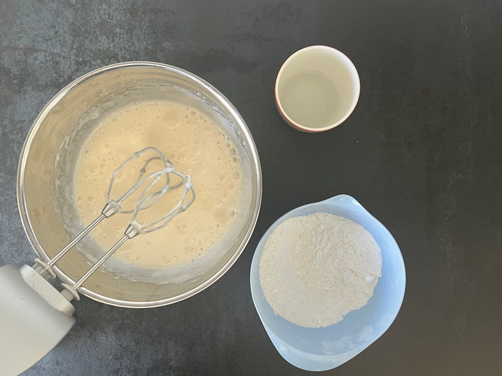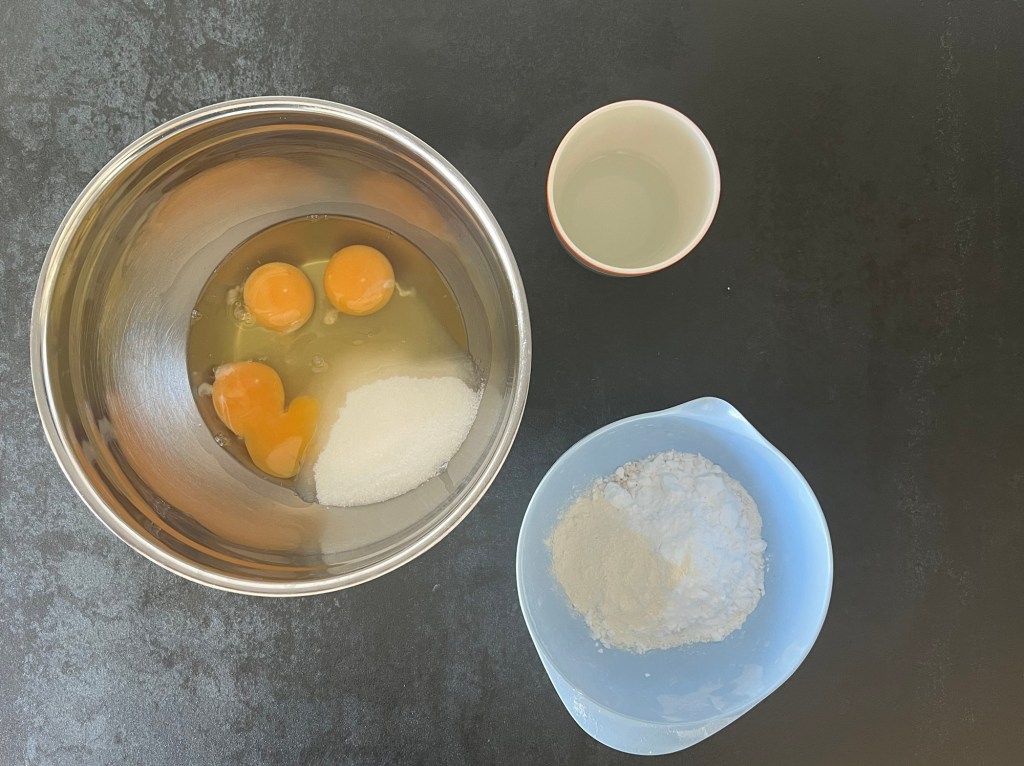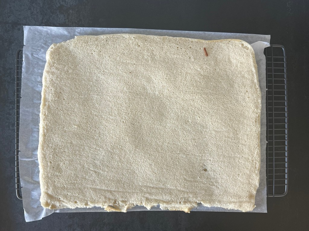 När pannacottan satt sig, med fördel när den är frusen så fortsätter jag med att baka en rulltårtsbotten. Väger upp alla ingredienser, blandar alla de torra förutom socker till en mjölmix, vispar socker och ägg vitt och pösigt, vispar ner mjölmixen i äggsmeten och sist vispar jag ned hett vatten.