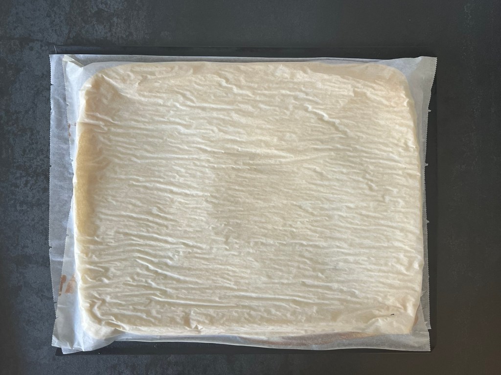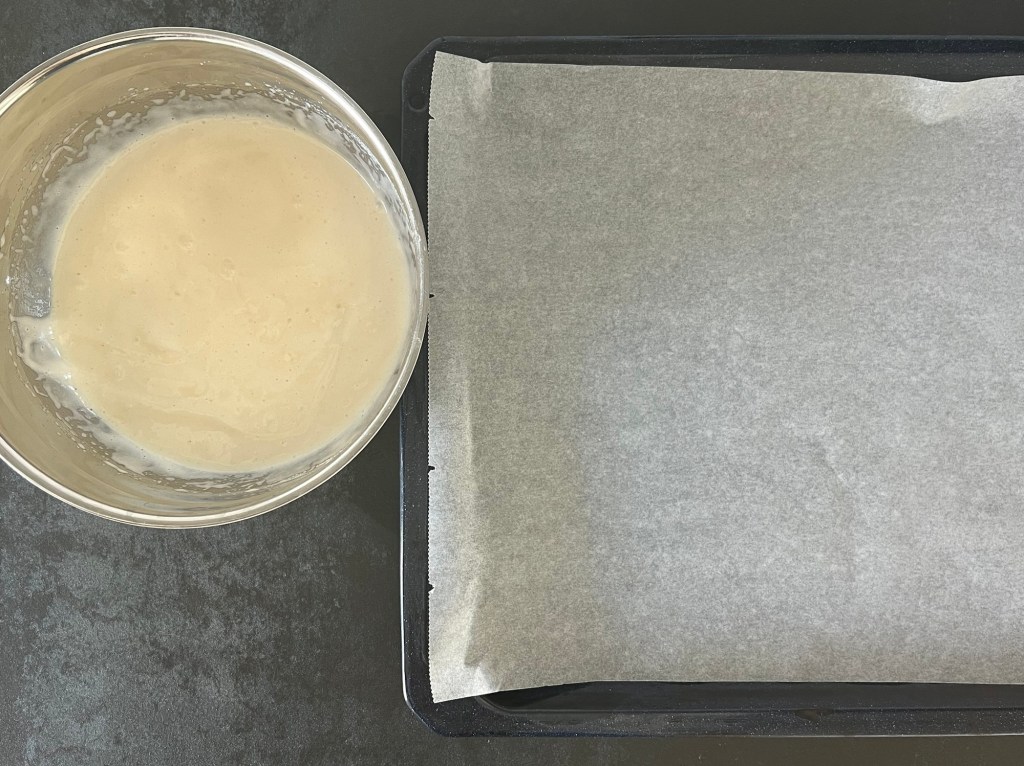 Häller upp smeten på en bakplåtspappersklädd plåt och bakar av i förvärmd ugn. Tar ut ur ugnen, lägger på ett nytt papper och en plåt, vänder på kakan, lossar bakplåtspappret och låter den svalna på ett galler.