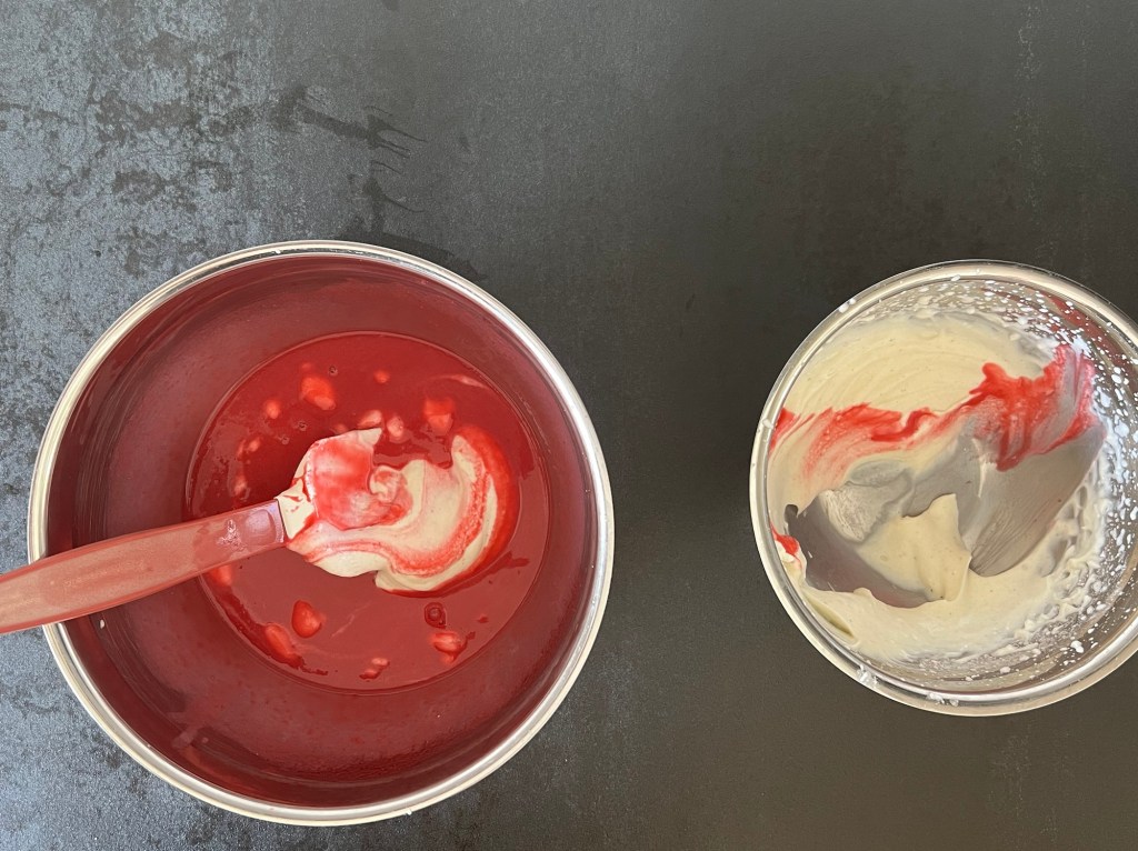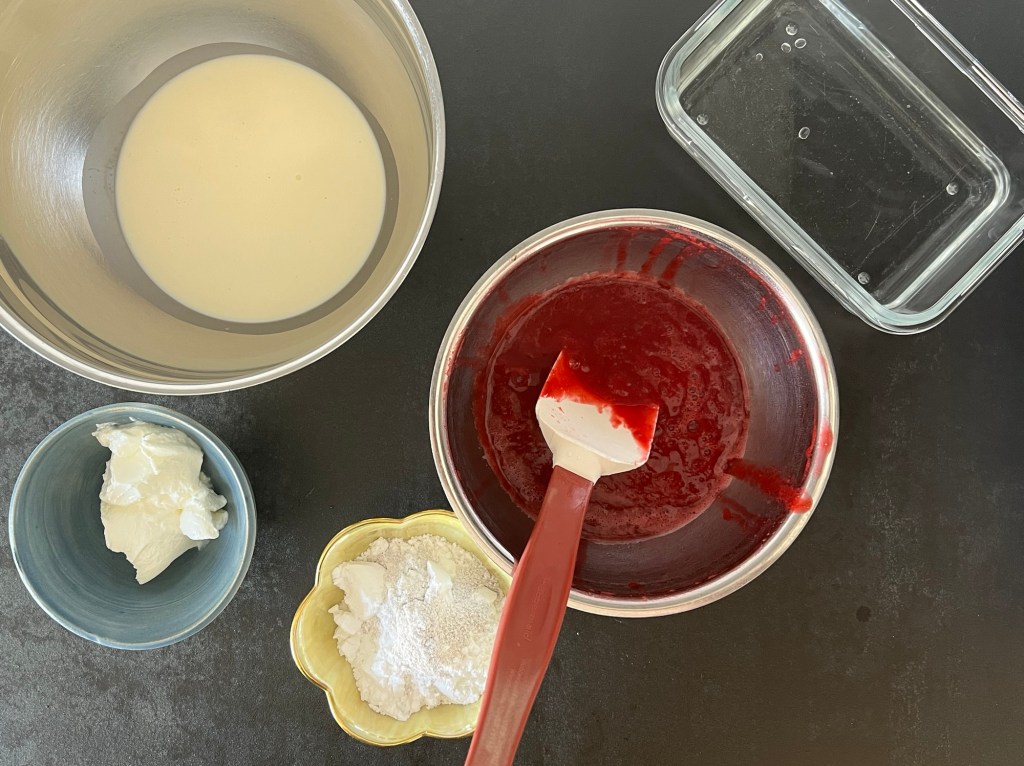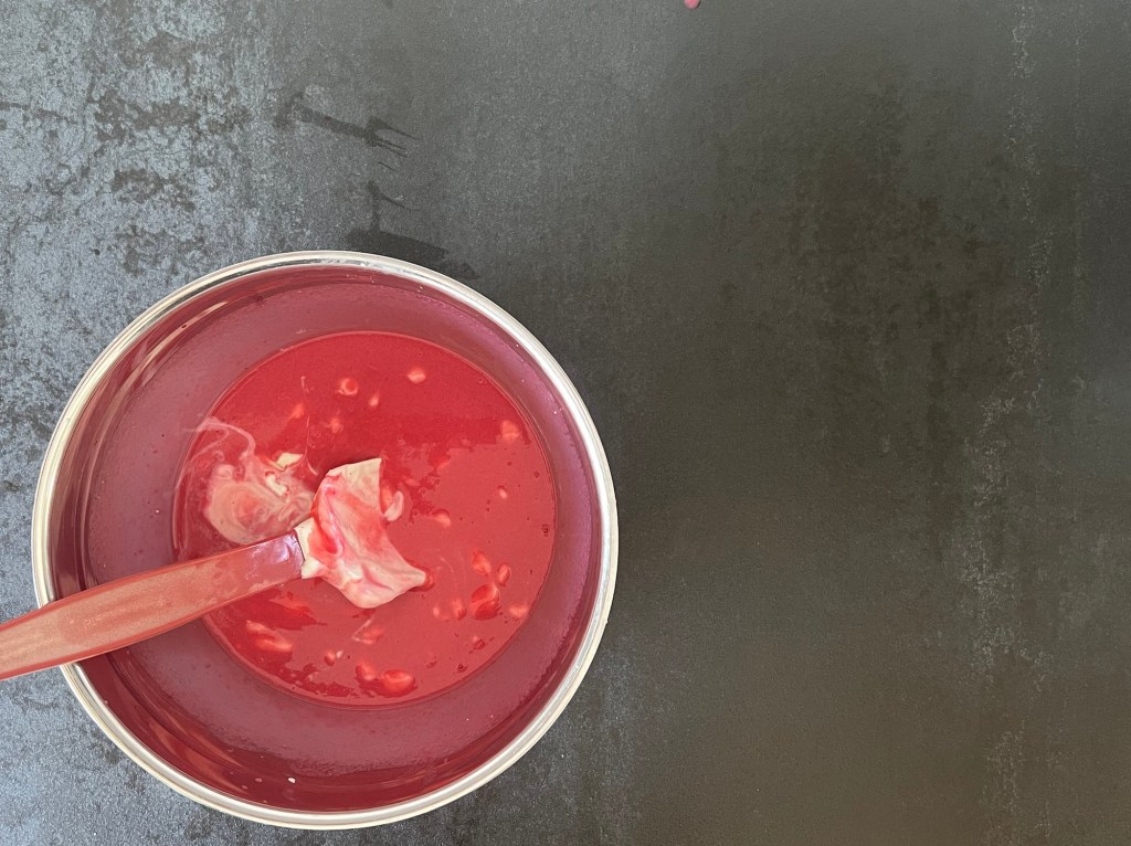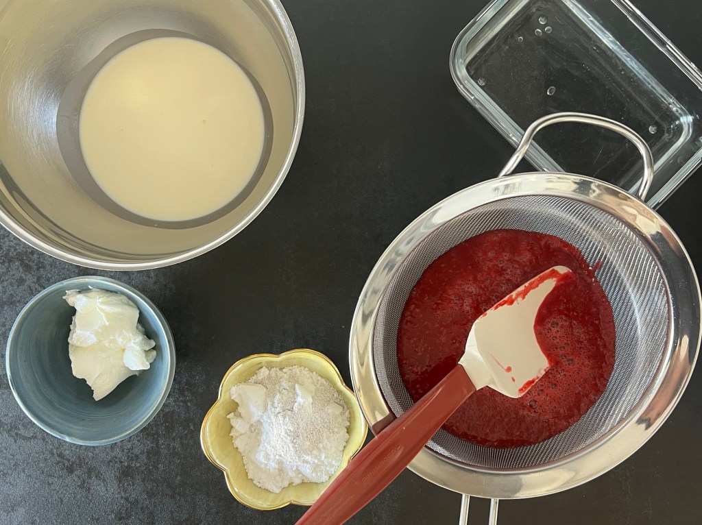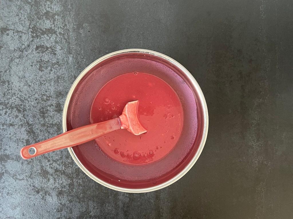 Efter rulltårtsbotten är det dags att göra hallonmousse. Det finns många varianter och sätt att göra detta på. Jag ville ha en kompakt, starkt rosa mousse med mycket smak och valde detta recept som jag använt mig av tidigare. Ganska enkelt så kokar man hallon och vatten, mixar och passerar. Sen blötlägger man gelatinbladen och efter det smälter man dem i en del av hallonpuren och blandar sedan samman hallon med varandra.