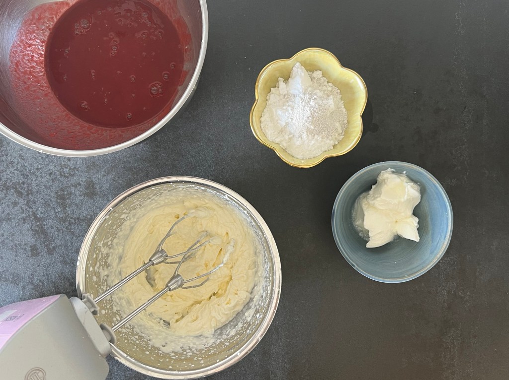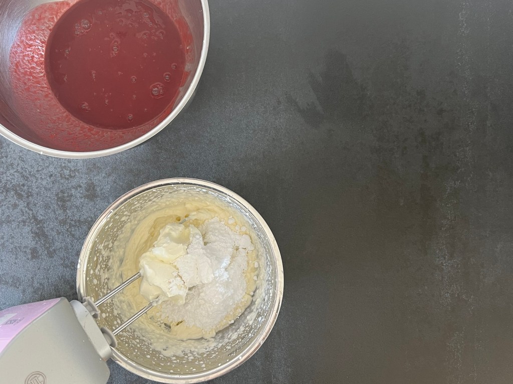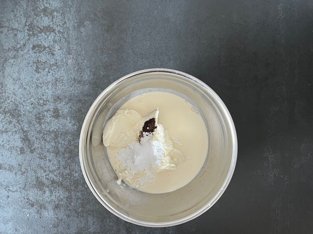 Efter det vispar jag grädde fast och sedan tillsätter jag turkisk yoghurt, florsocker och vaniljpulver, vispar till en fast och hård konsistens.
