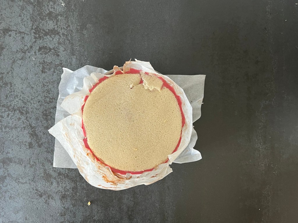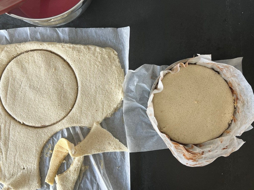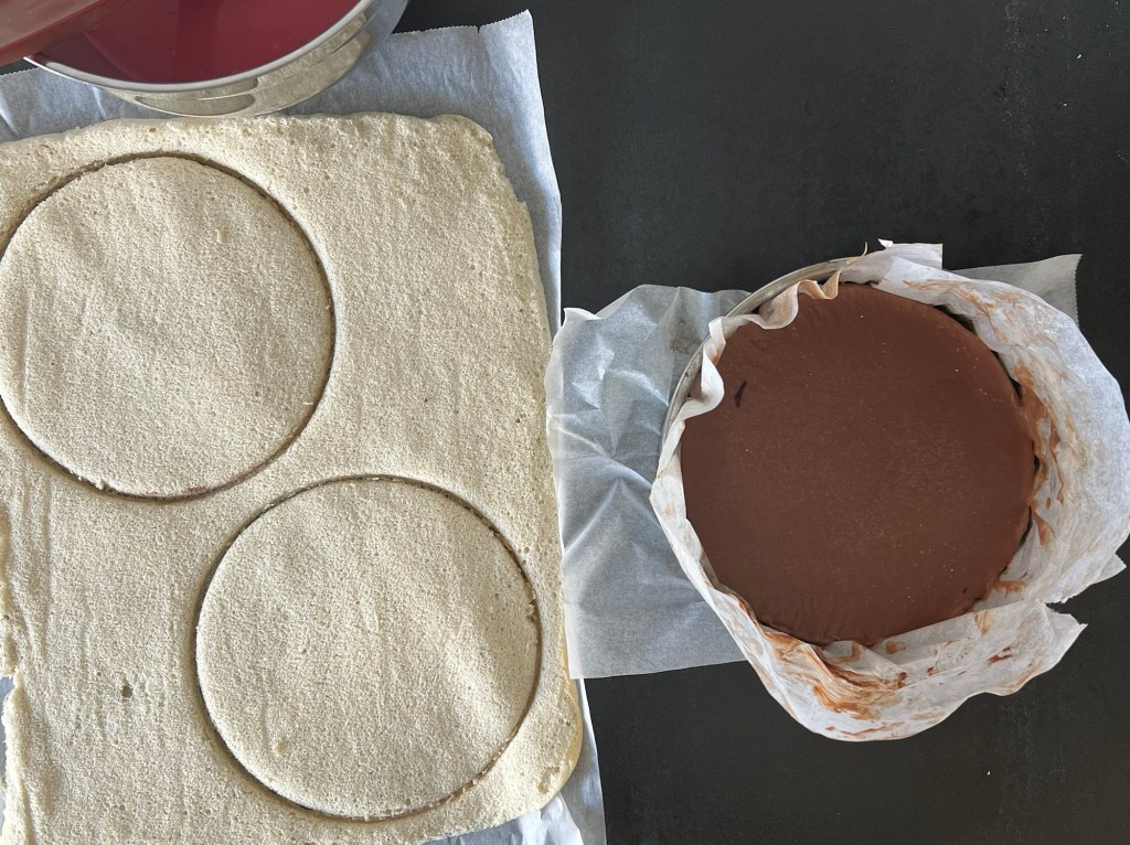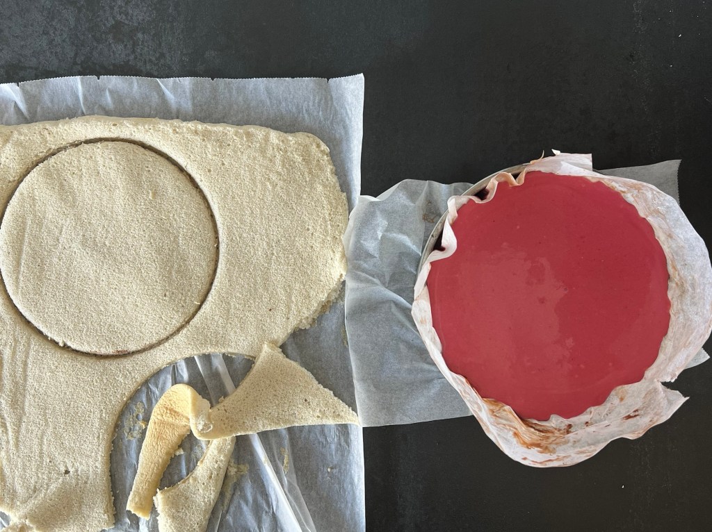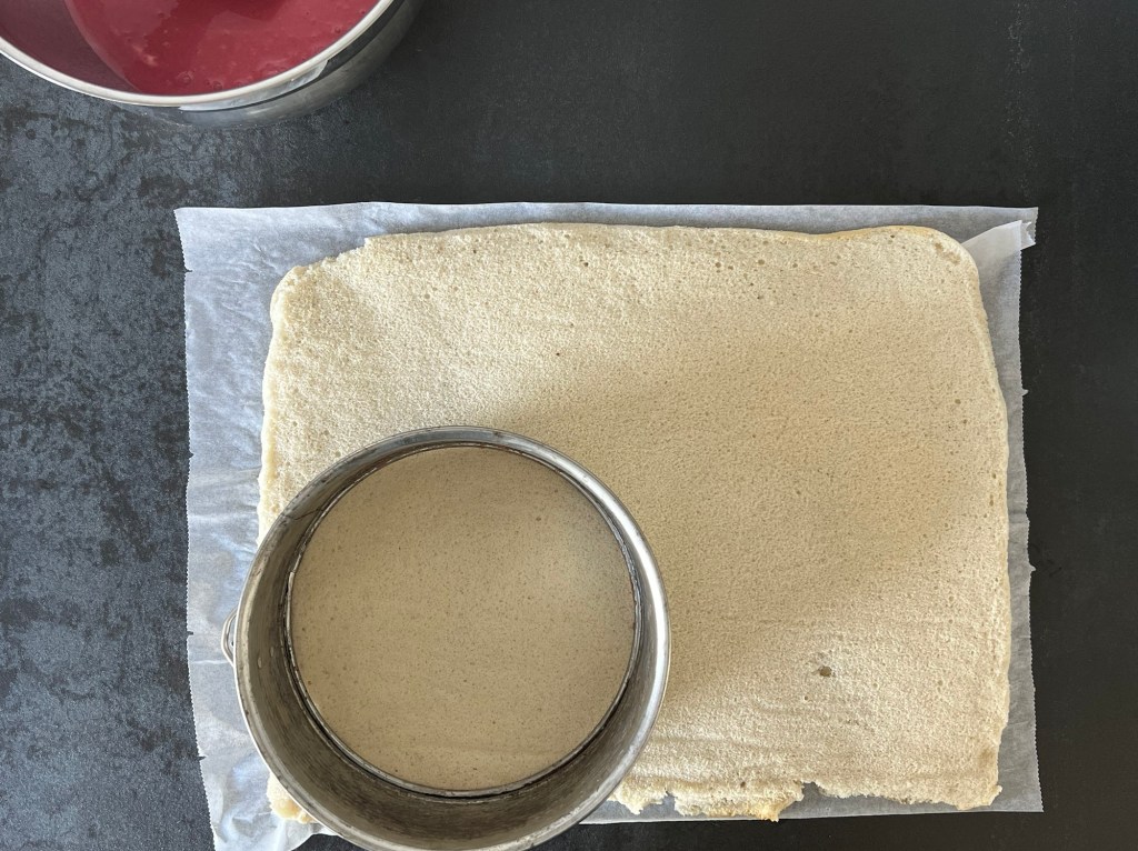 När moussen är färdig då stansar jag två bottnar av rulltårtsbotten, jag använder ringen på formen att stansa med. Lägger en botten på pannacottan, häller på hallonmoussen. Lägger på den sista botten på hallonmoussen och sätter in allt i frysen.