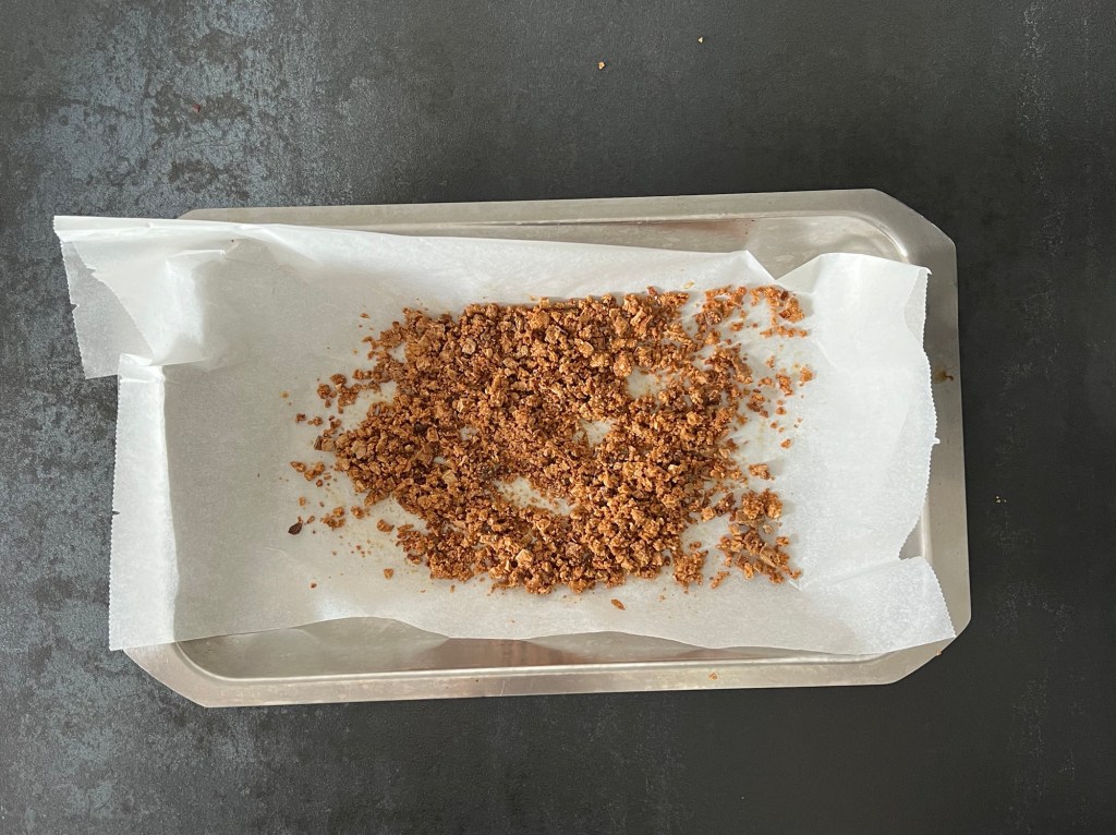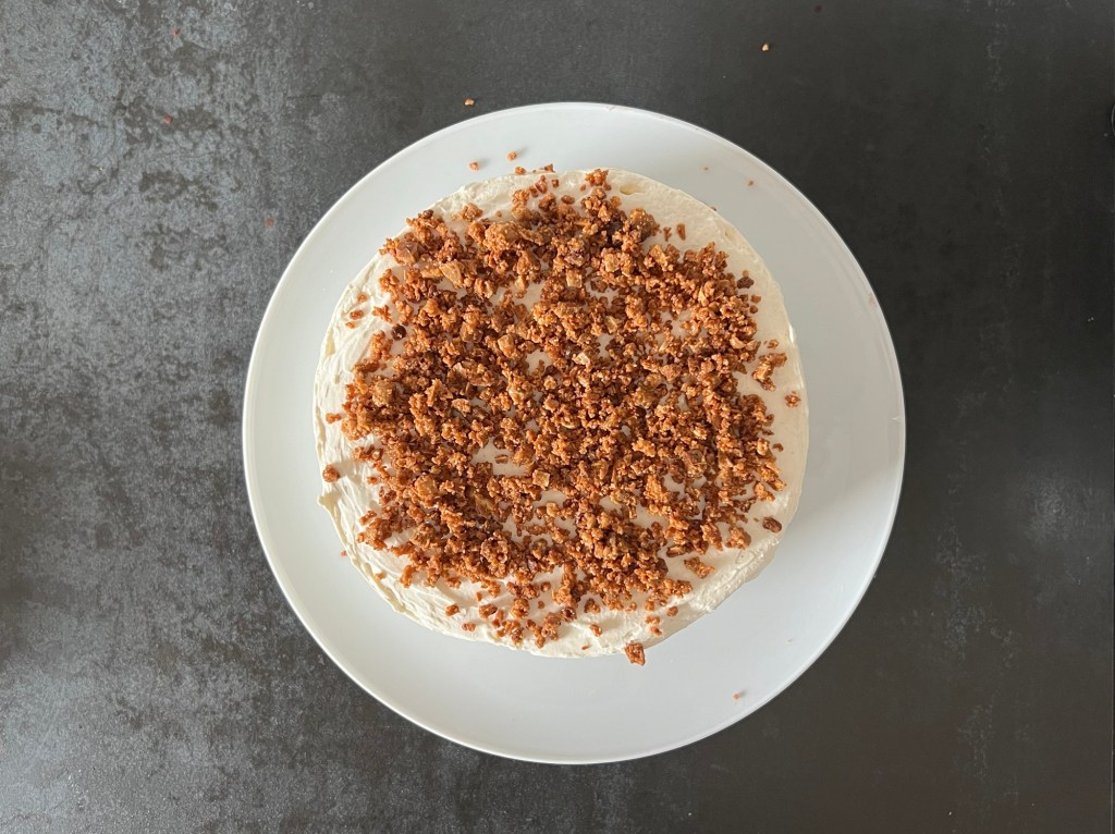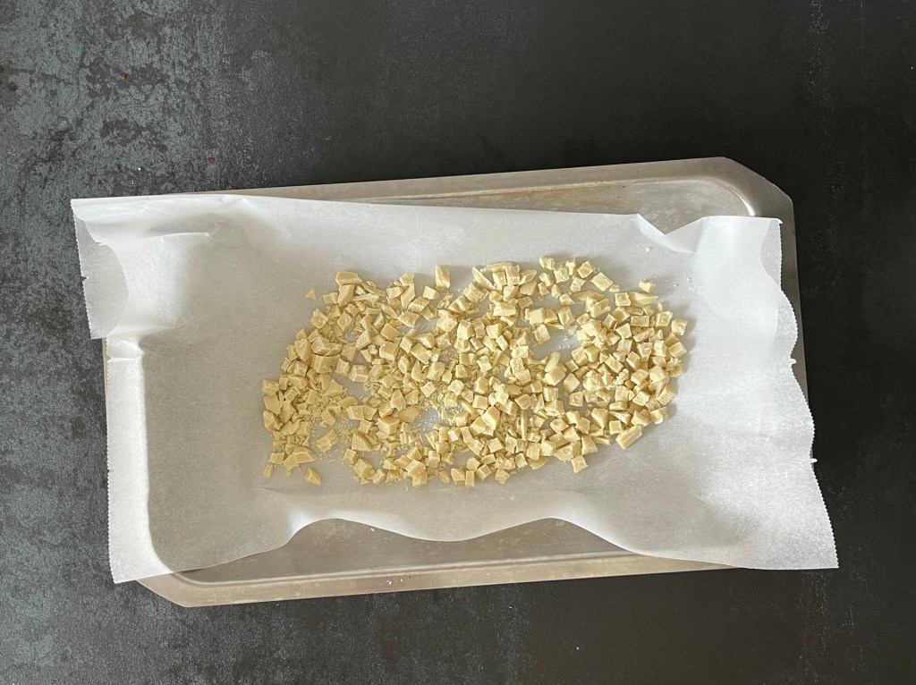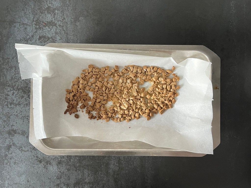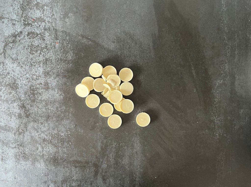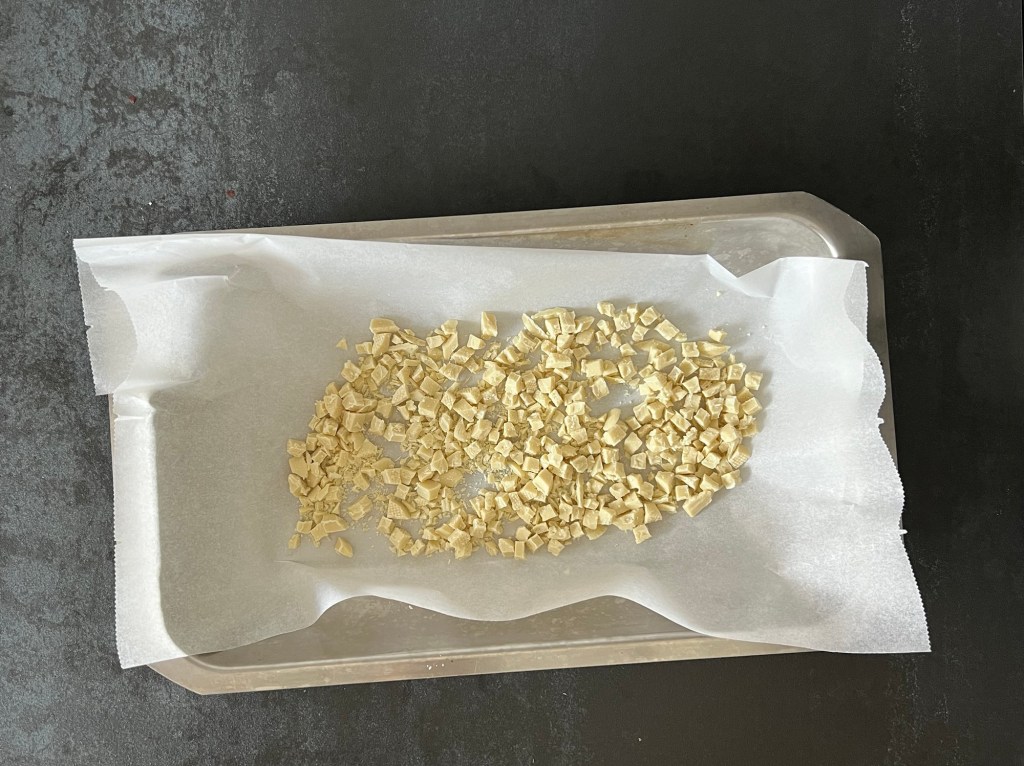 När tårtan står i frysen så rostar jag vit choklad. Jag tar 100g av en god vit choklad, i mitt fall blev den från Malmö chokladfabrik, sen hackar jag den och rostar den på 175grader i ca 10min, håll koll de sista minuterna så att den inte bränner. När den kommer ur ugnen tar jag en matsked och så krossar jag den medans den är varm. Sen får den svalna