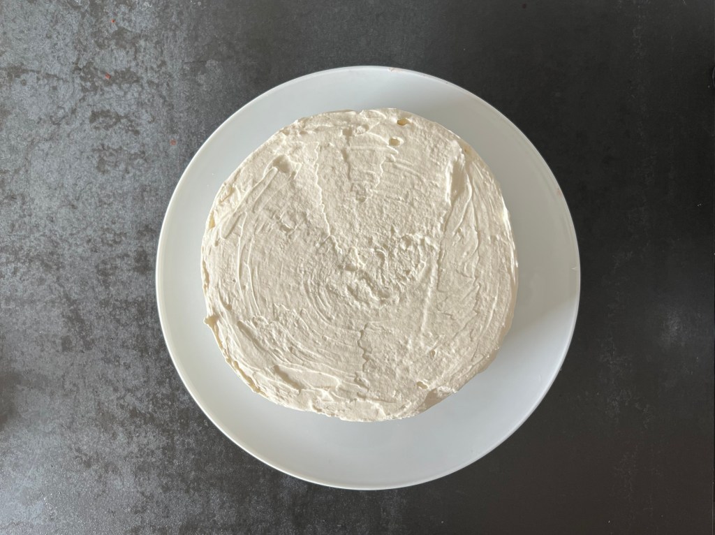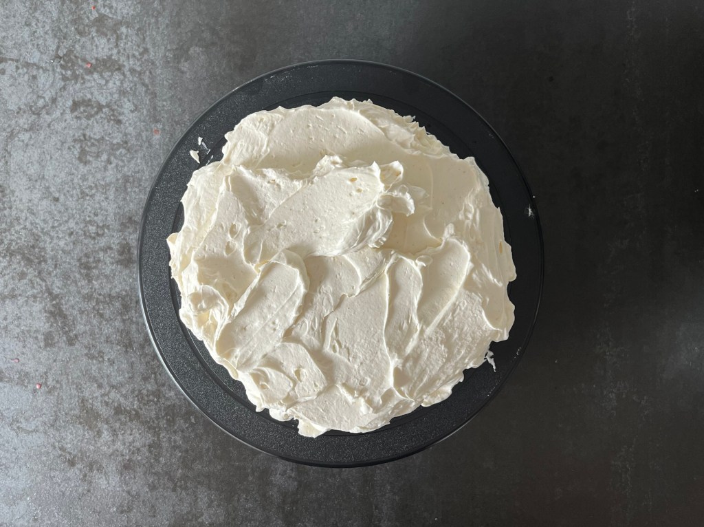 När tårtan har fryst/moussen satt sig och är stabil, då vispar jag samman färskostcrémen och sedan tar jag fram tårtan. Stryker den slät runt om och ovanpå med crèmen.