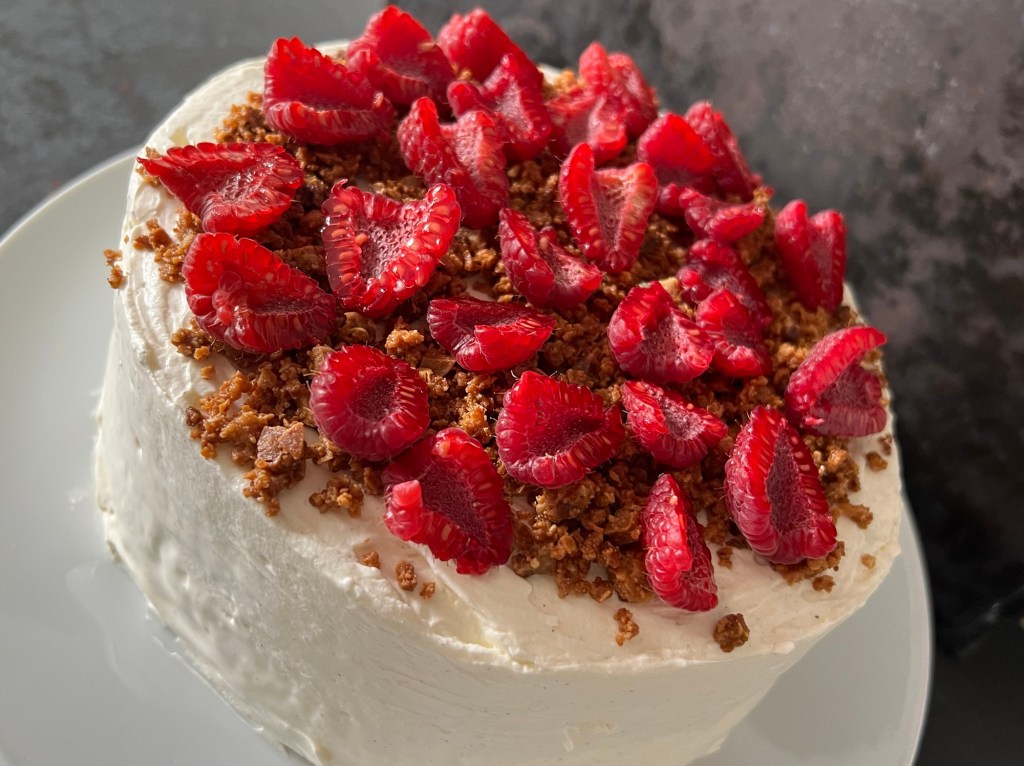Jag delar sen hallonen på mitten med en vass kniv. Toppar tårtan med den rostade chokladen och ovanpå den så lägger jag hallonen. Sätter in tårtan i kylen och låter den tina i minst ett par timmar innan servering.