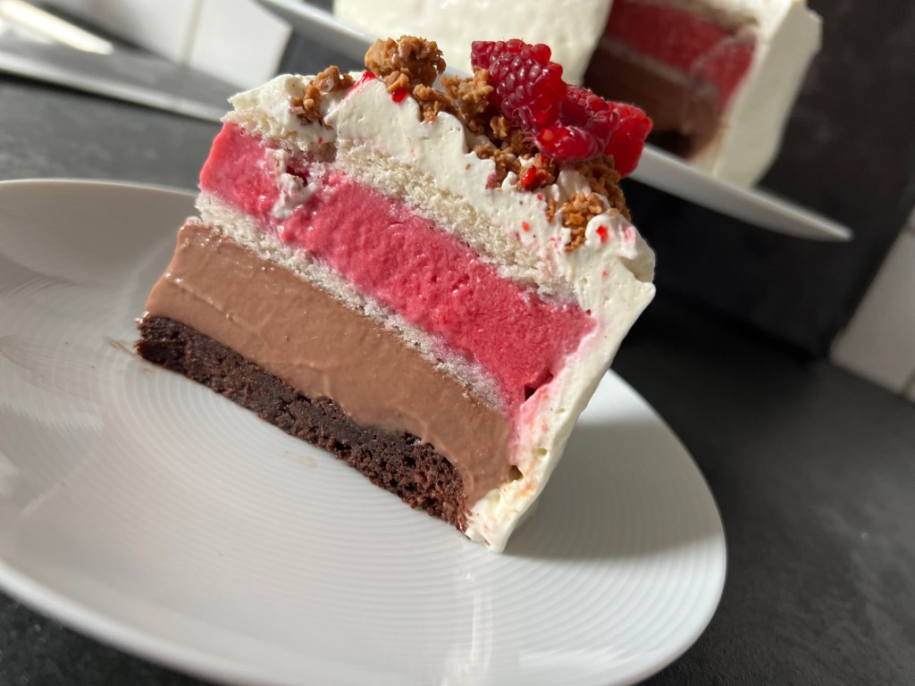 Tårta med mjölkchokladpannacotta och hallonmousse
