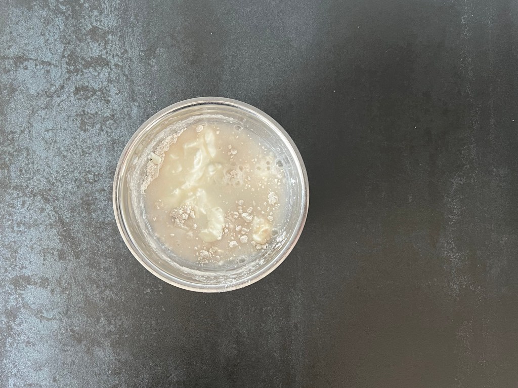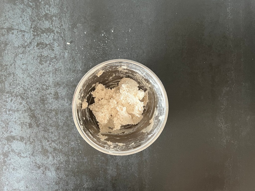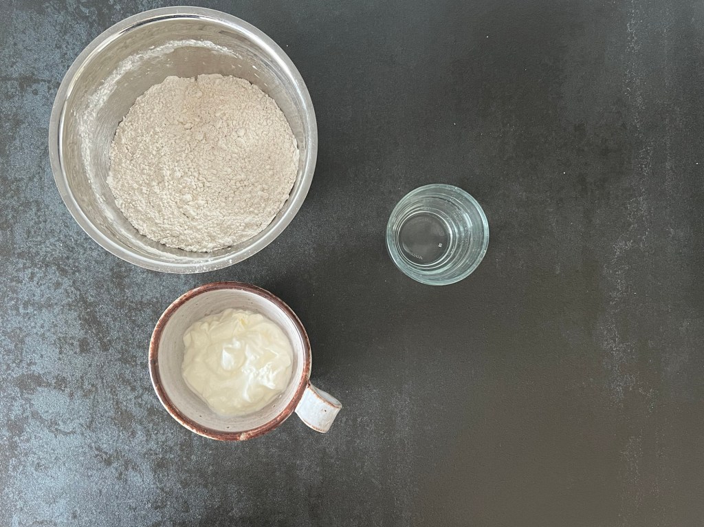 Jag börjar med att väga upp allt och blanda alla torra ingredienser till en mjölmix. Sen tillsätter jag gräddfil och vatten till mixen och blandar samman med en träslev. Har man inte gräddfil så funkar det med crème fraîche, turkisk yoghurt eller liknande.