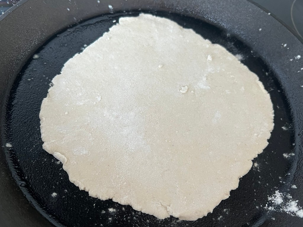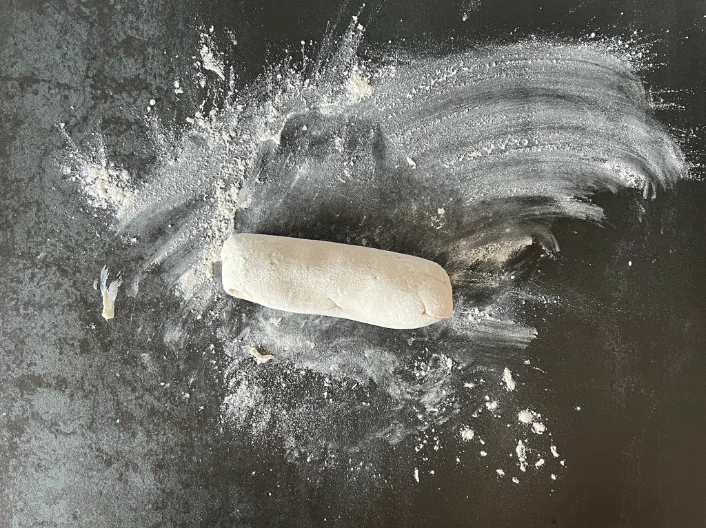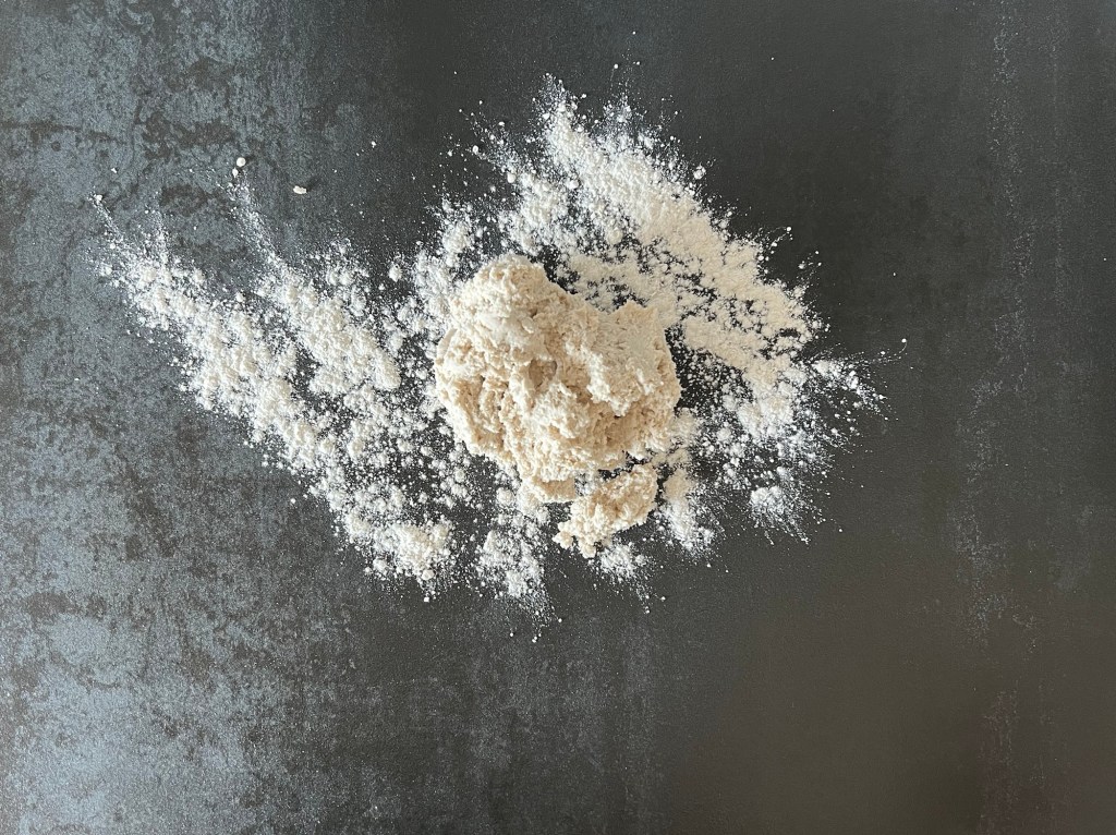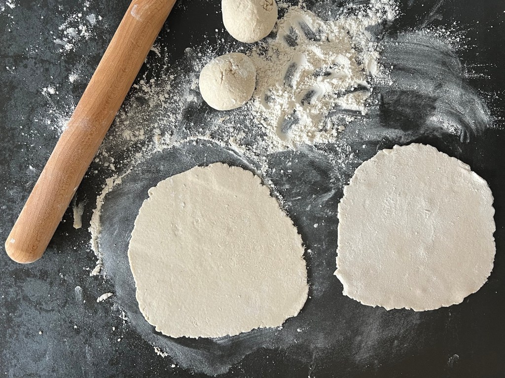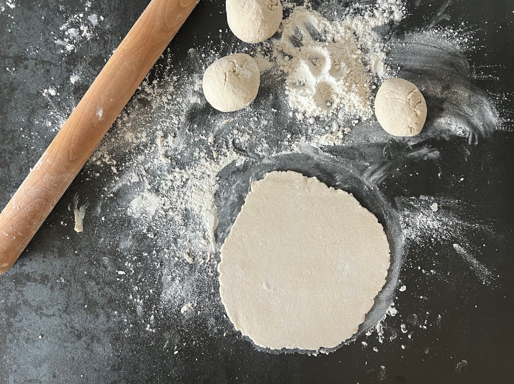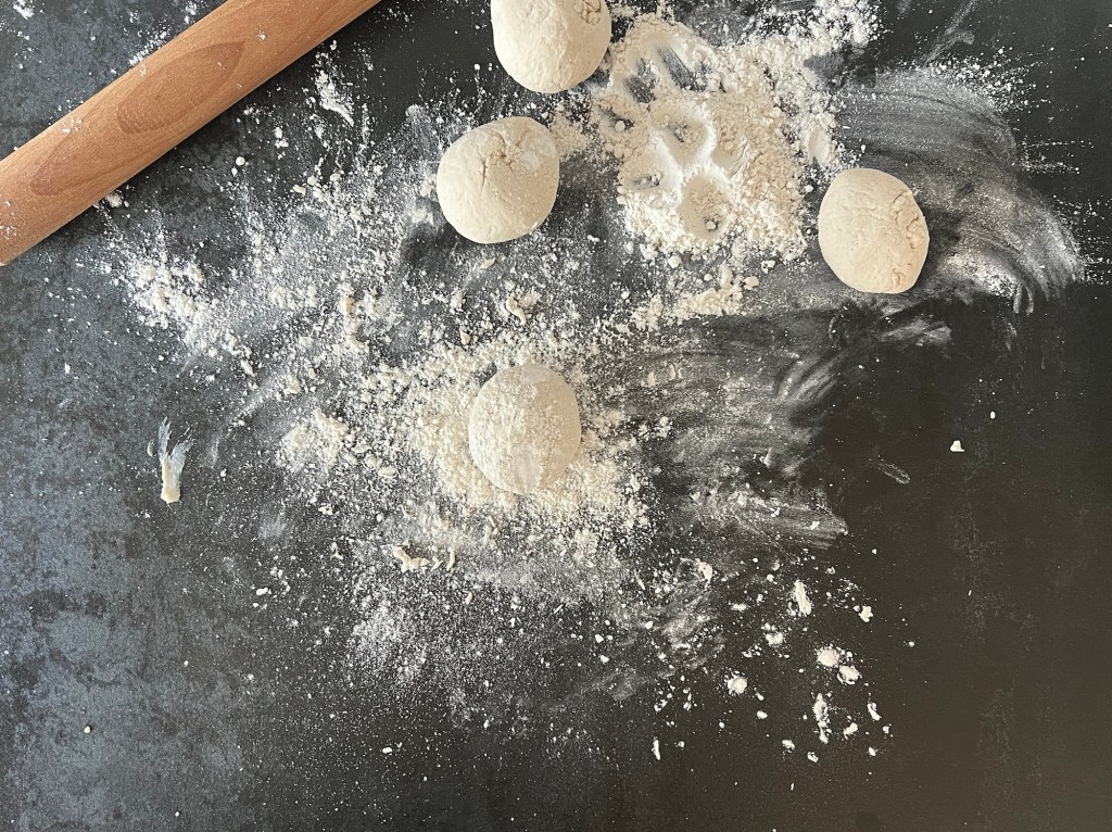 När jag blandat samman degen tar jag upp den på en mjölad bänk. Sen arbetar jag samman den i mjöl och rullar den till en tjock korv. Delar den i fyra stycken lika stora bitar som jag rullar till bollar och kavlar ut till 2-3mm tunna plattor.
