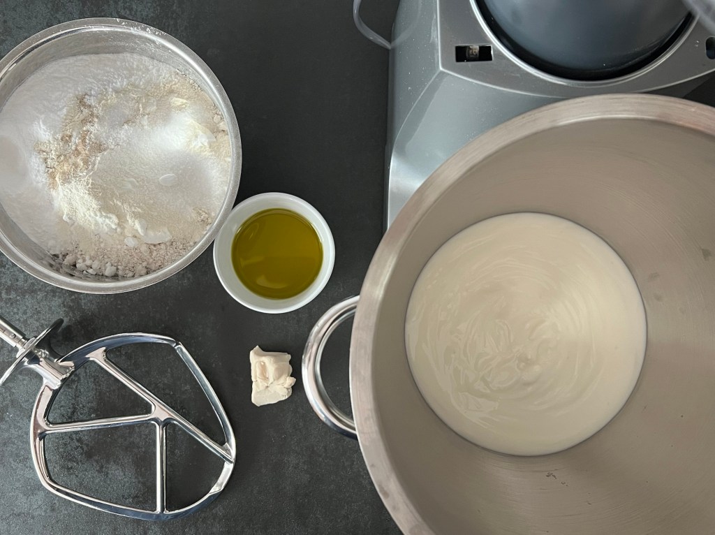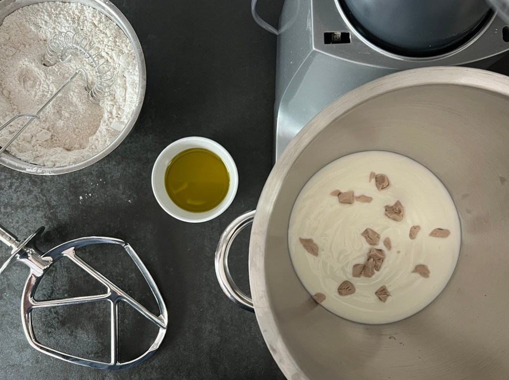 Först väger jag upp alla ingredienser. Blandar de torra till en mjölmix och löser sedan upp jästen i den kalla yoghurten.