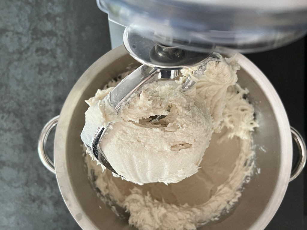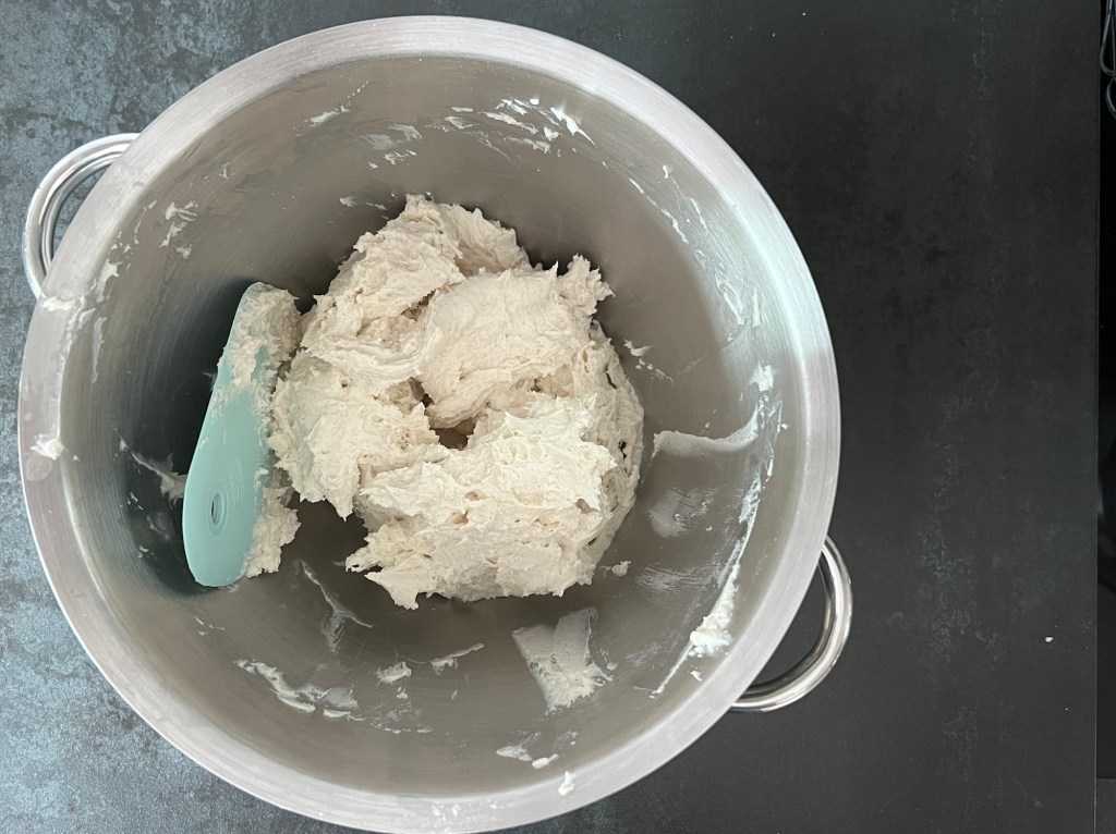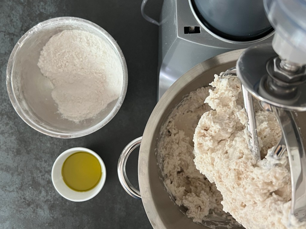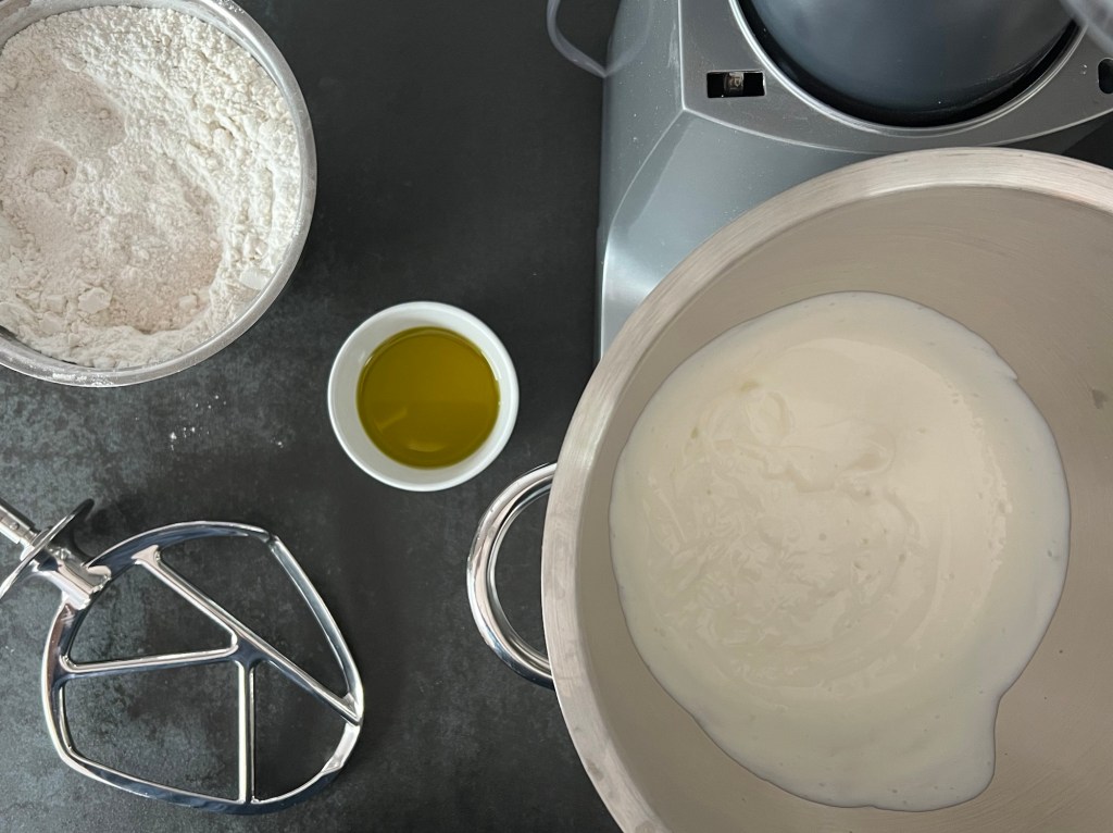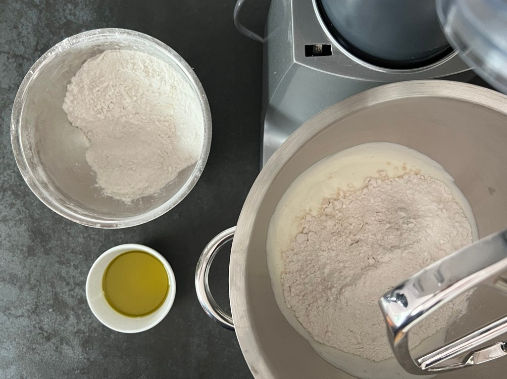 Tillsätter hälften av mixen i yoghurten och blandar samman. Sen tillsätter jag resten av mjölet och olivoljan och blandar på medelfart i ca 4min.