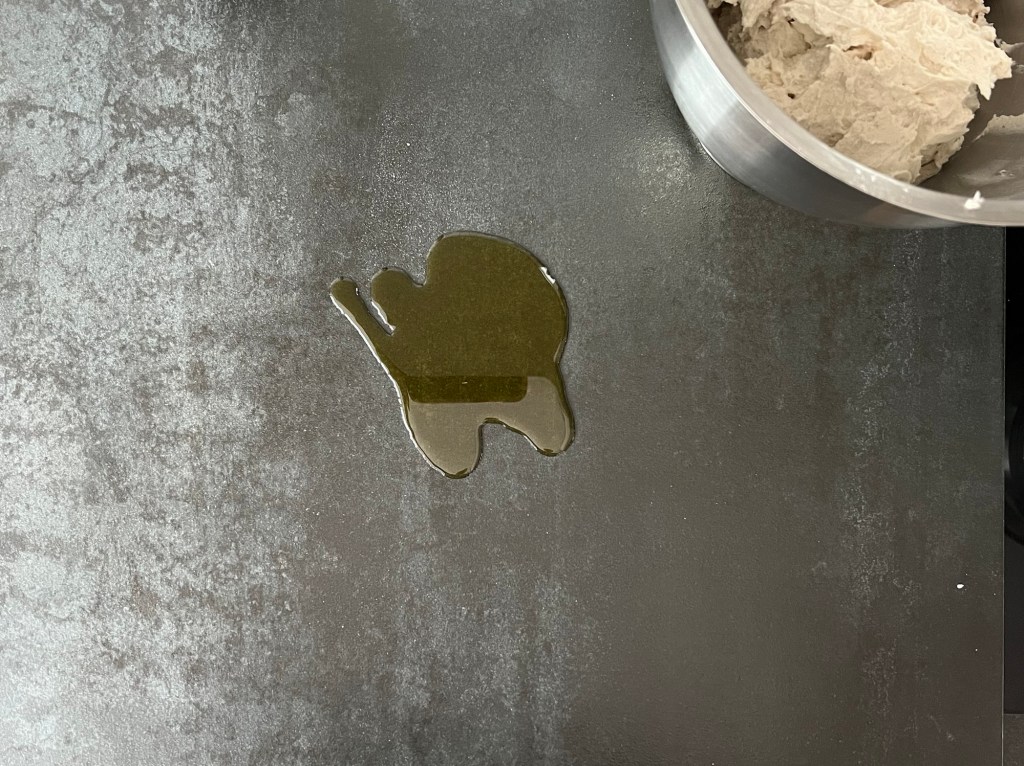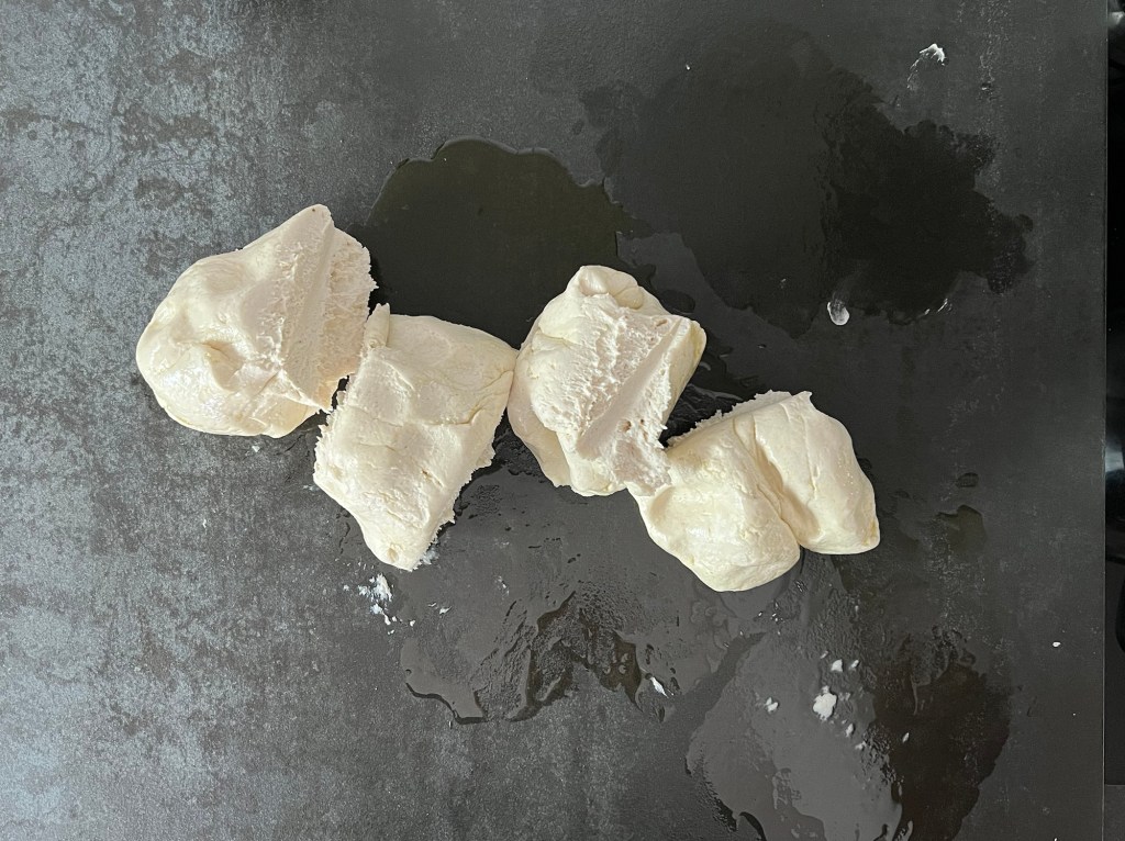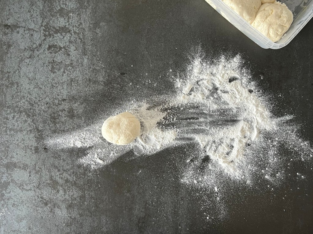Jag häller lite olivolja på bänken och tar upp degen på oljan. Delar degen i 9st lika stora bitar, ca 65-70g styck. Rullar de jämna med oljade händer och lägger i en burk. Stänger locket och låter de jäsa framme i 1-2h. Man kan även kalljäsa dem i kylen över natten.