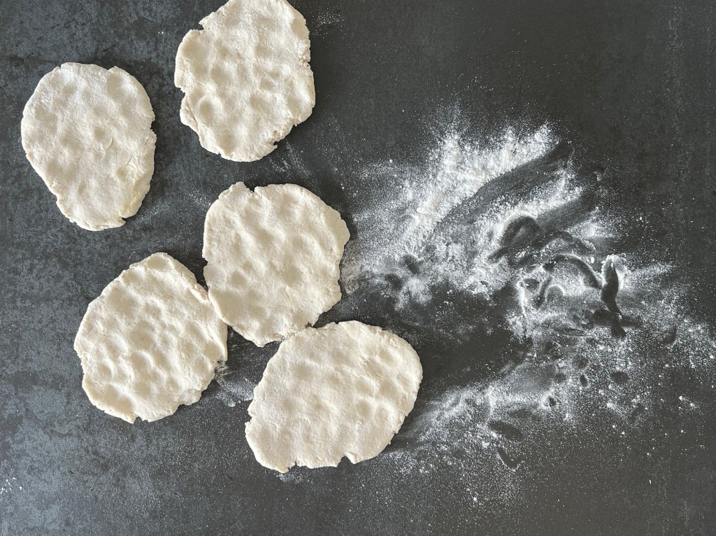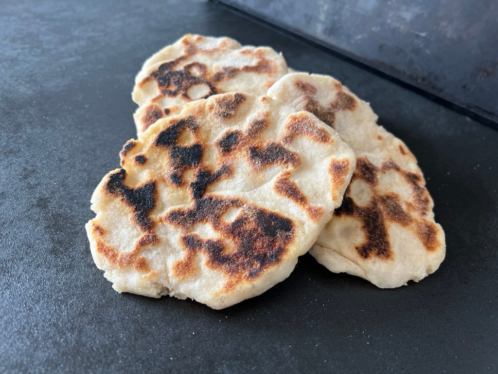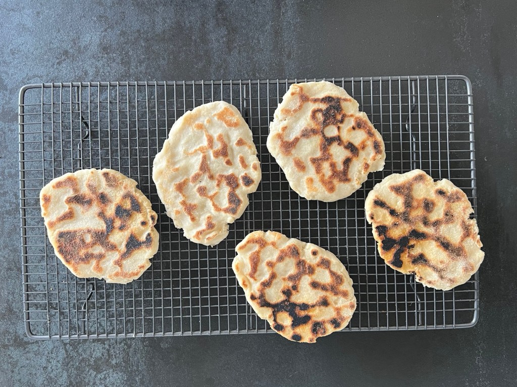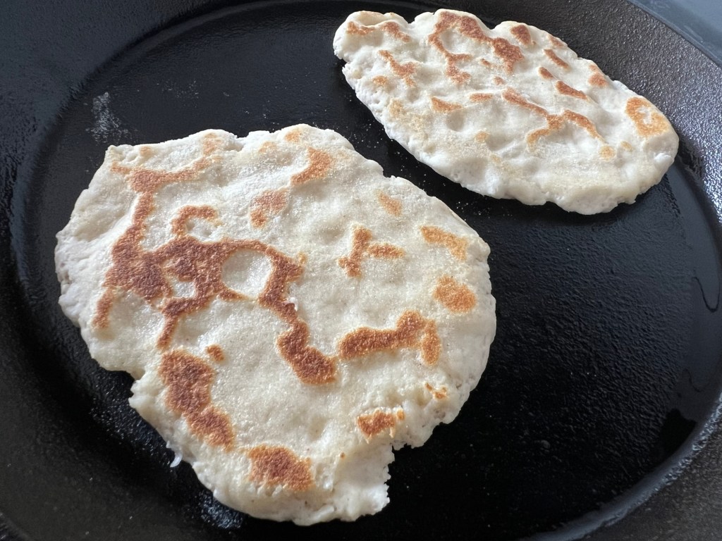 På mjölad bänk plattar jag ut dem med fingertopparna till tunna ovala bröd, ca 10-12cm o diameter. Bröden gräddar jag sedan i torr panna, gärna gjutjärn, på medelvärme ca 2-3min per sida tills de är gyllenbruna på båda sidorna.