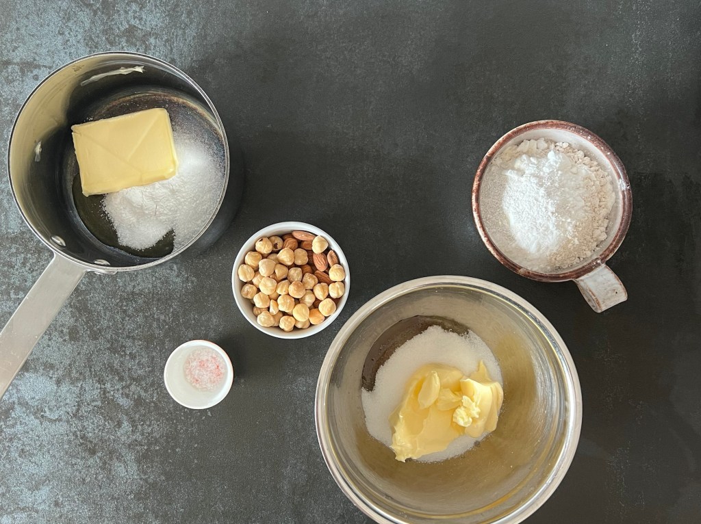 Hackar nötterna till toscan och kokar upp socker, sirap, mjöl, mjölk och smör. Sjuder en minut och vispar sedan ner de hackade nötterna och flingsaltet.