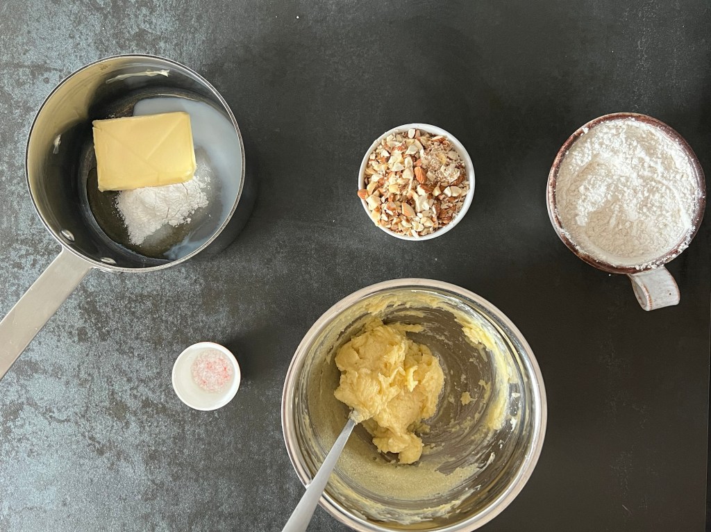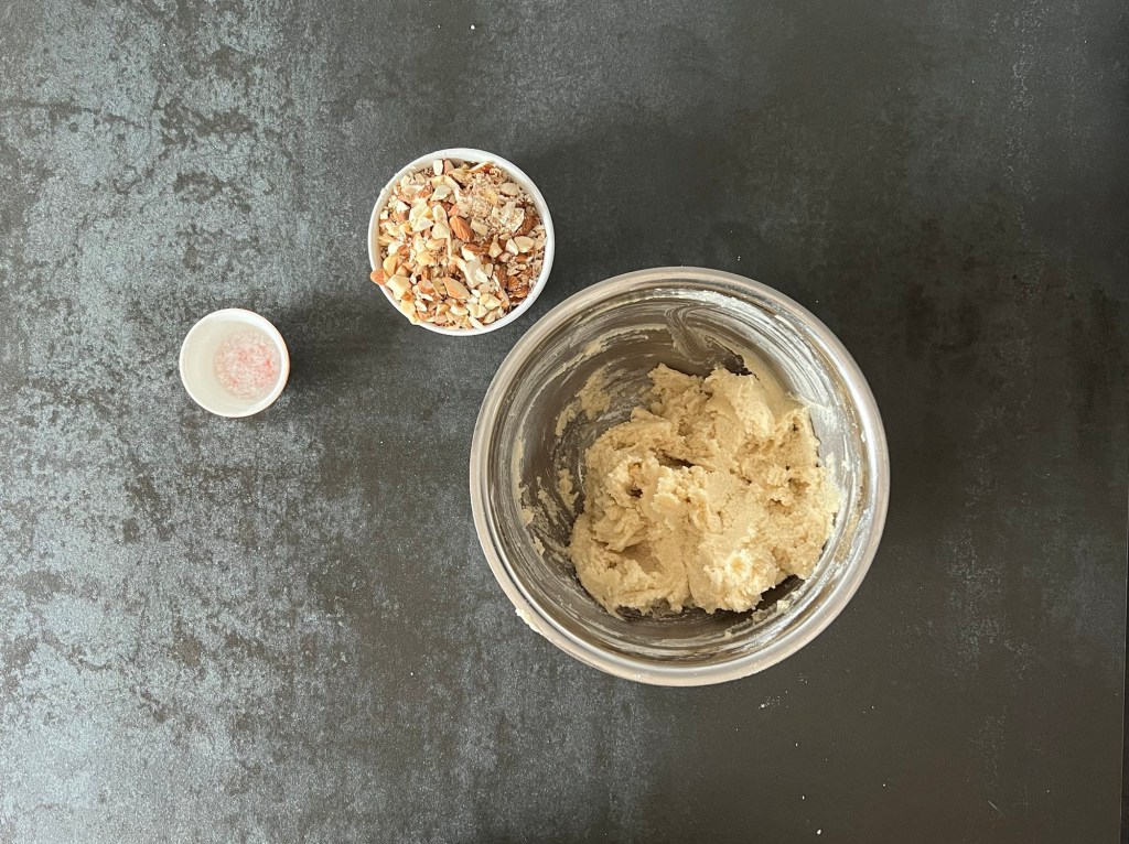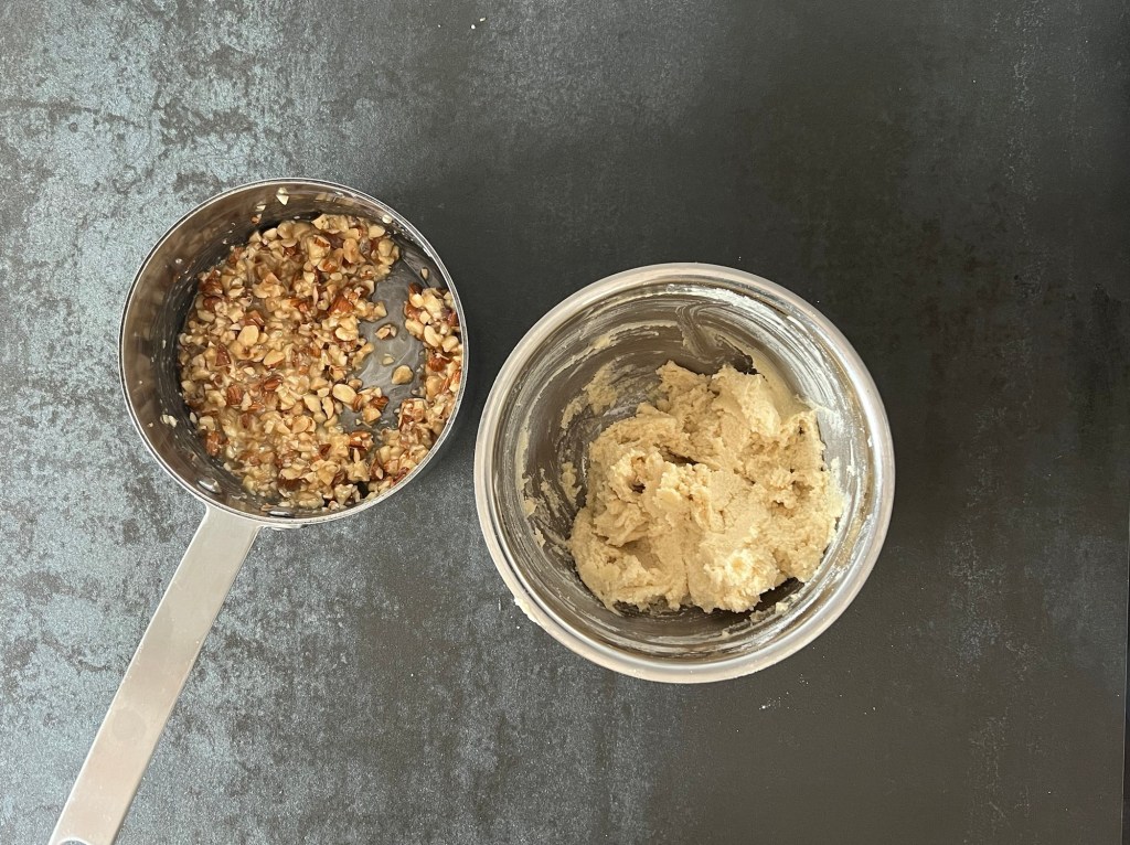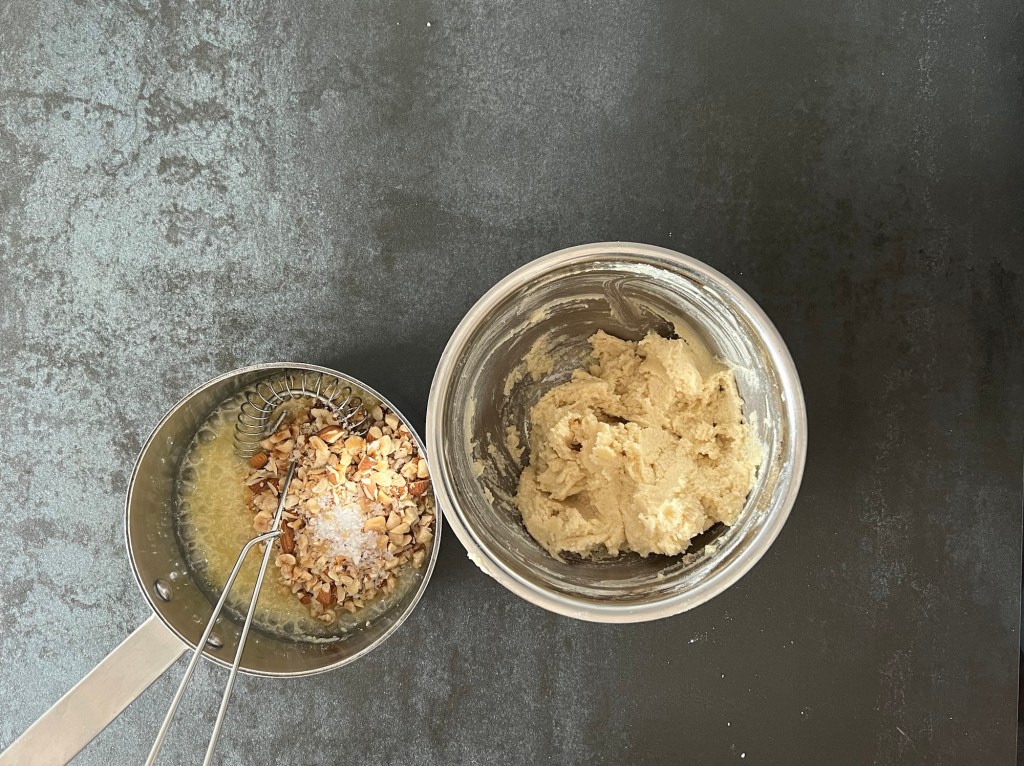 Jag börjar med att blanda degen och förbereda toscan. Smör, sirap och socker till degen väger jag upp i en bunke. Och de torra ingredienserna för sig i en skål. Sen blandar jag smör, socker och sirap med en gaffel.