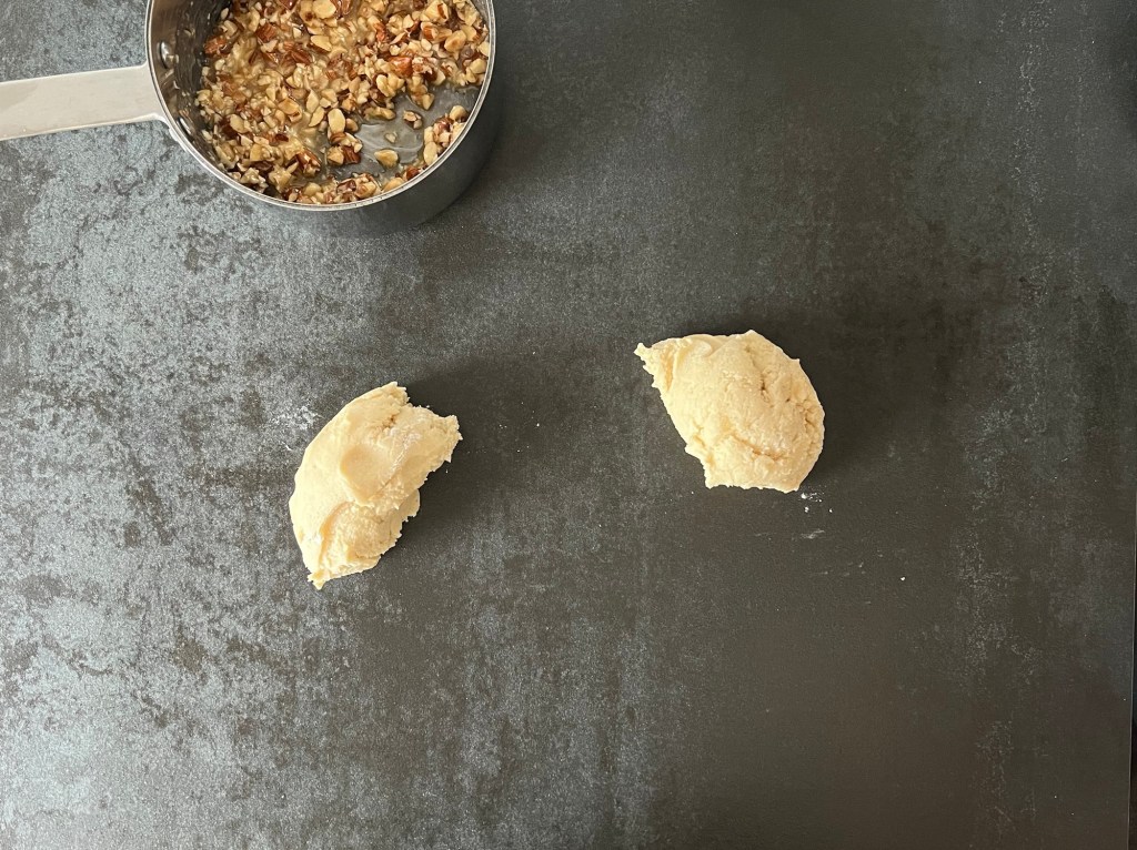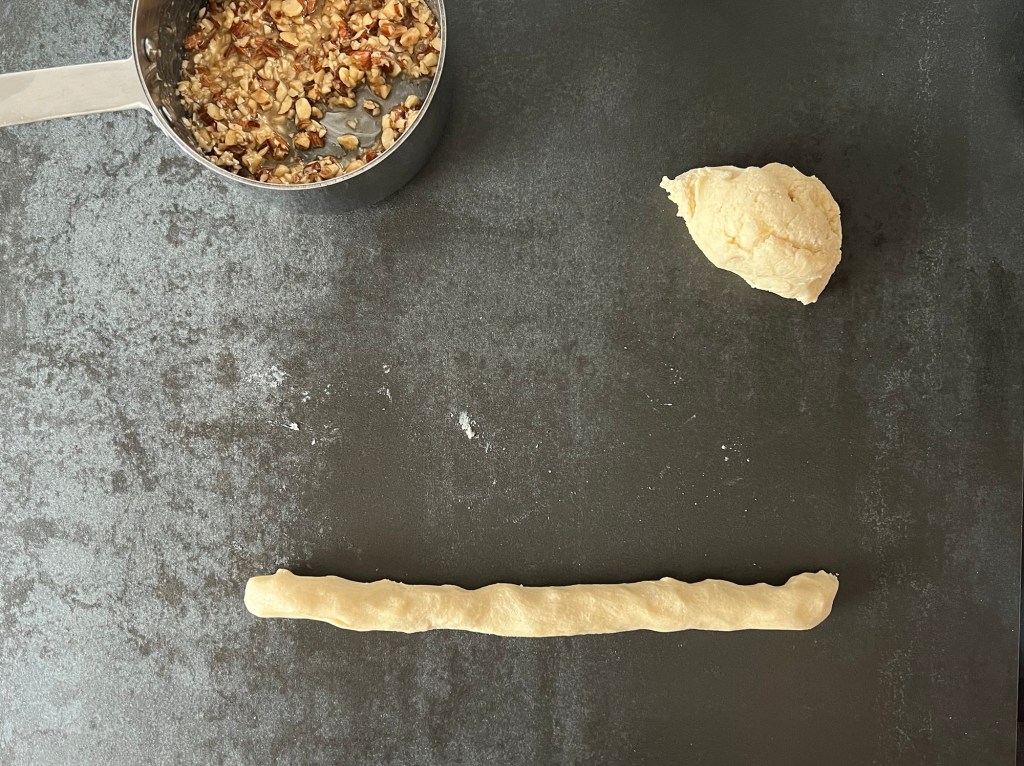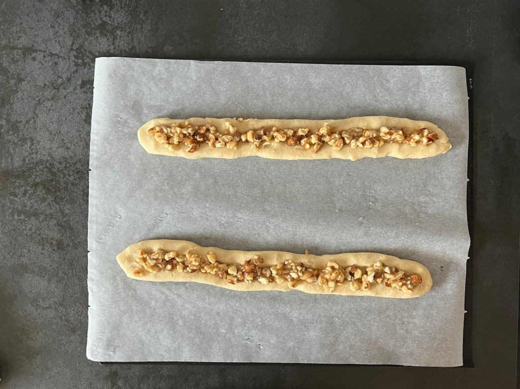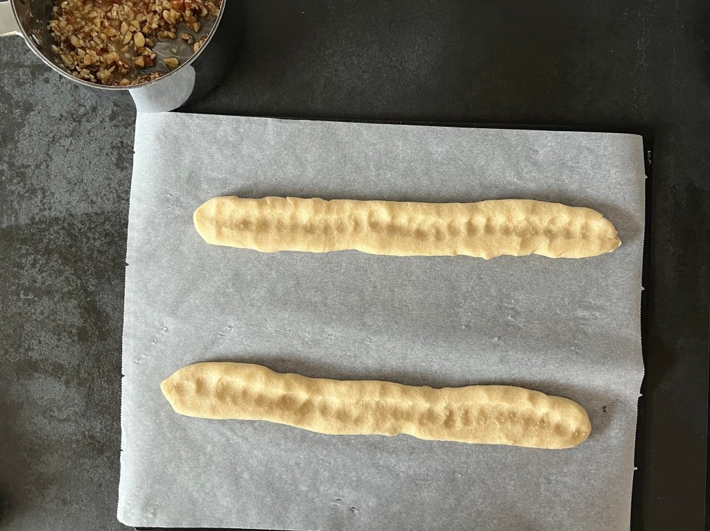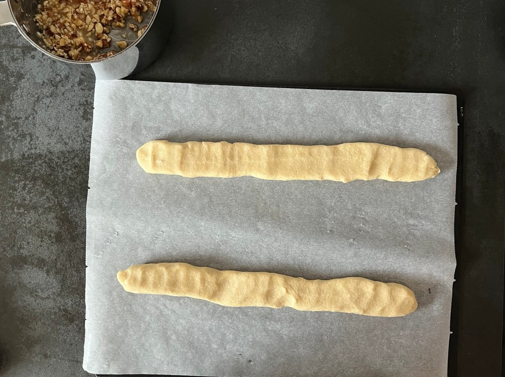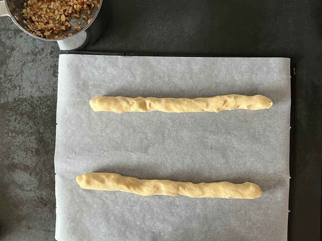 Väger upp degen i 4st lika stora bitar som jag rullar ut till jämntjocka korvar. Lägger 2st per plåt och plattar ut dem med fingrarna. Gör en fördjupning i mitten på rullarna och fördelar toscasmeten i den.