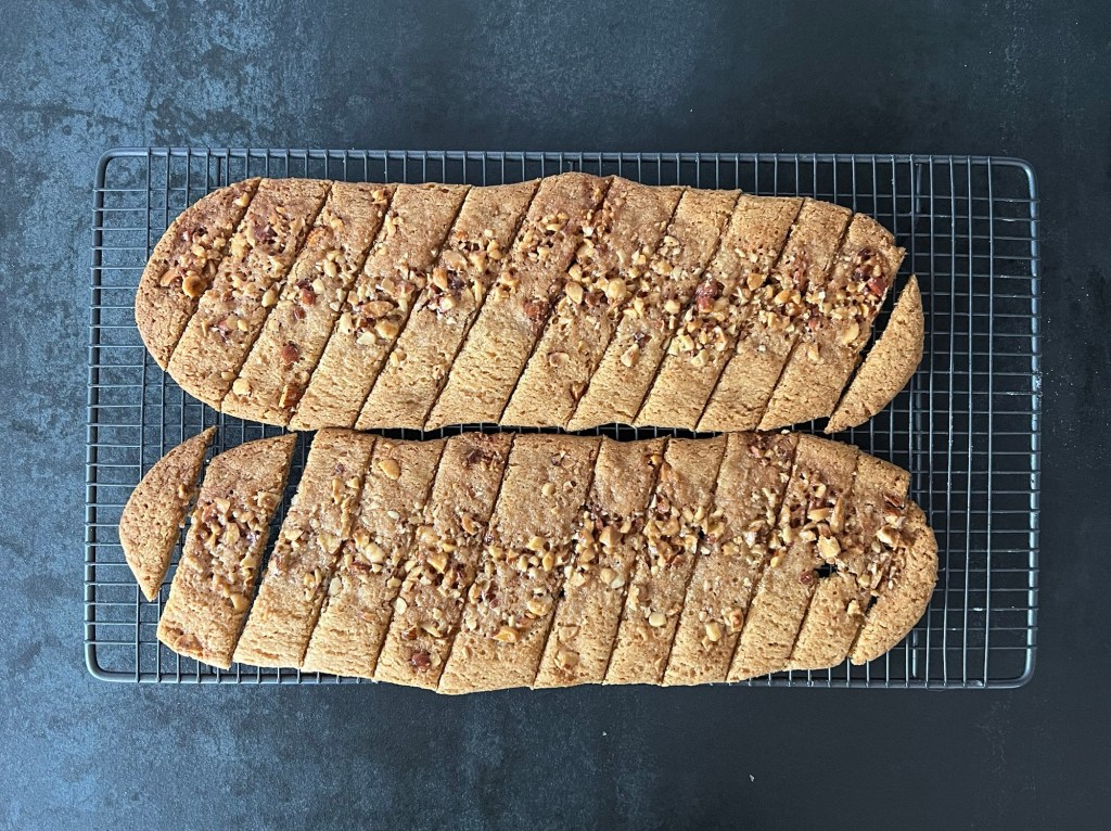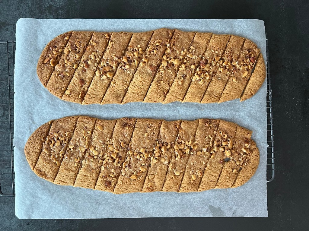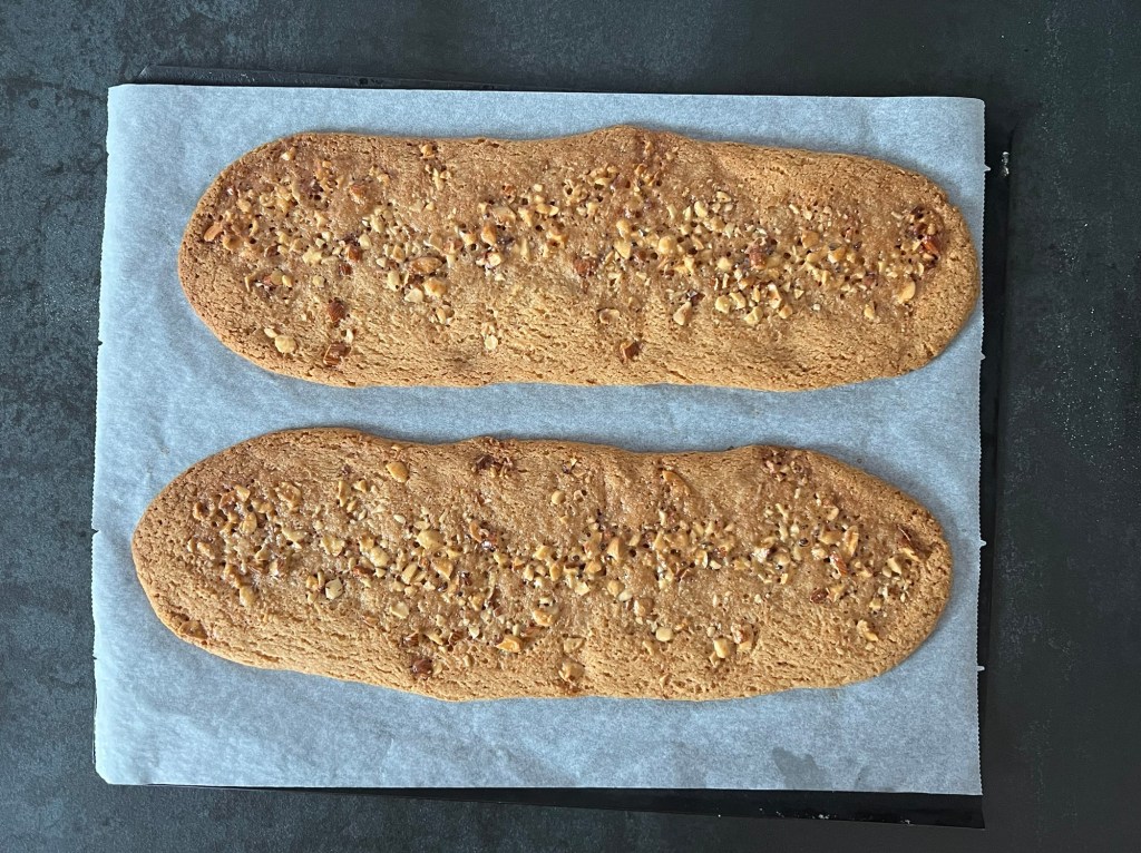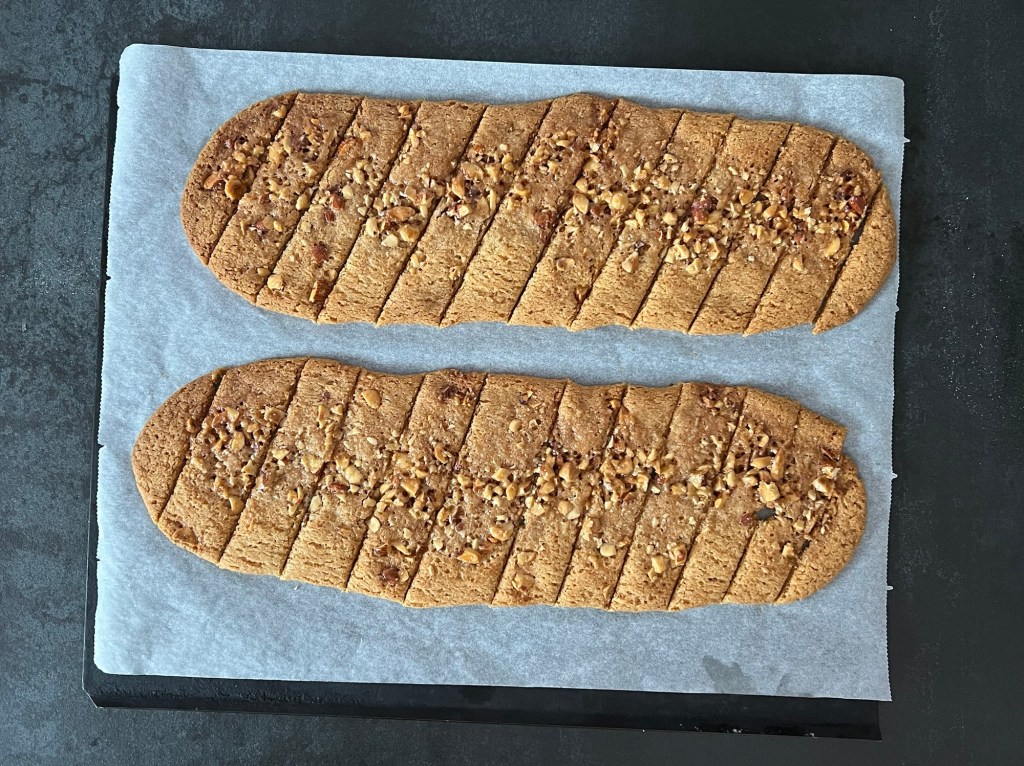 När de kommer ut ur ugnen så får de vila 2-3min på den varma plåten, innan jag skär dem. Efter att jag skurit dem så flyttar jag pappret till ett galler en stund och när de svalnat ca 15min så tar jag bort pappret och låter dem svalna utan. När de väl kallnat och stelnat så förvarar jag dem i en tät burk.